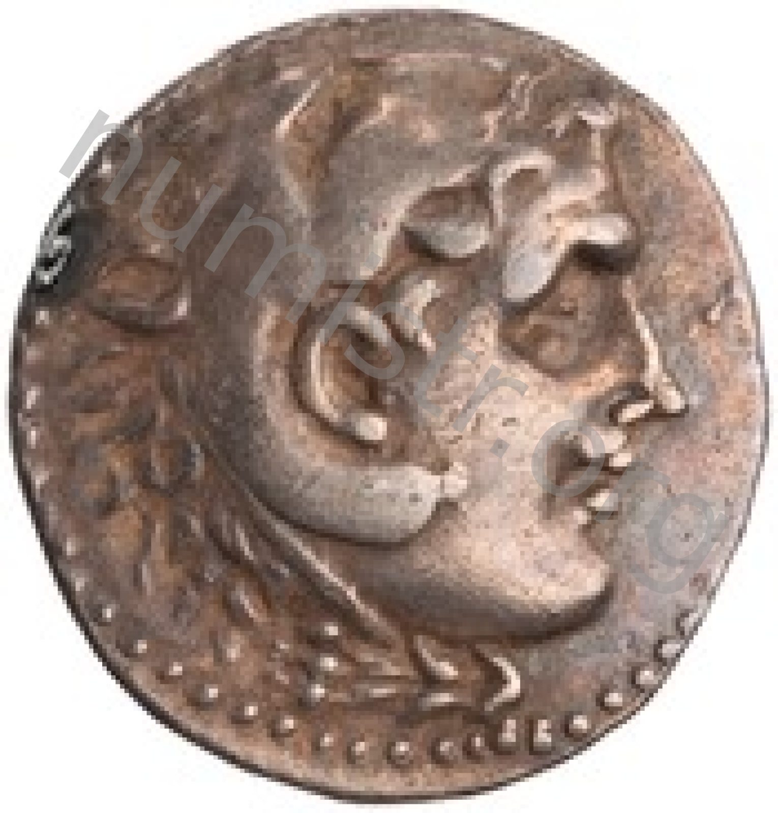 Head of beardless Heracles right wearing lion skin headdress -[en]