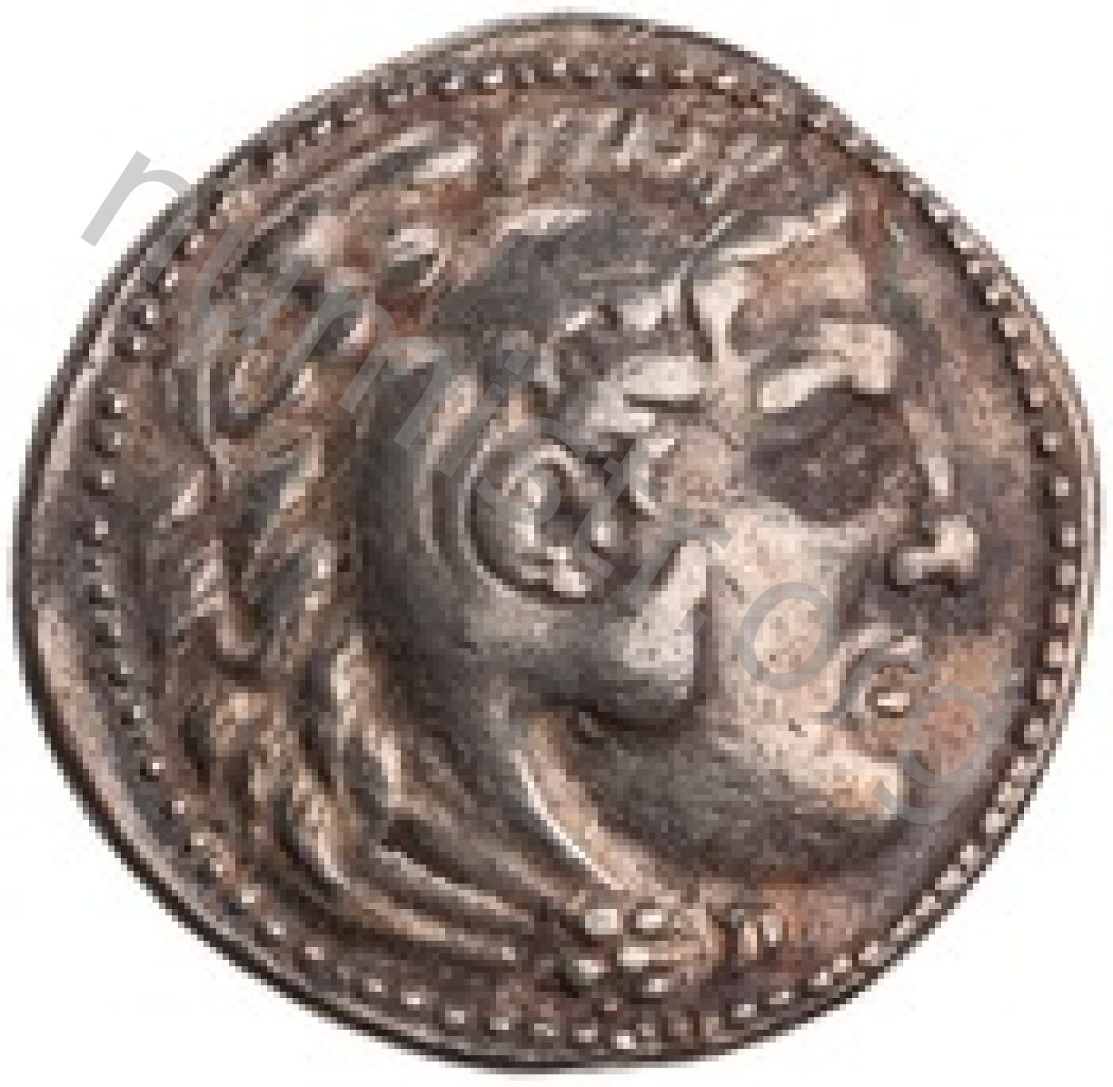 Head of beardless Heracles right wearing lion skin headdress -[en]