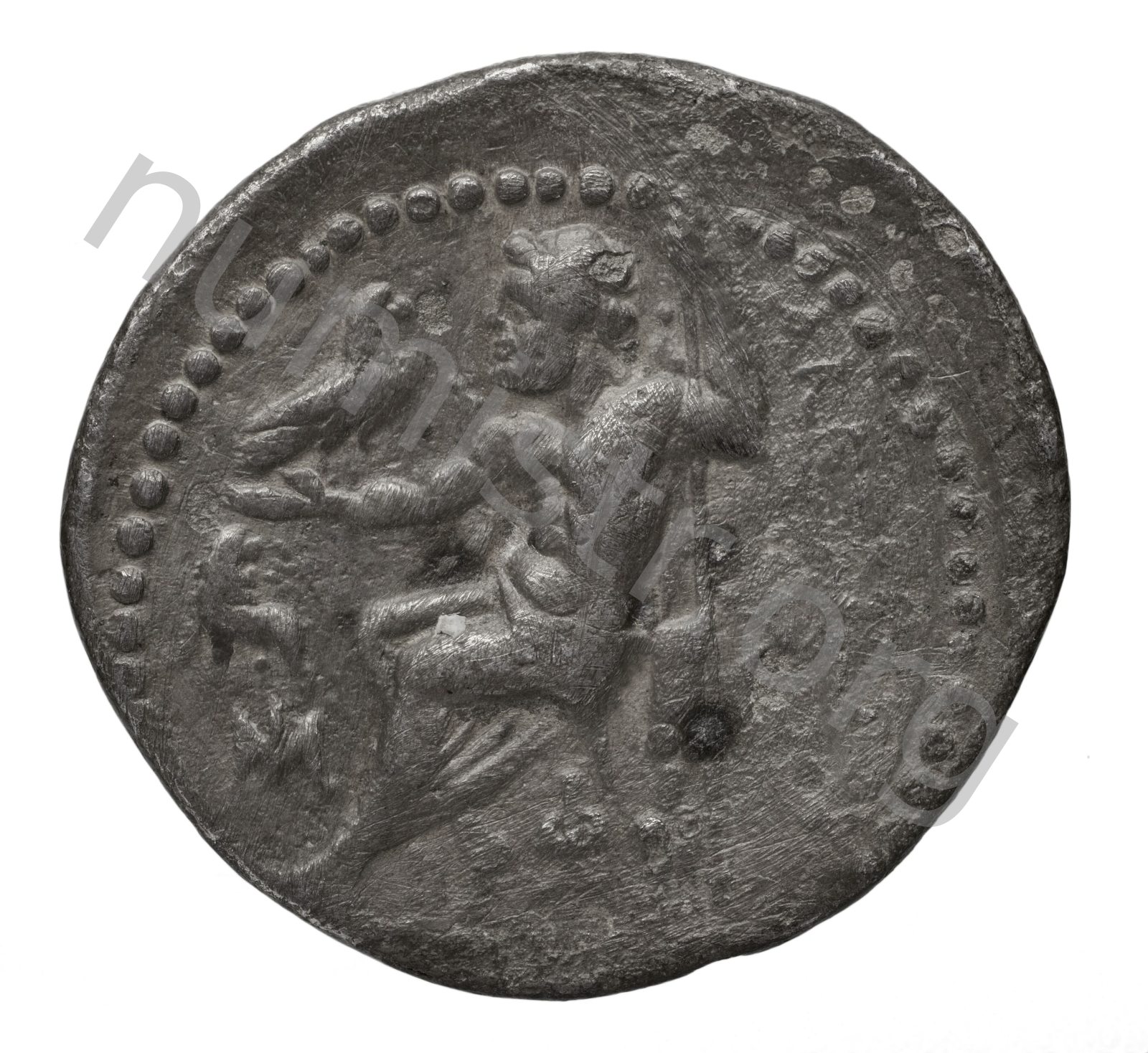 Zeus tabure-tahtta oturuyor sol elinde kartal sağ elinde asa var.