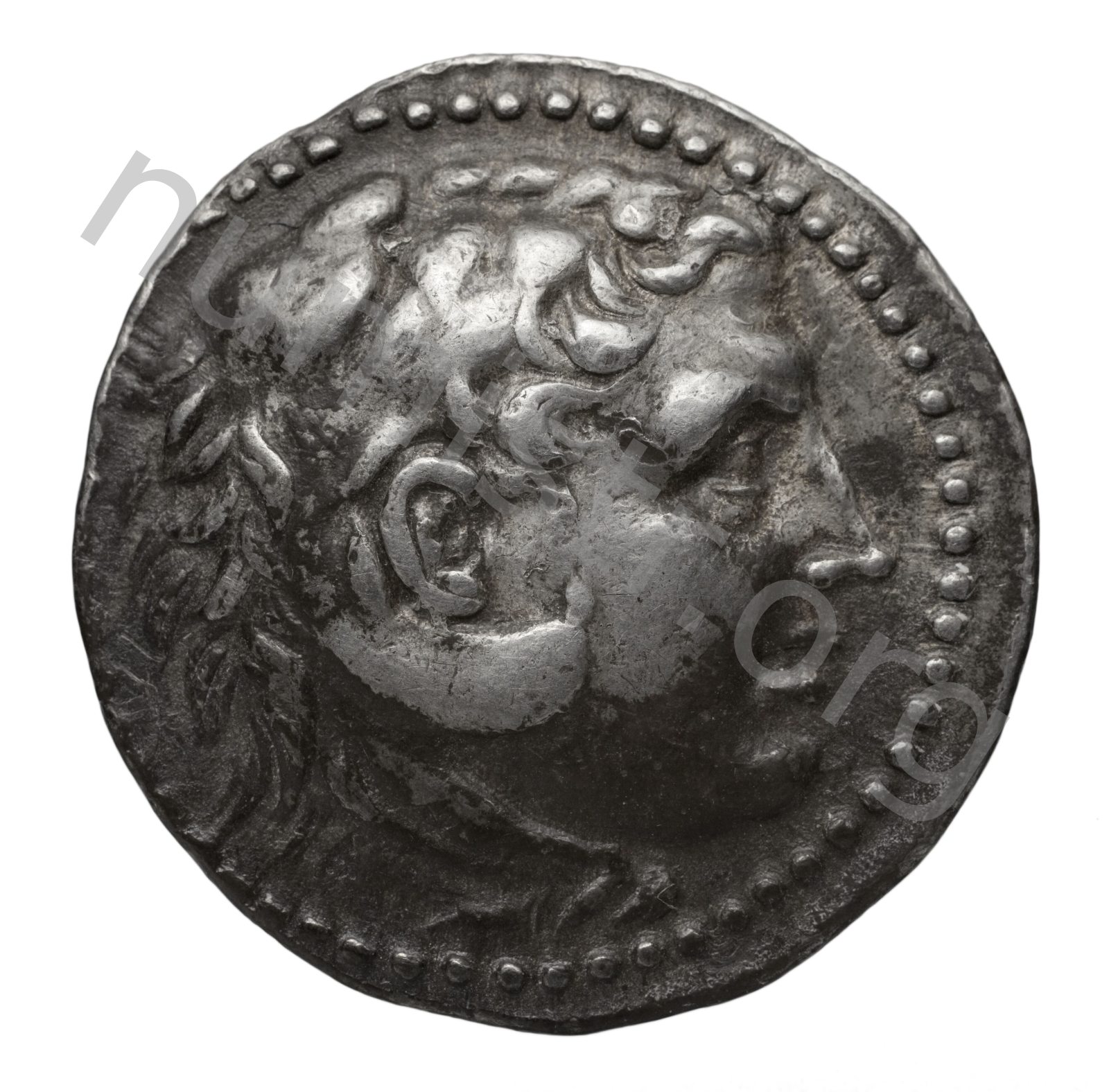 Head of beardless Heracles right wearing lion skin headdress -[en]