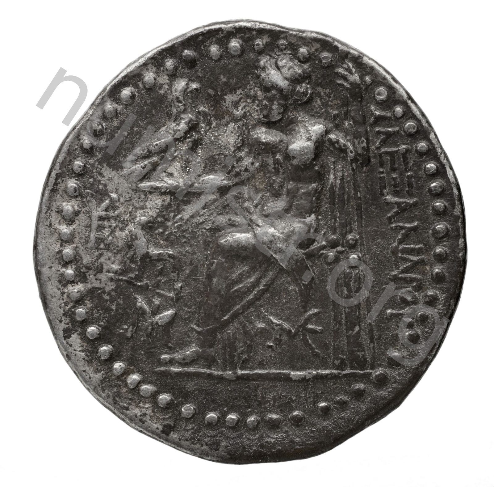 Zeus seated on stool-throne left eagle on outstretched right hand sceptre in left hand -[en]