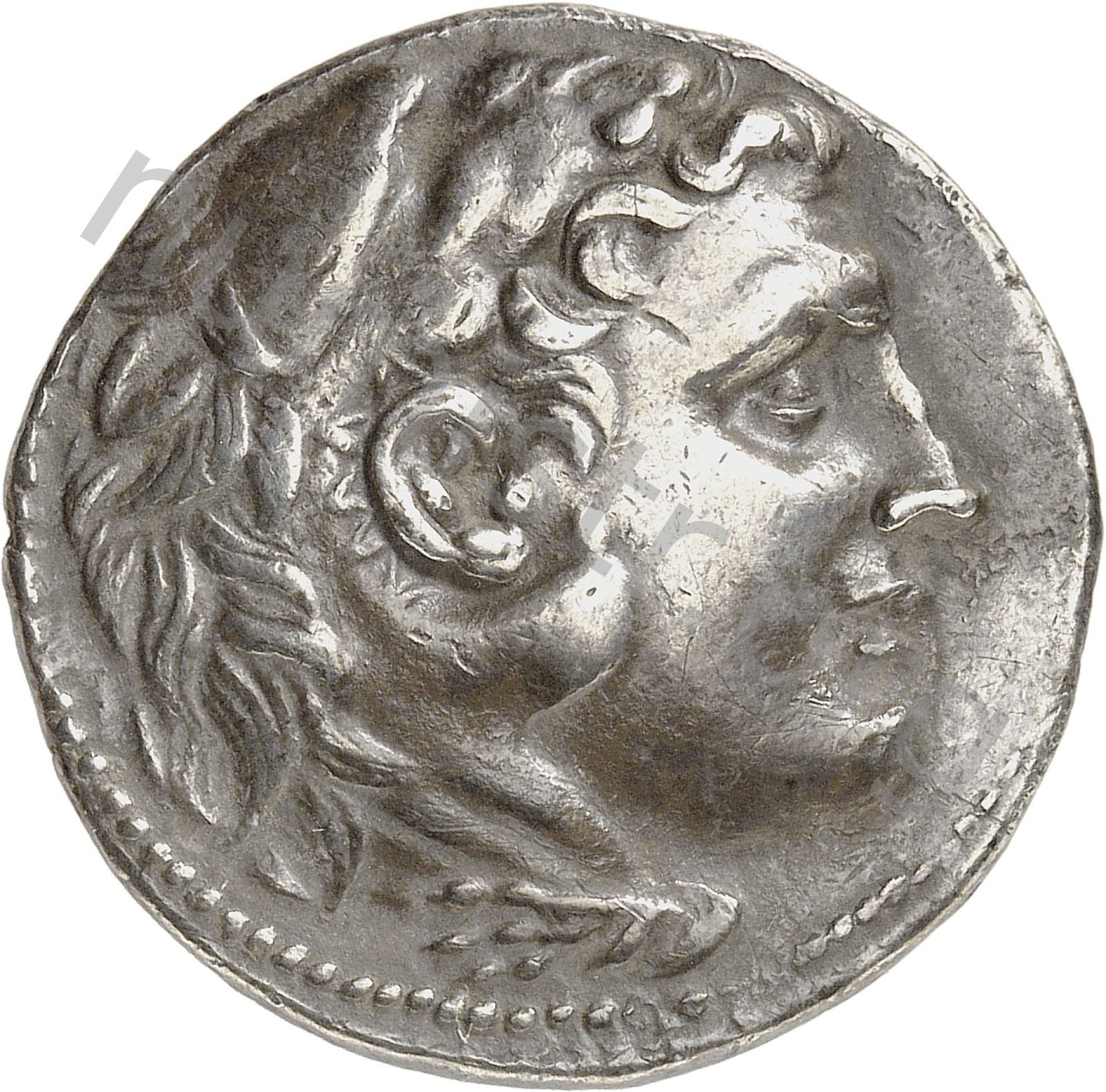 Head of beardless Heracles right wearing lion skin headdress -[en]