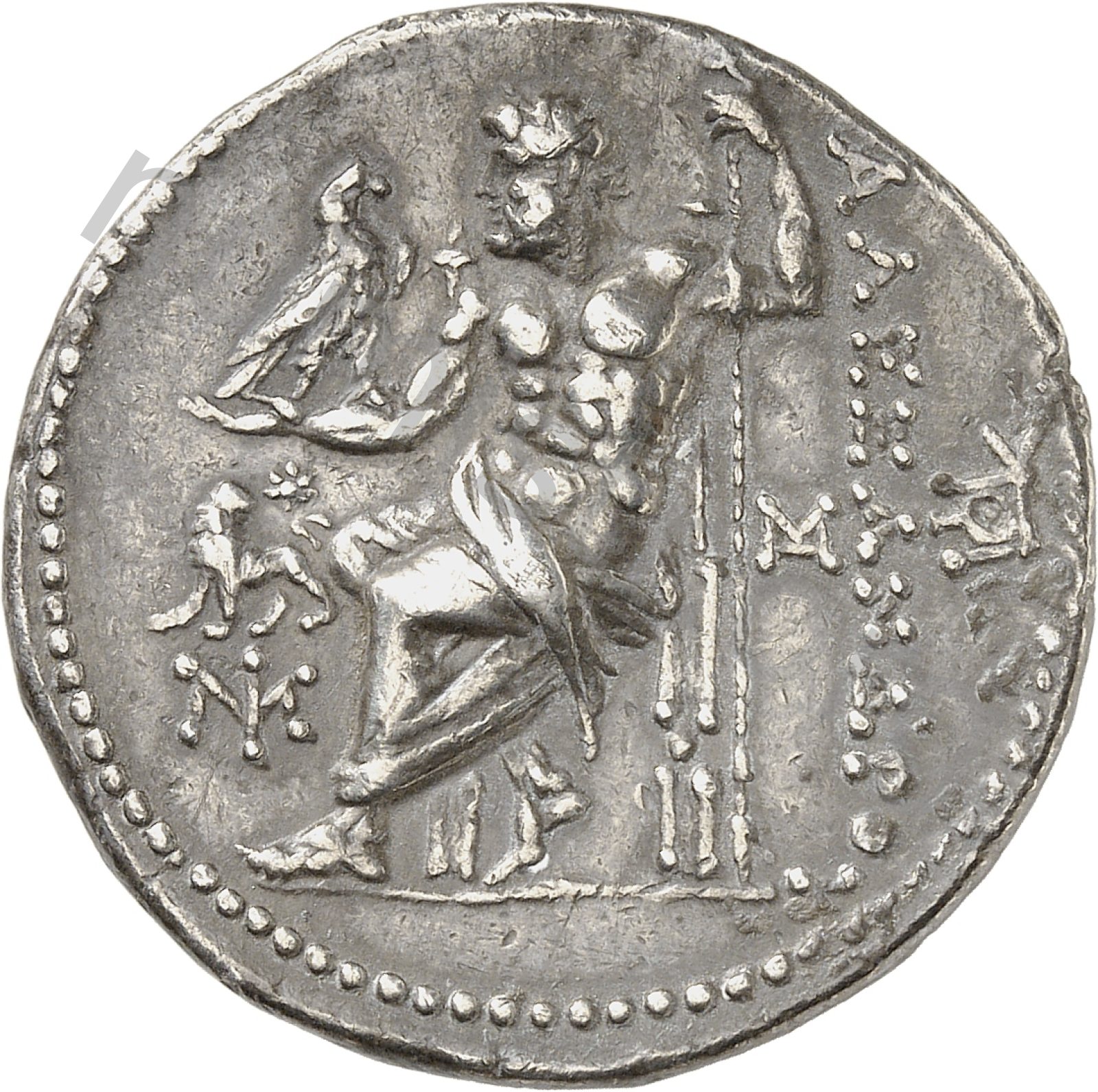 Zeus seated on stool-throne left eagle on outstretched right hand sceptre in left hand -[en]