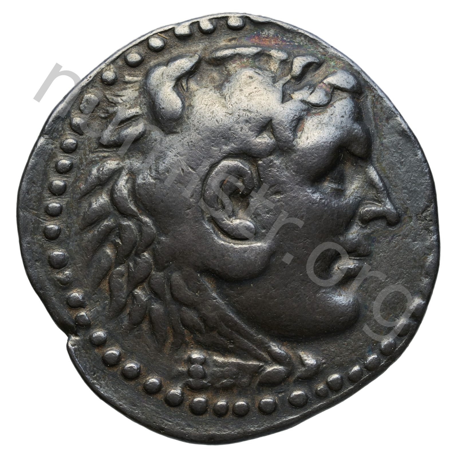 Head of beardless Heracles right wearing lion skin headdress -[en]