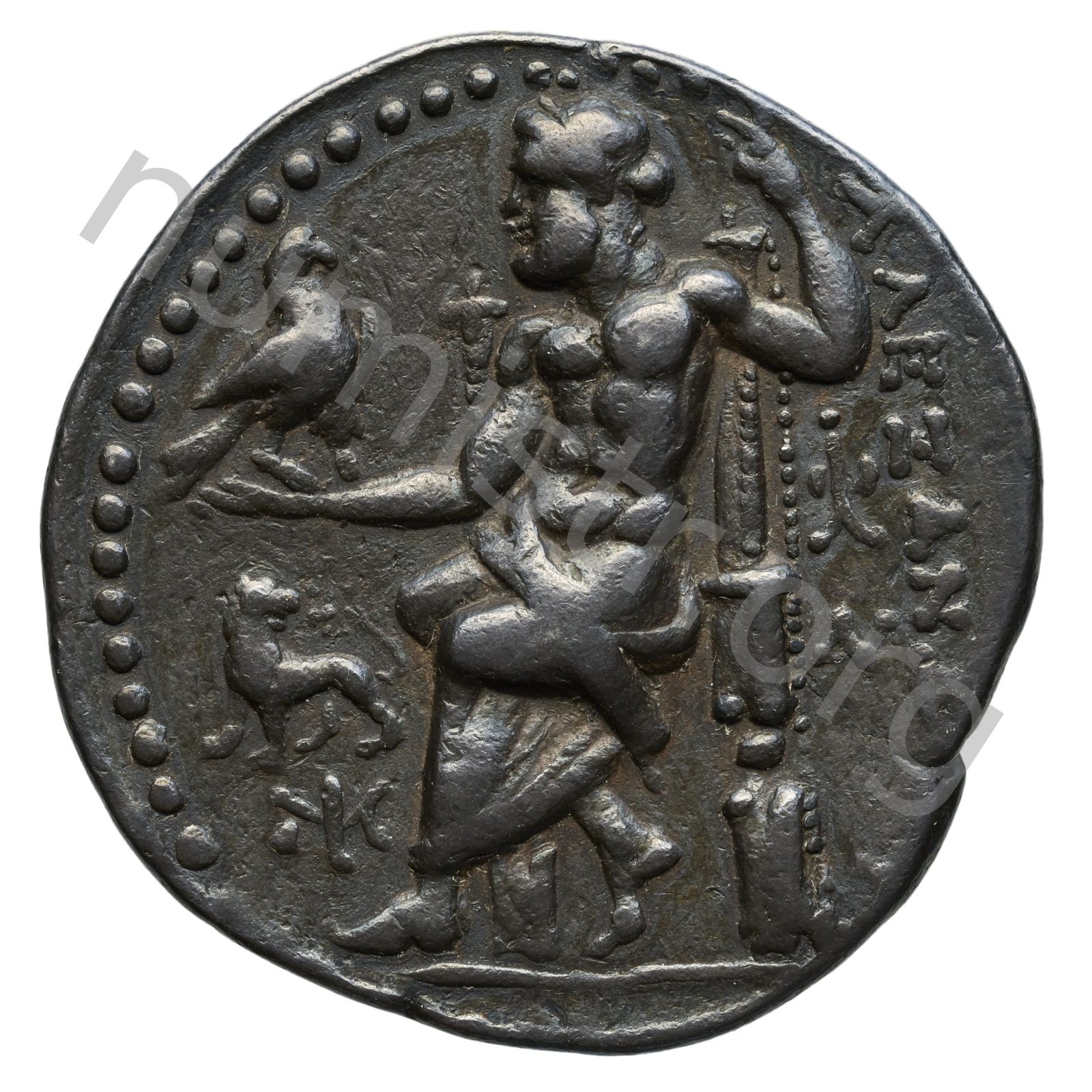 Zeus seated on stool-throne left eagle on outstretched right hand sceptre in left hand -[en]