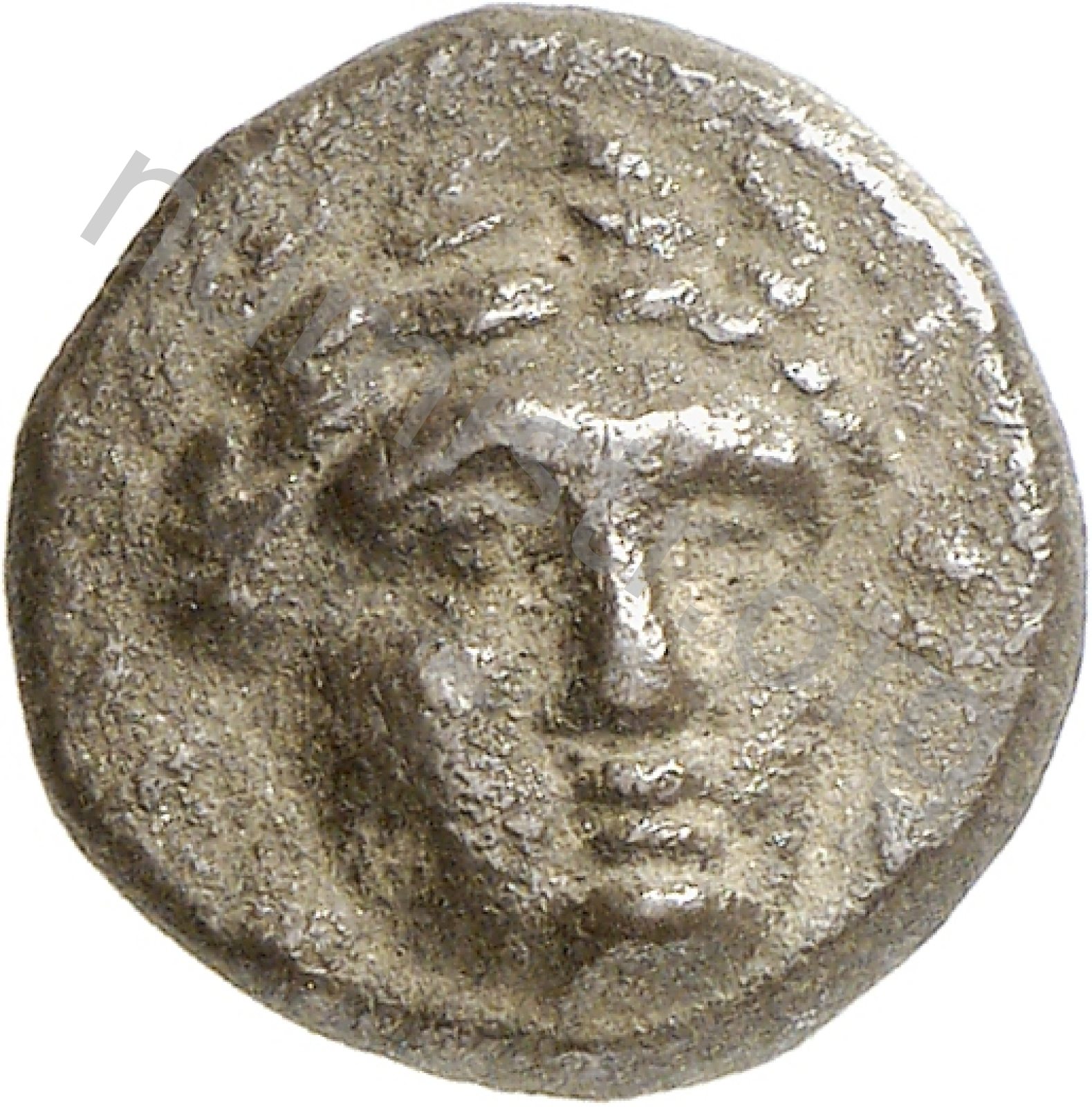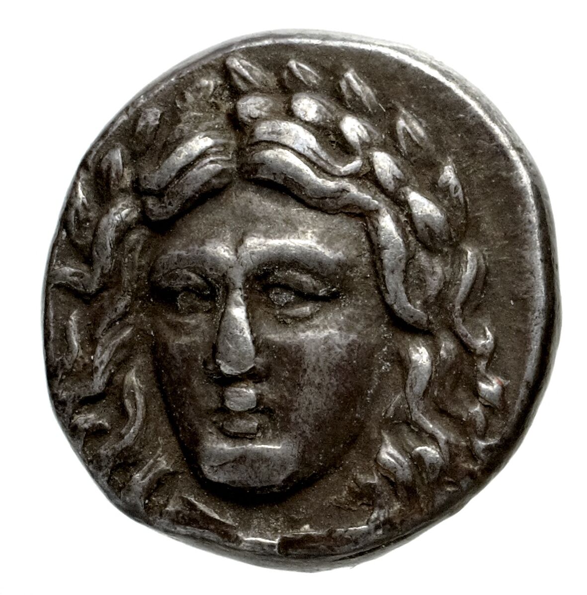 Head of Apollo three-quarters facing wearing a laurel wreath -[en]