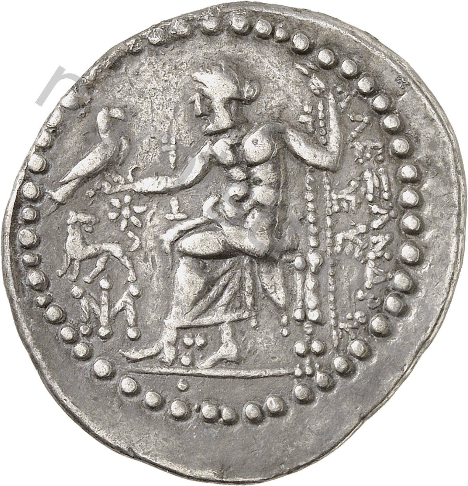 Zeus seated on stool-throne left eagle on outstretched right hand sceptre in left hand -[en]