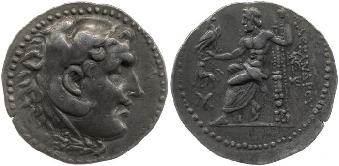 Head of beardless Heracles right wearing lion skin headdress -[en]