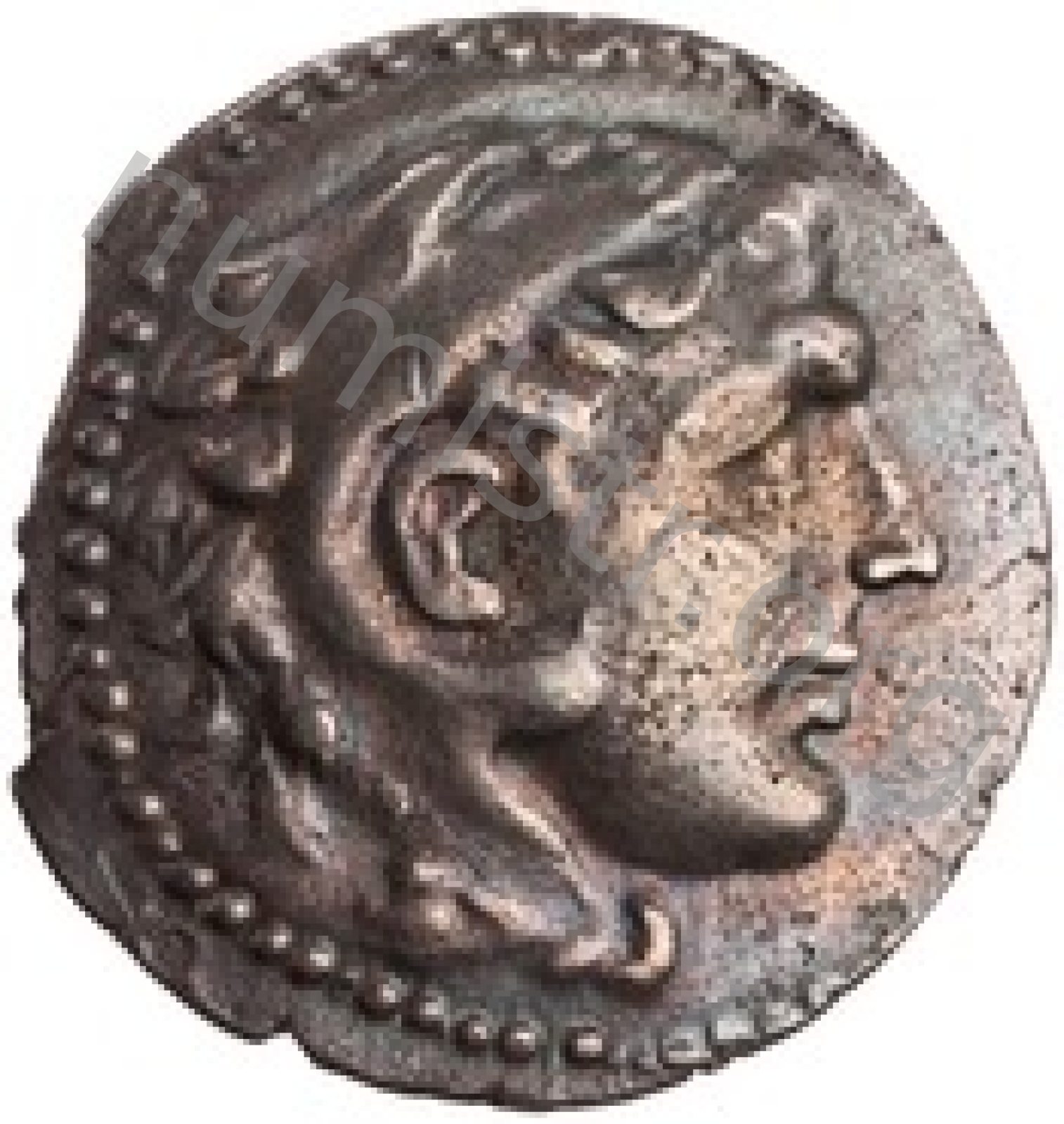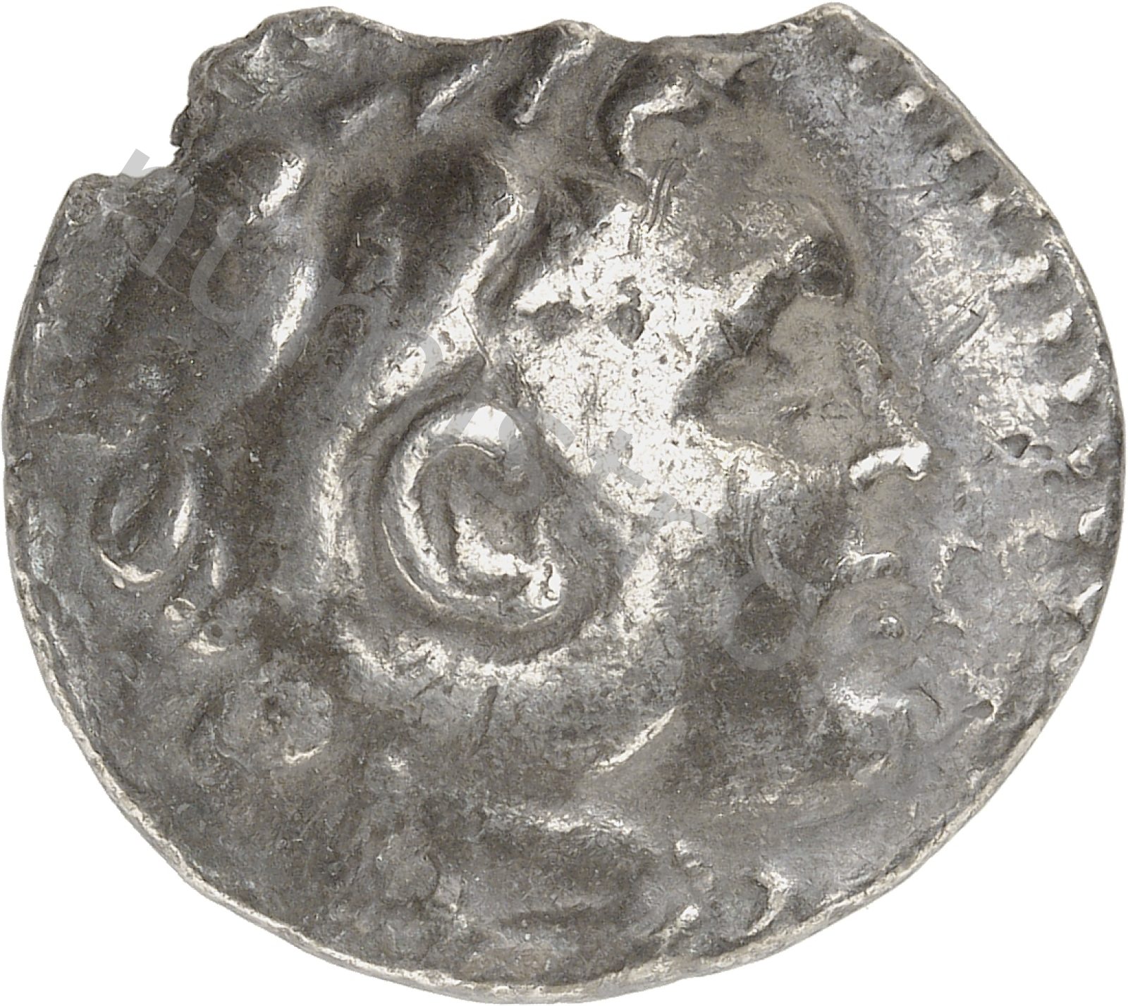 Head of beardless Heracles right wearing lion skin headdress -[en]