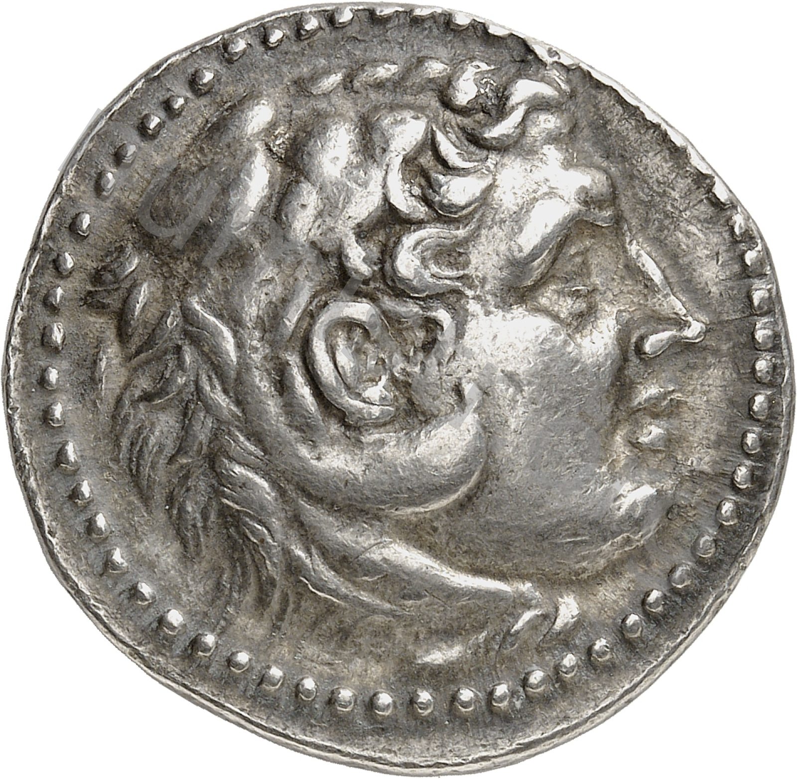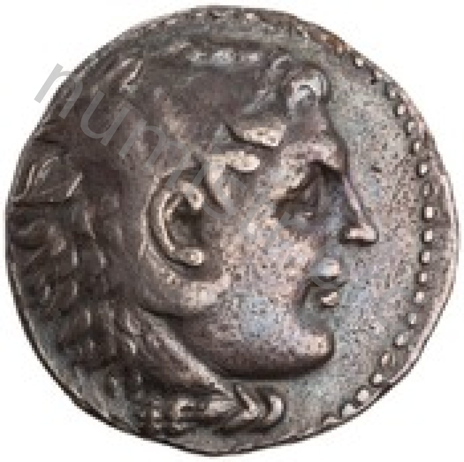 Head of beardless Heracles right wearing lion skin headdress -[en]