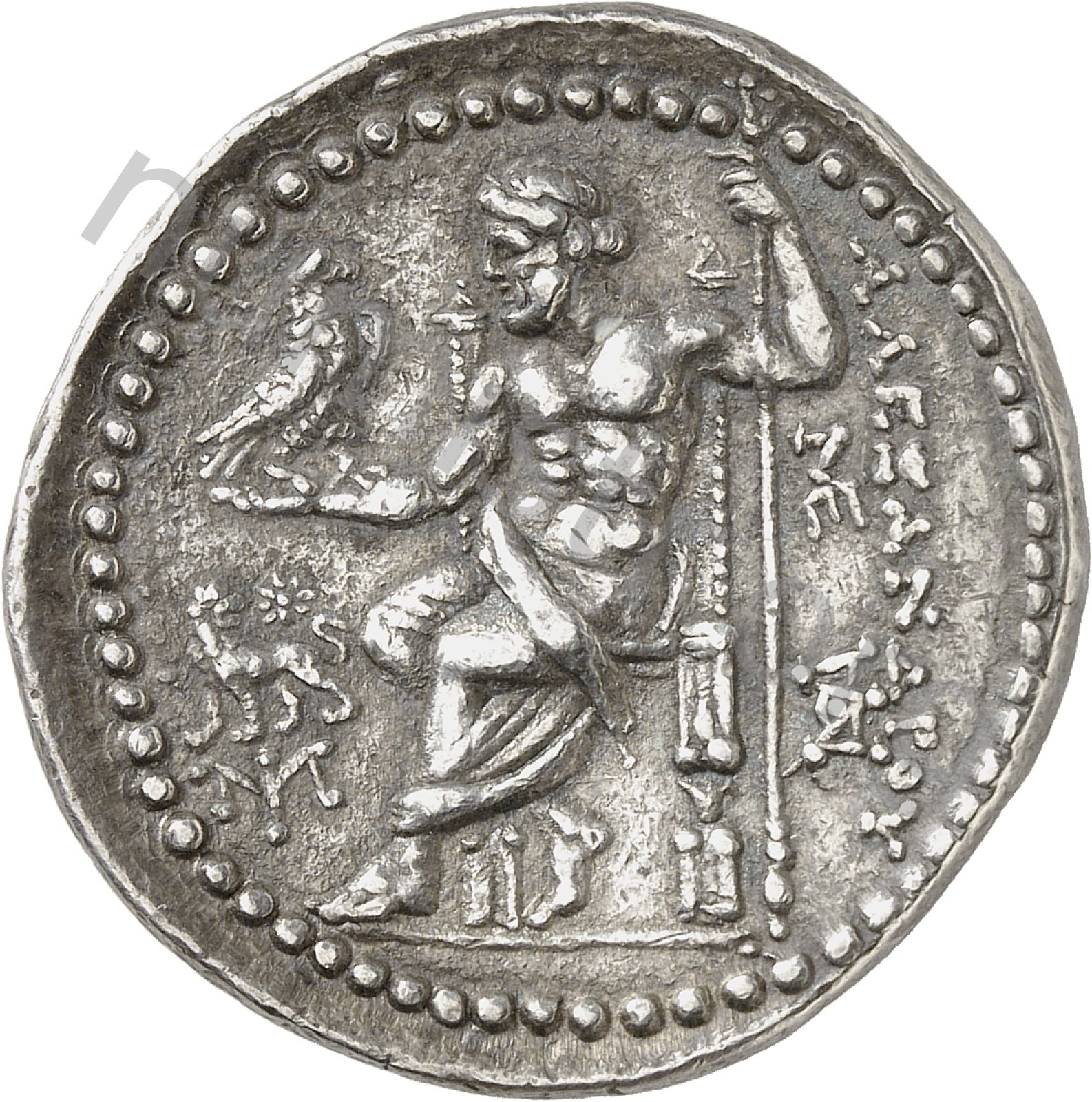 Zeus seated on stool-throne left eagle on outstretched right hand sceptre in left hand -[en]