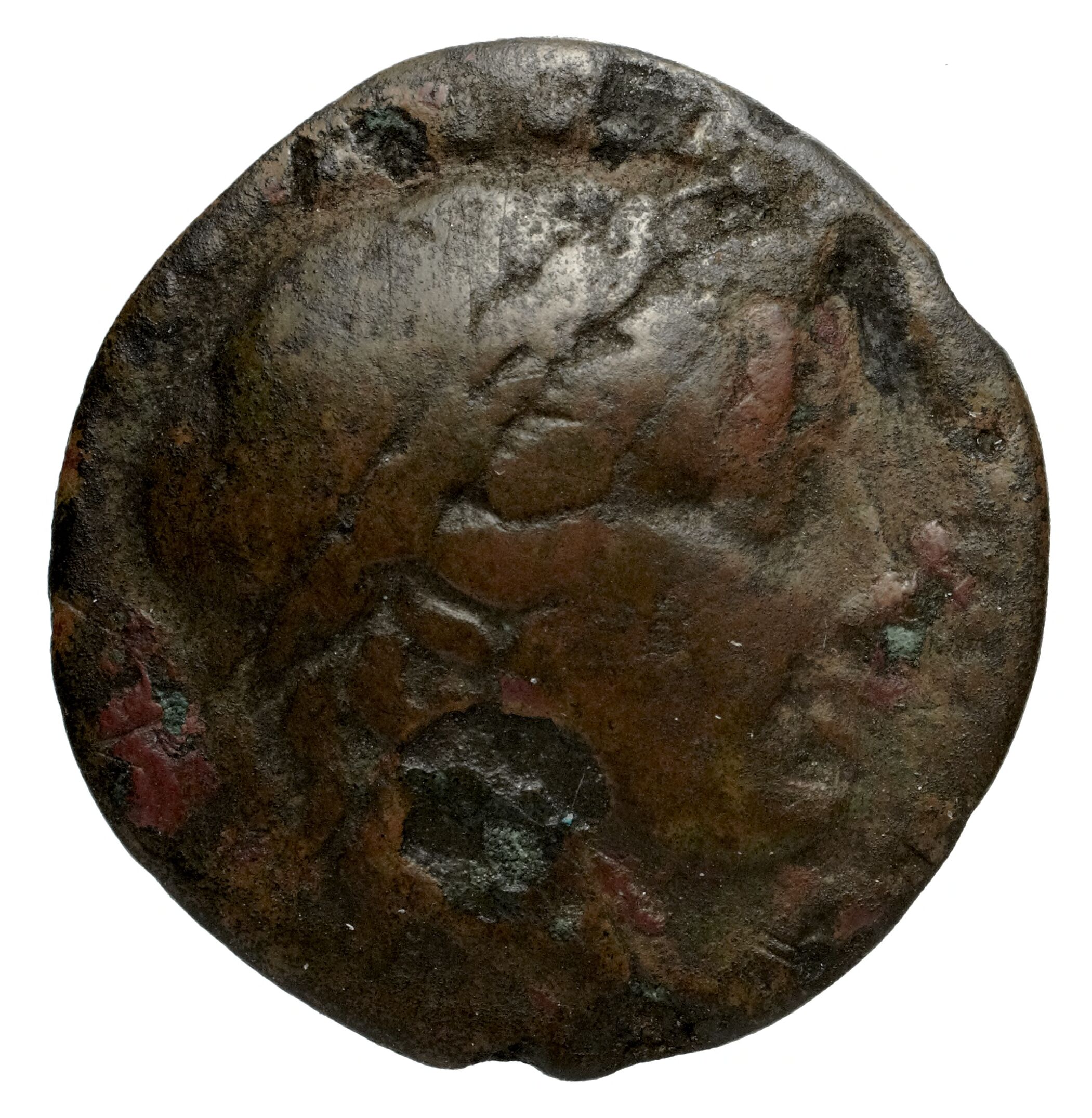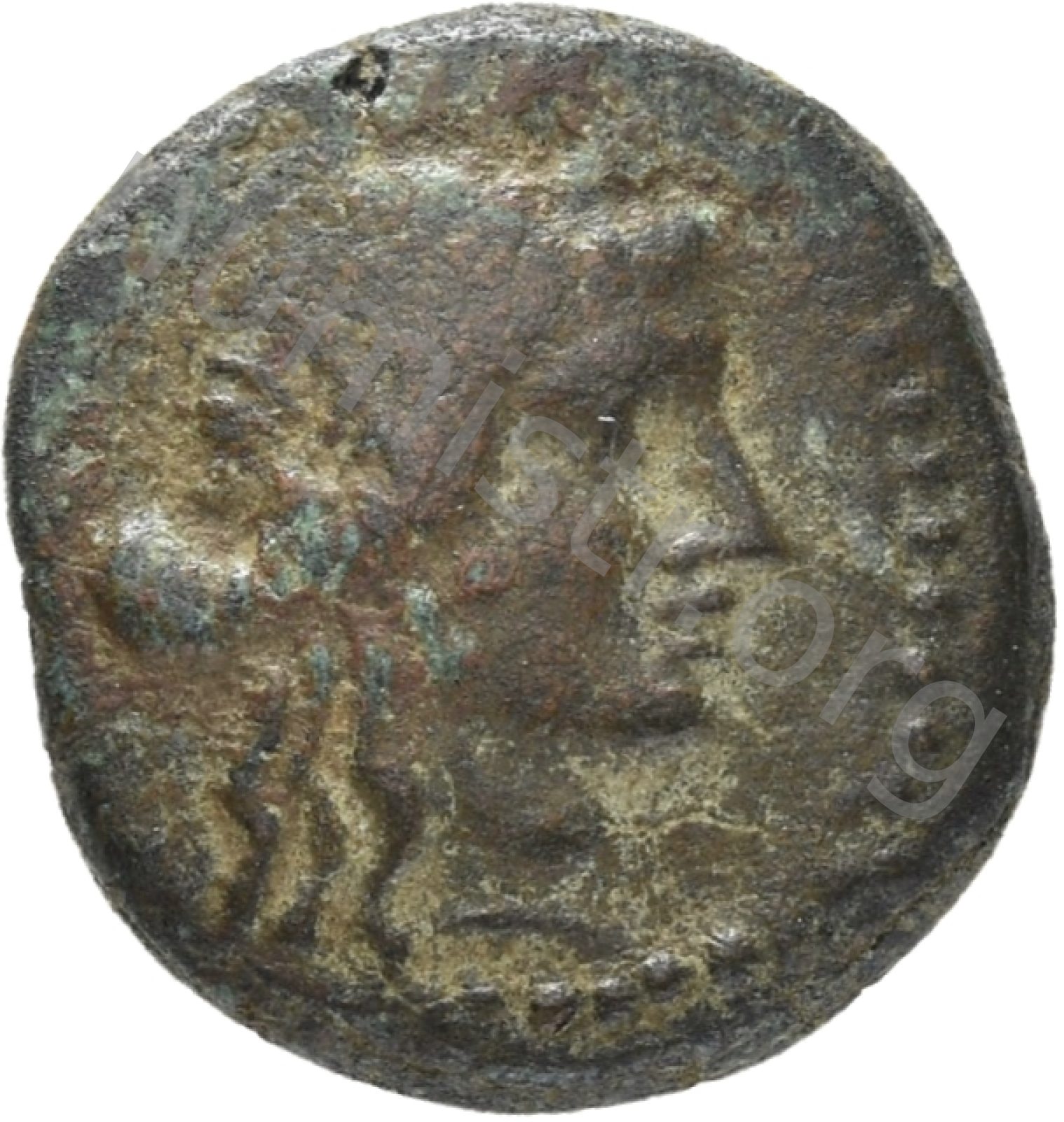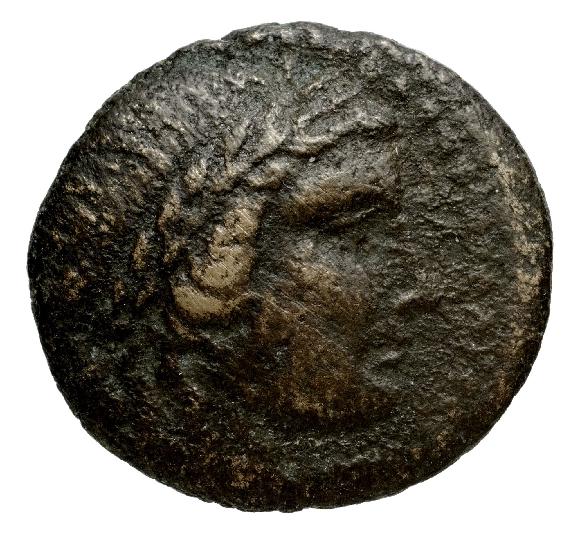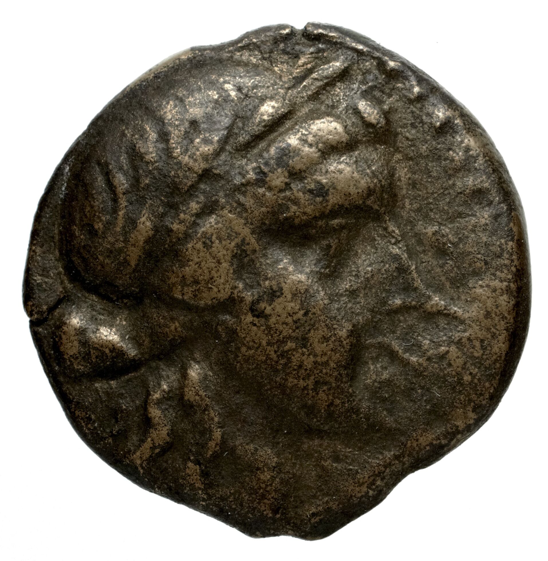 Yuvarlak noktalı bir bordürde defne çelengi takan Apollon'un başı