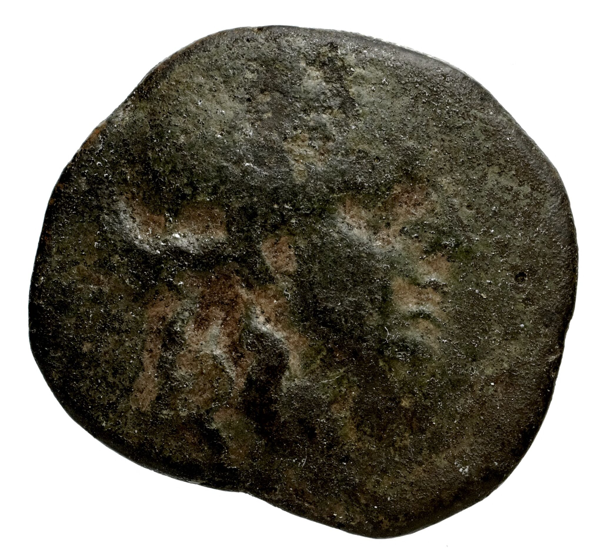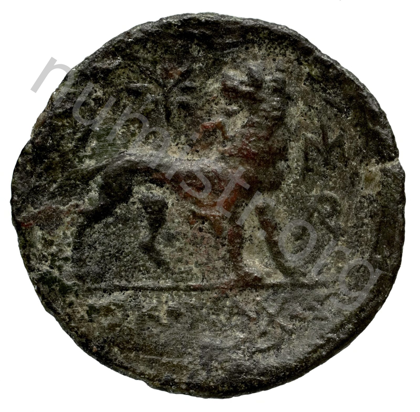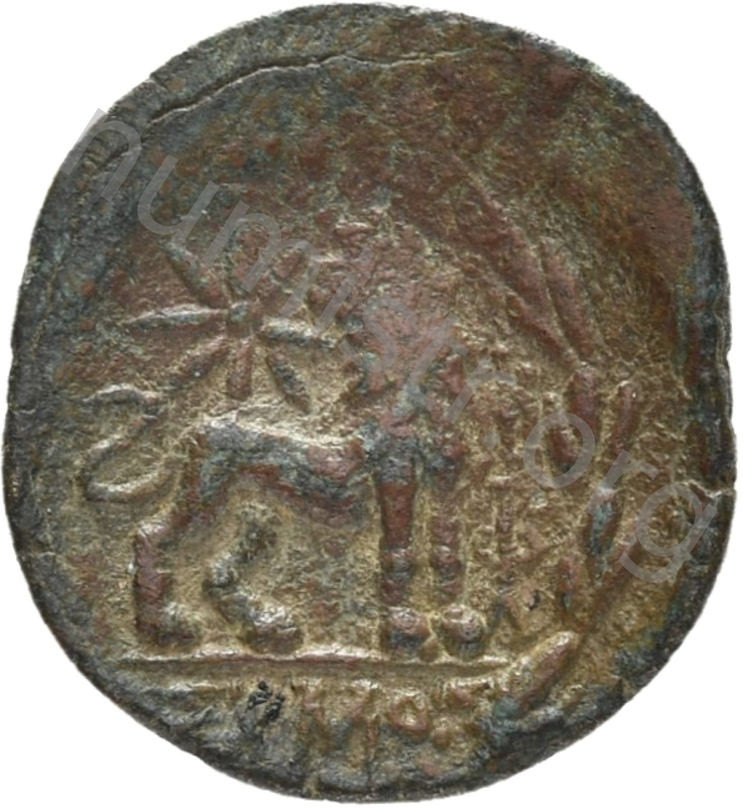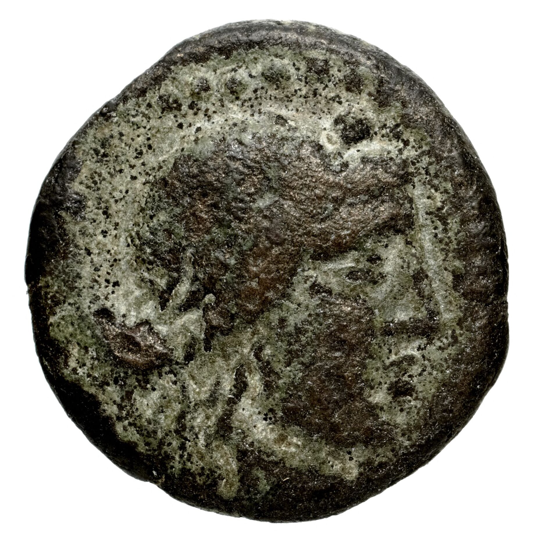 Yuvarlak noktalı bir bordürde defne çelengi takan Apollon'un başı