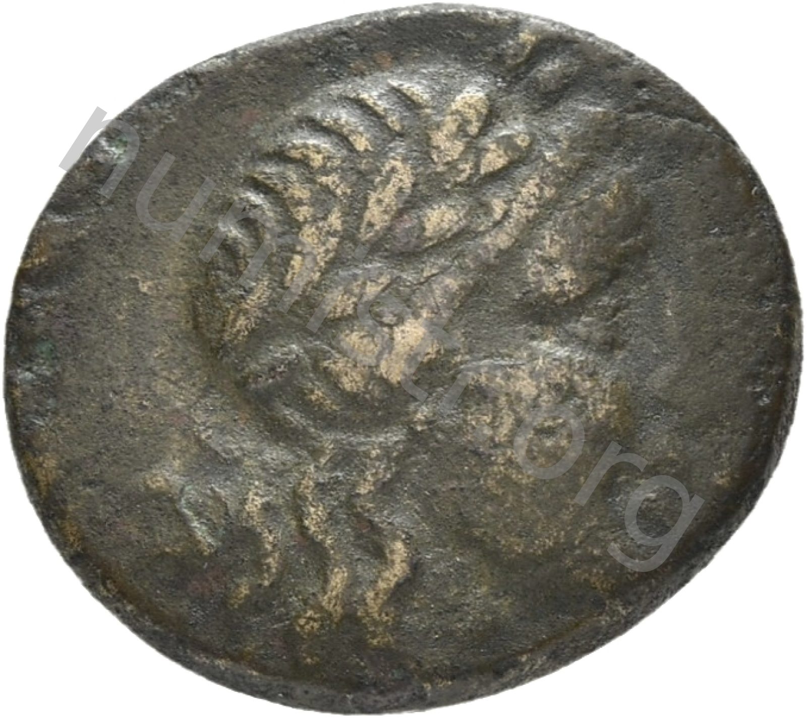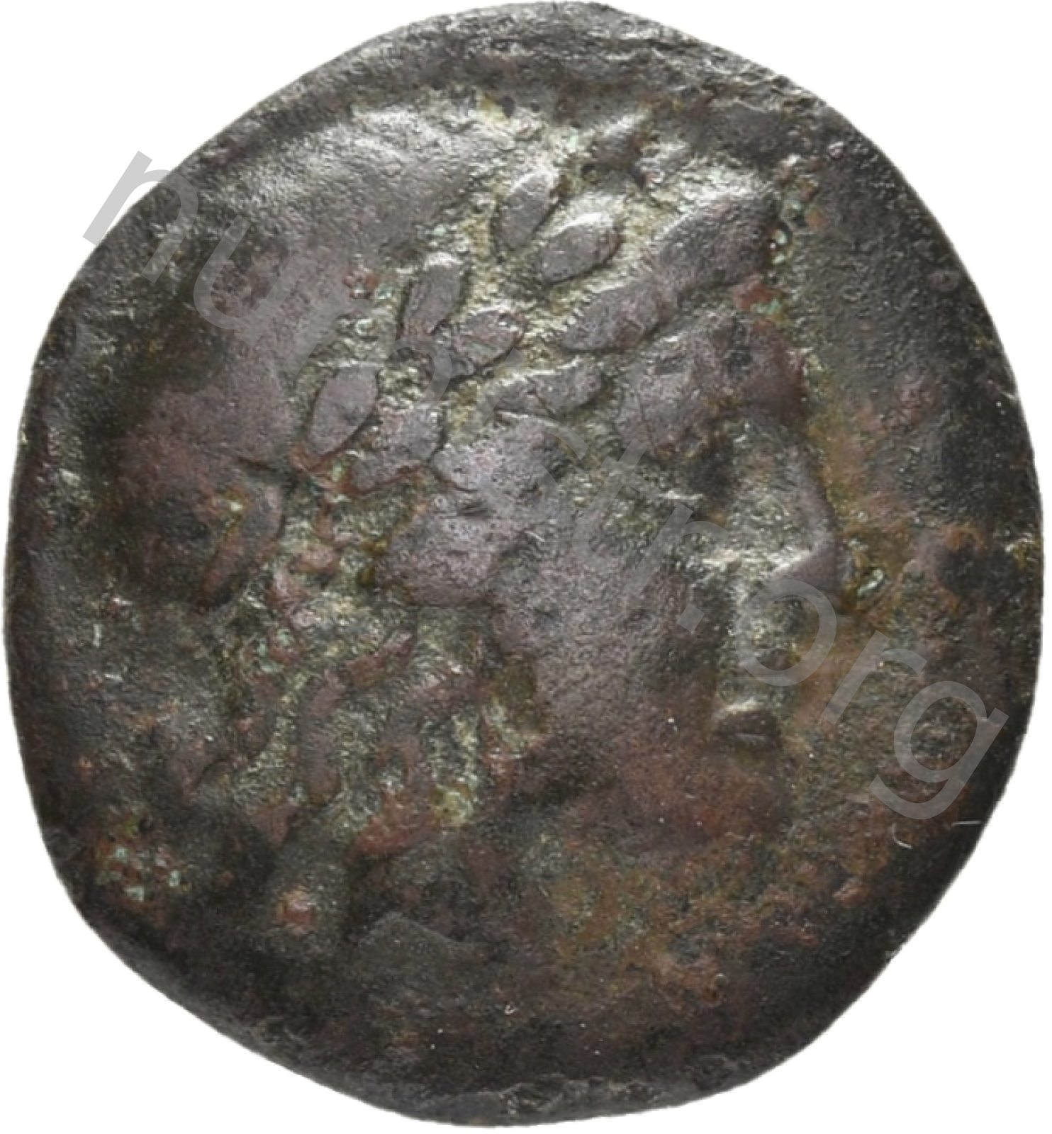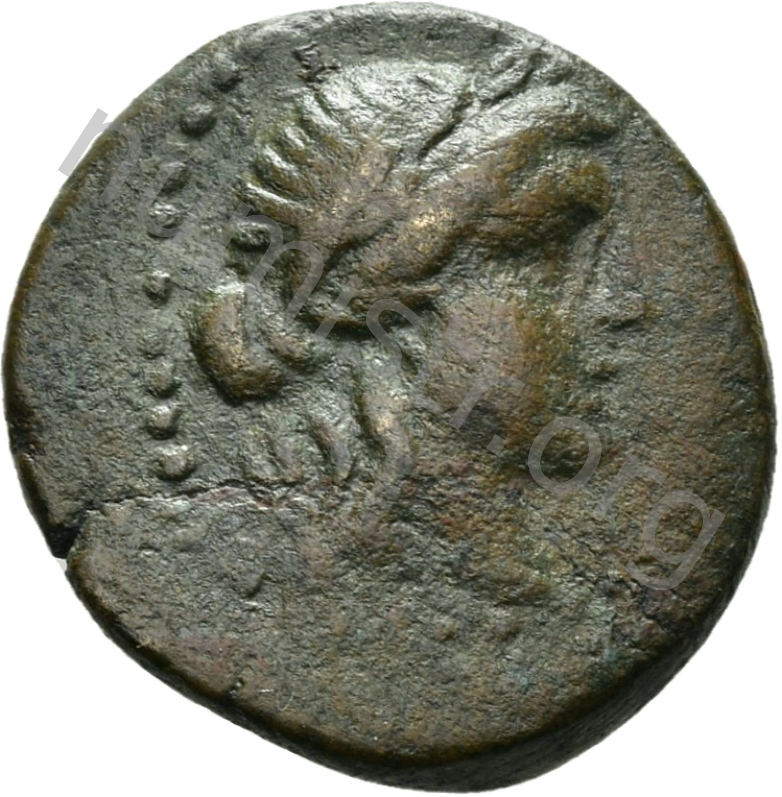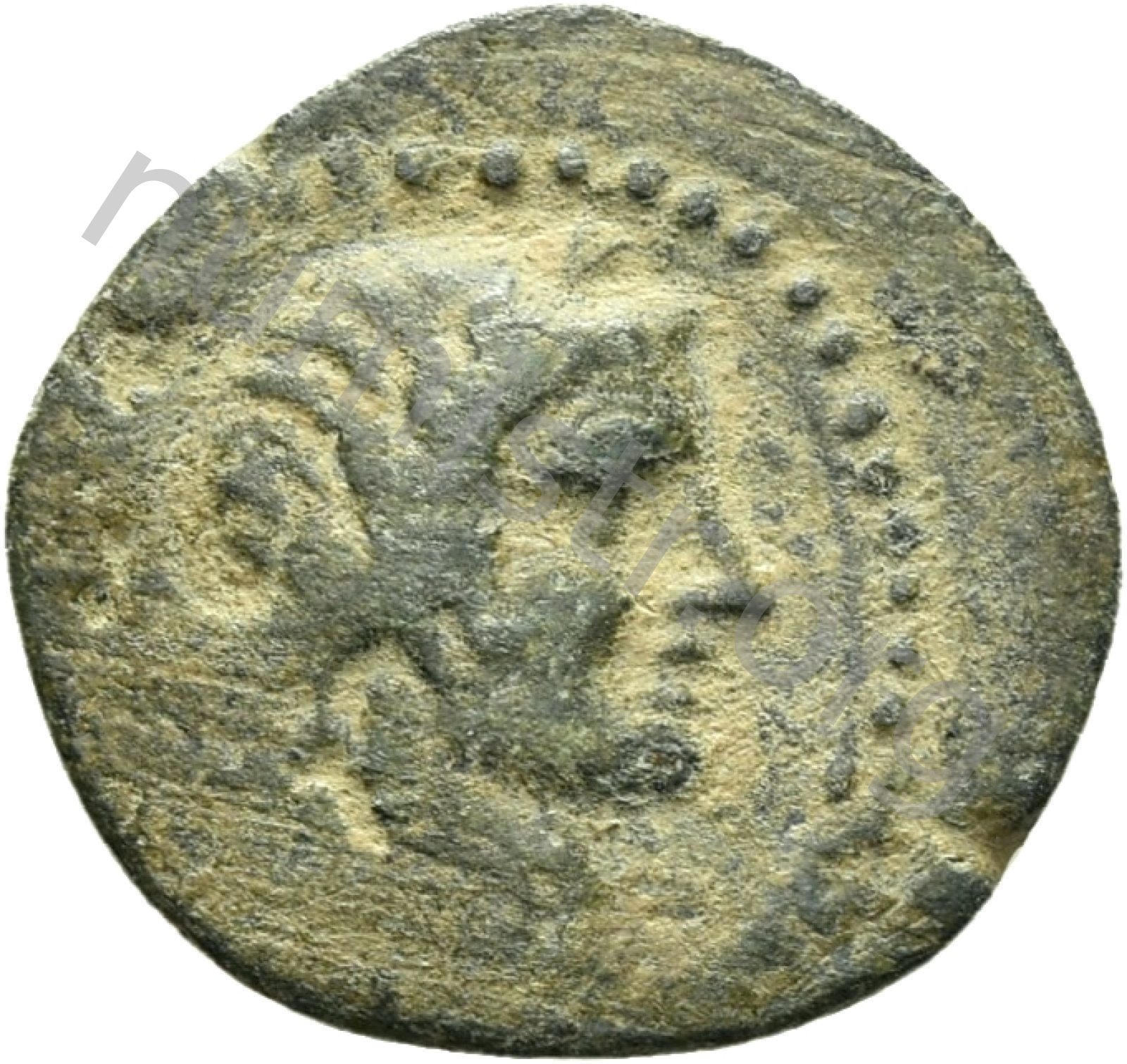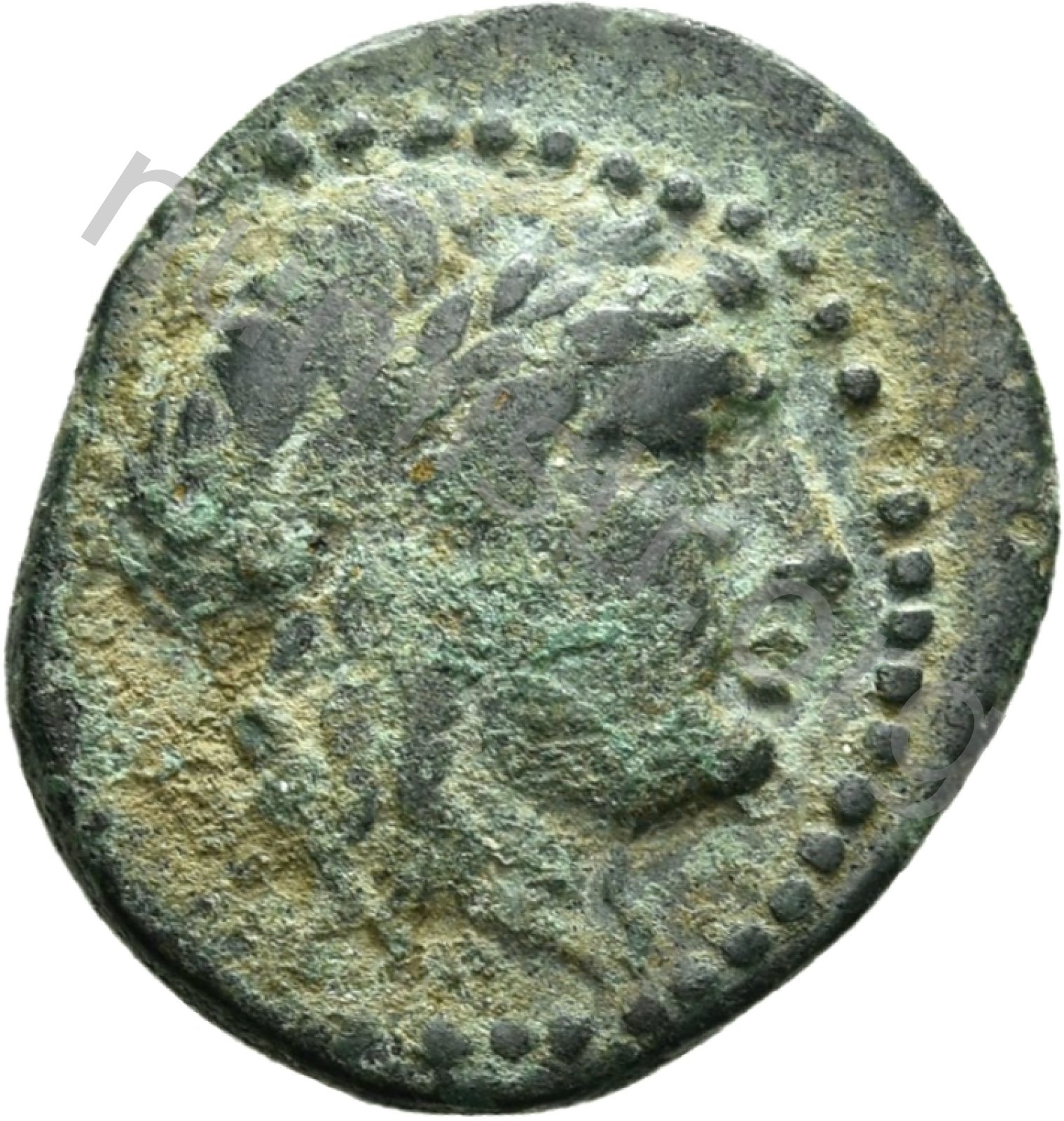 Head of Apollo wearing a laurel wreath in a round border of dots -[en]
