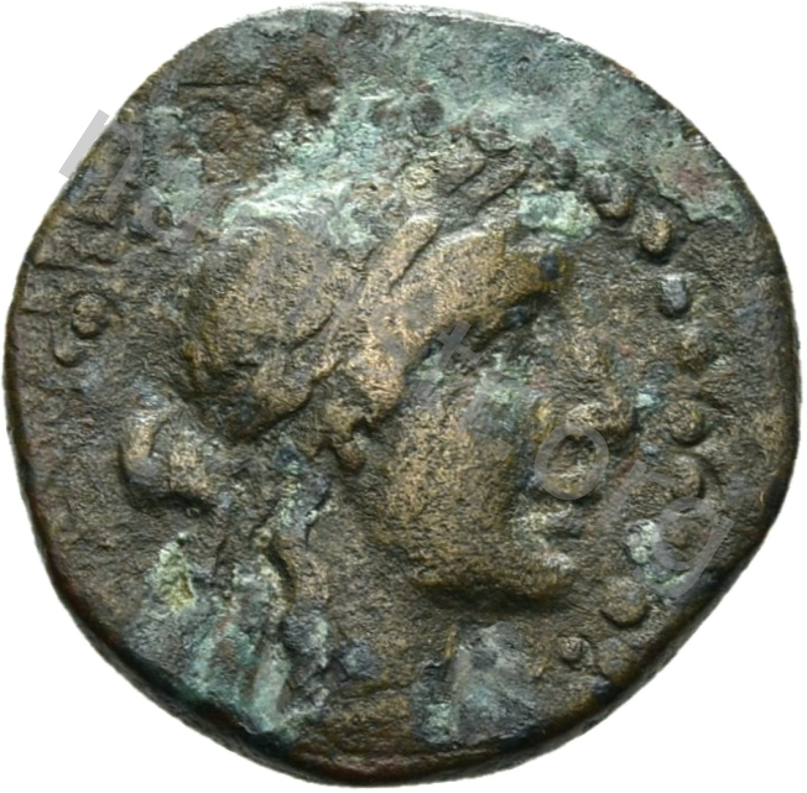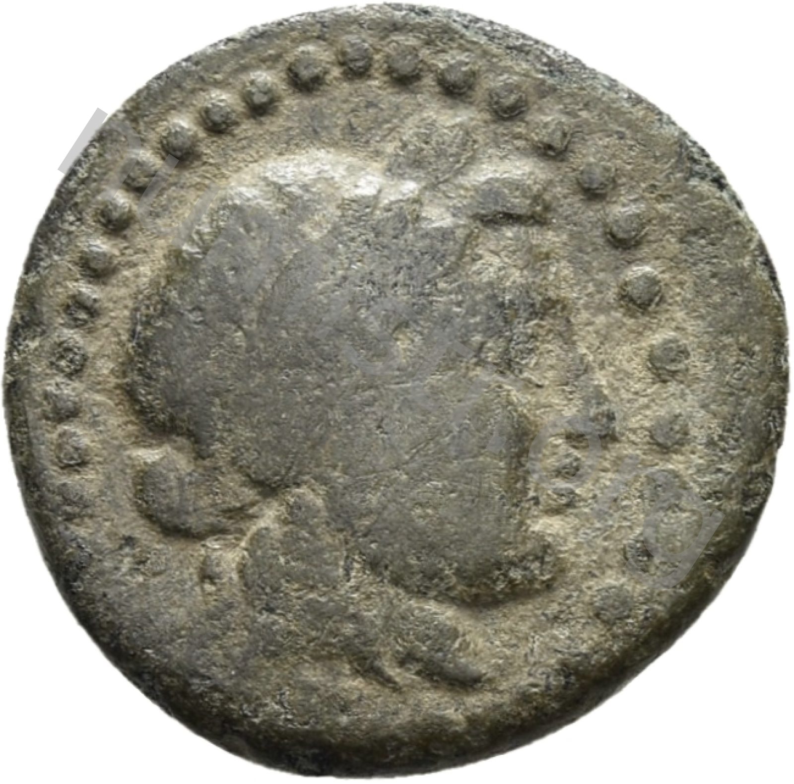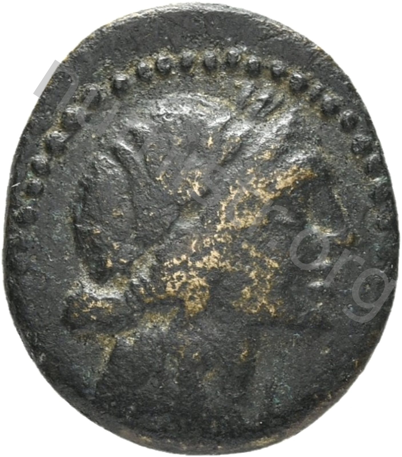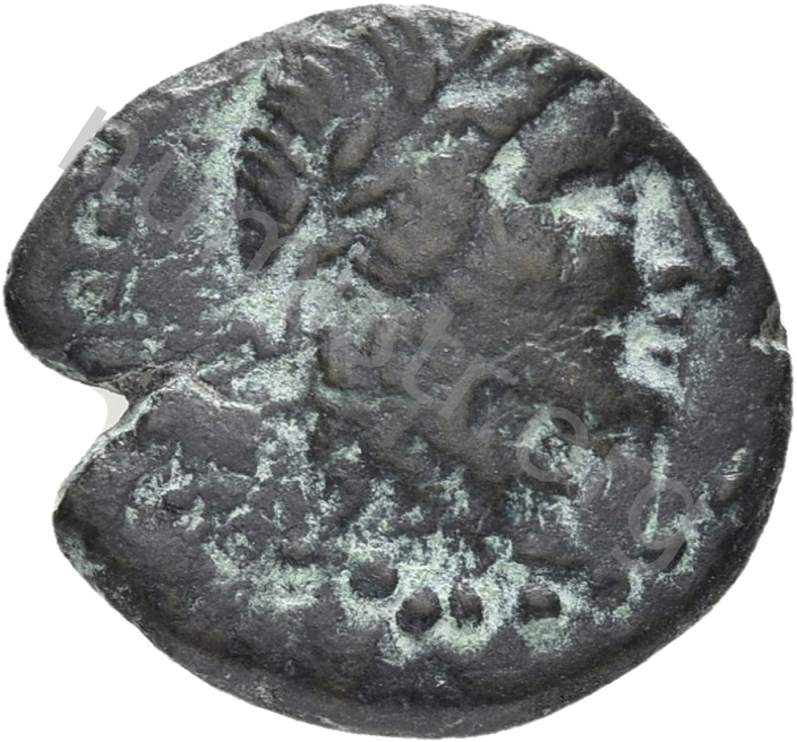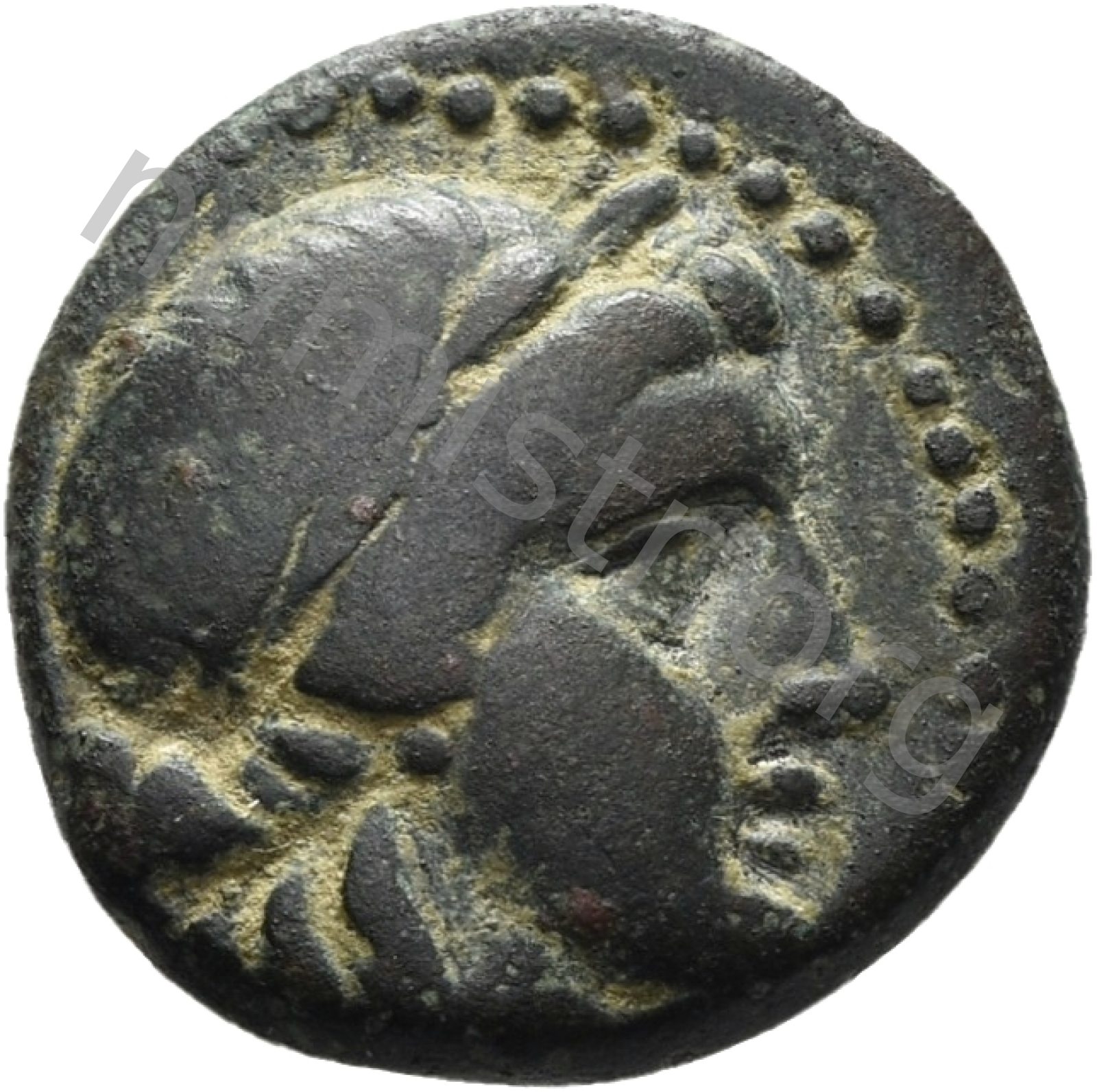 Head of Apollo wearing a laurel wreath in a round border of dots -[en]