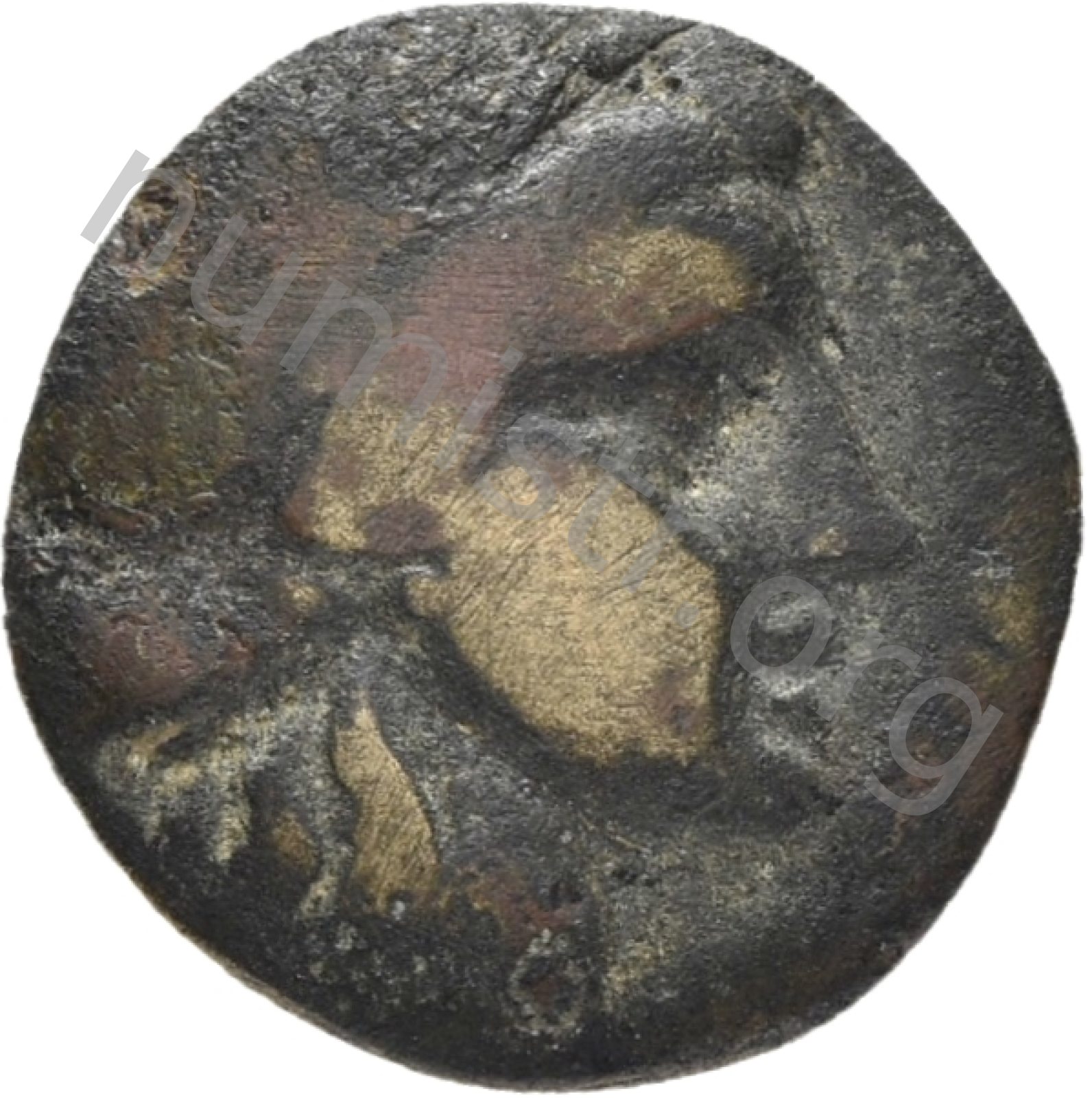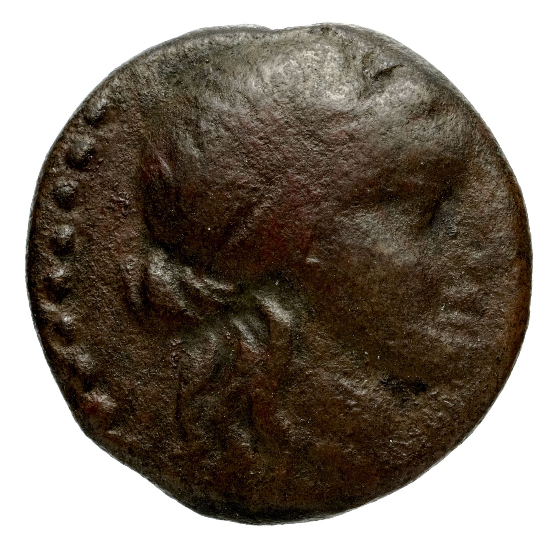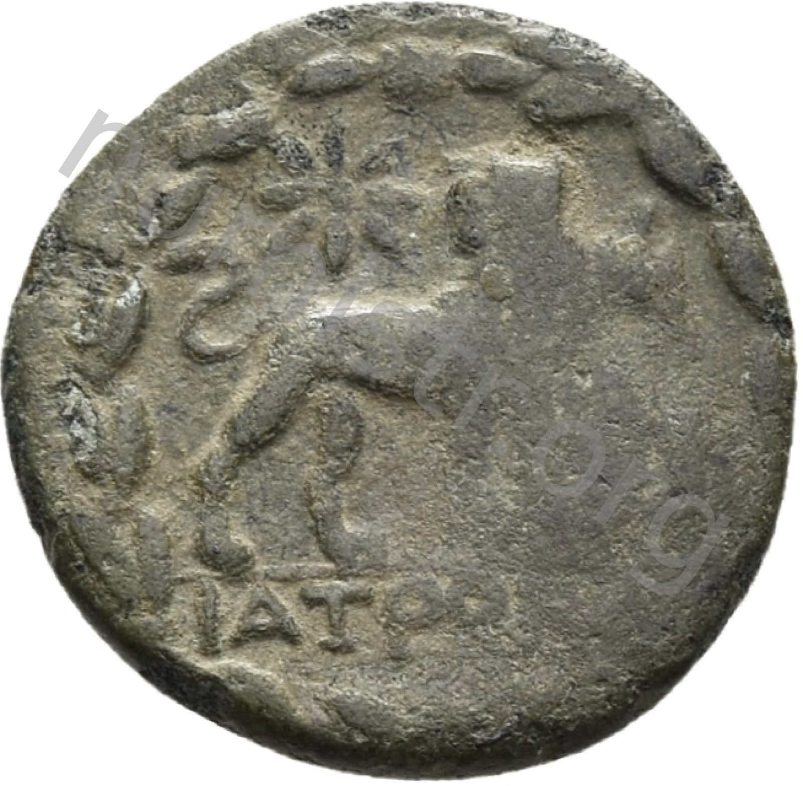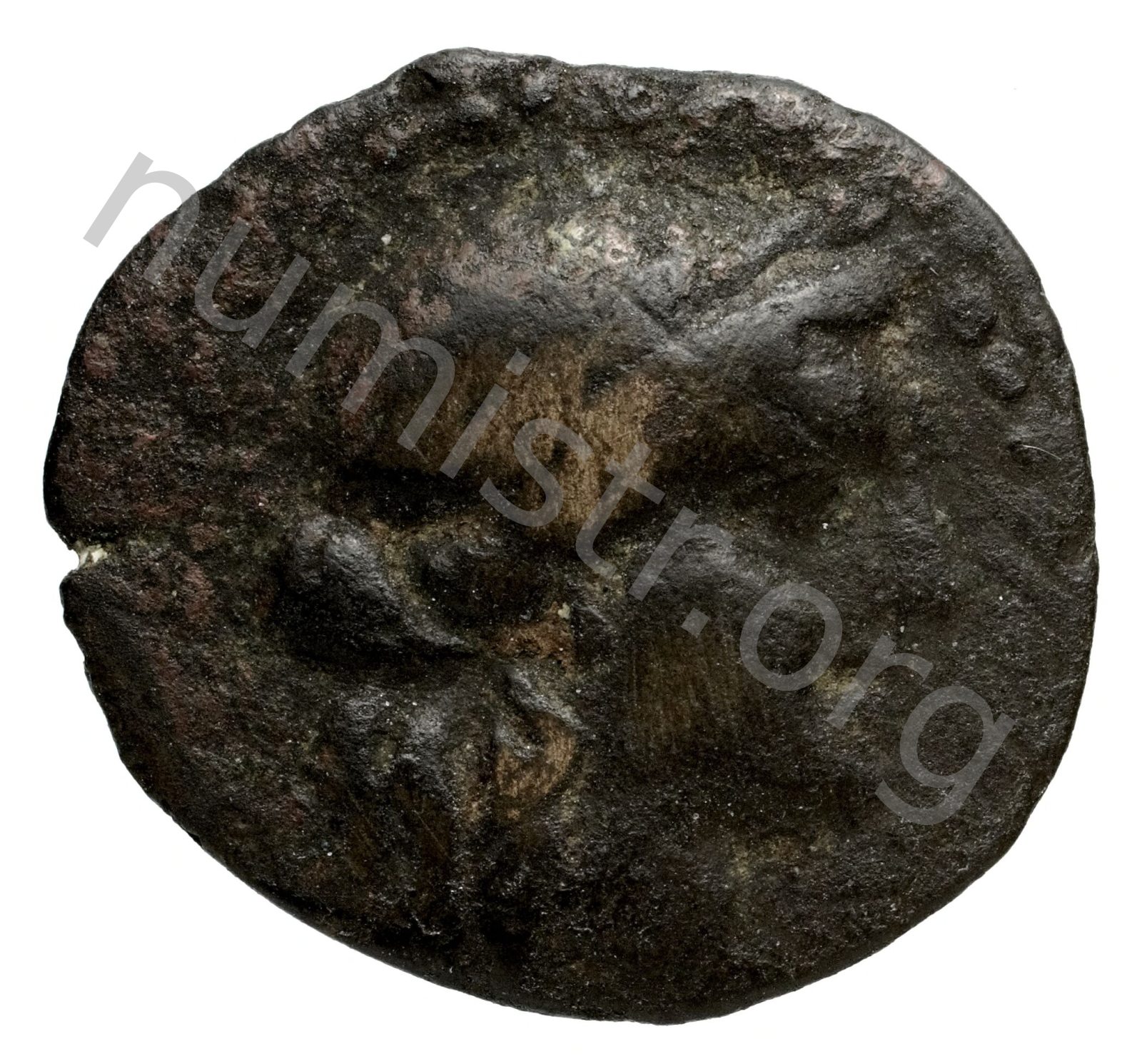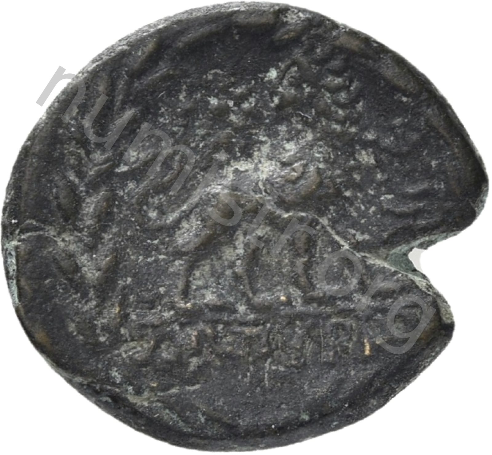 Head of Apollo wearing a laurel wreath in a round border of dots -[en]