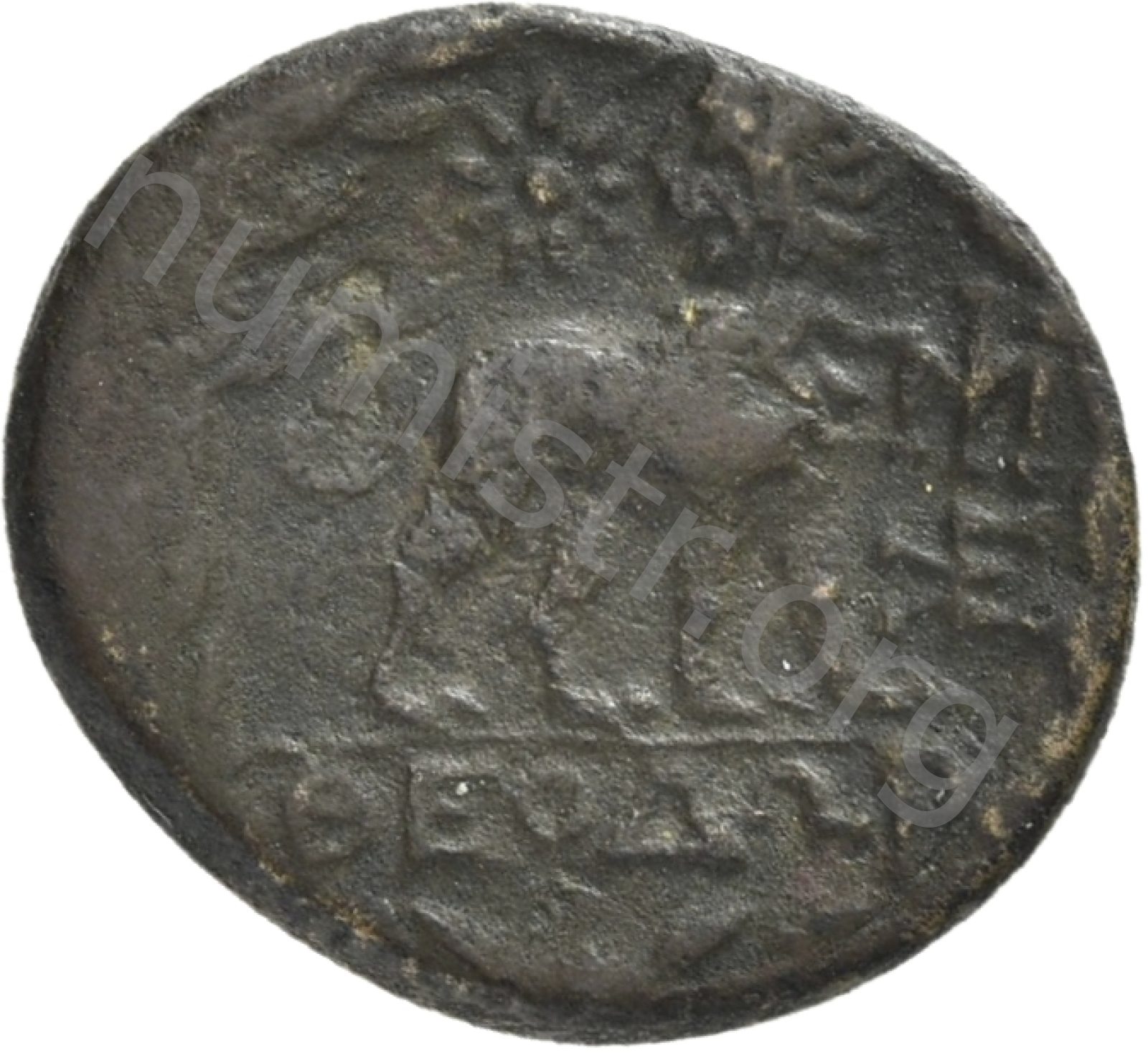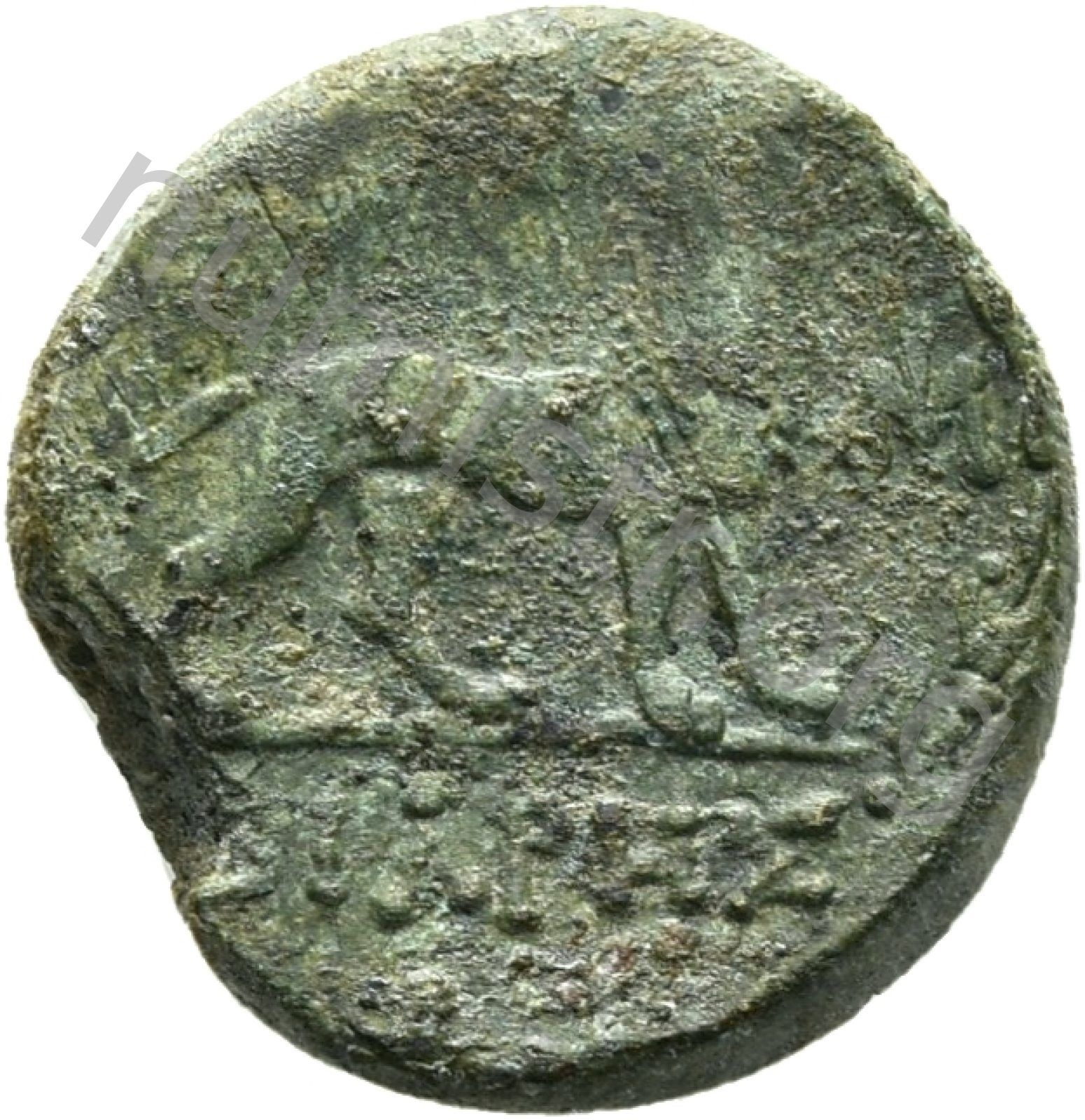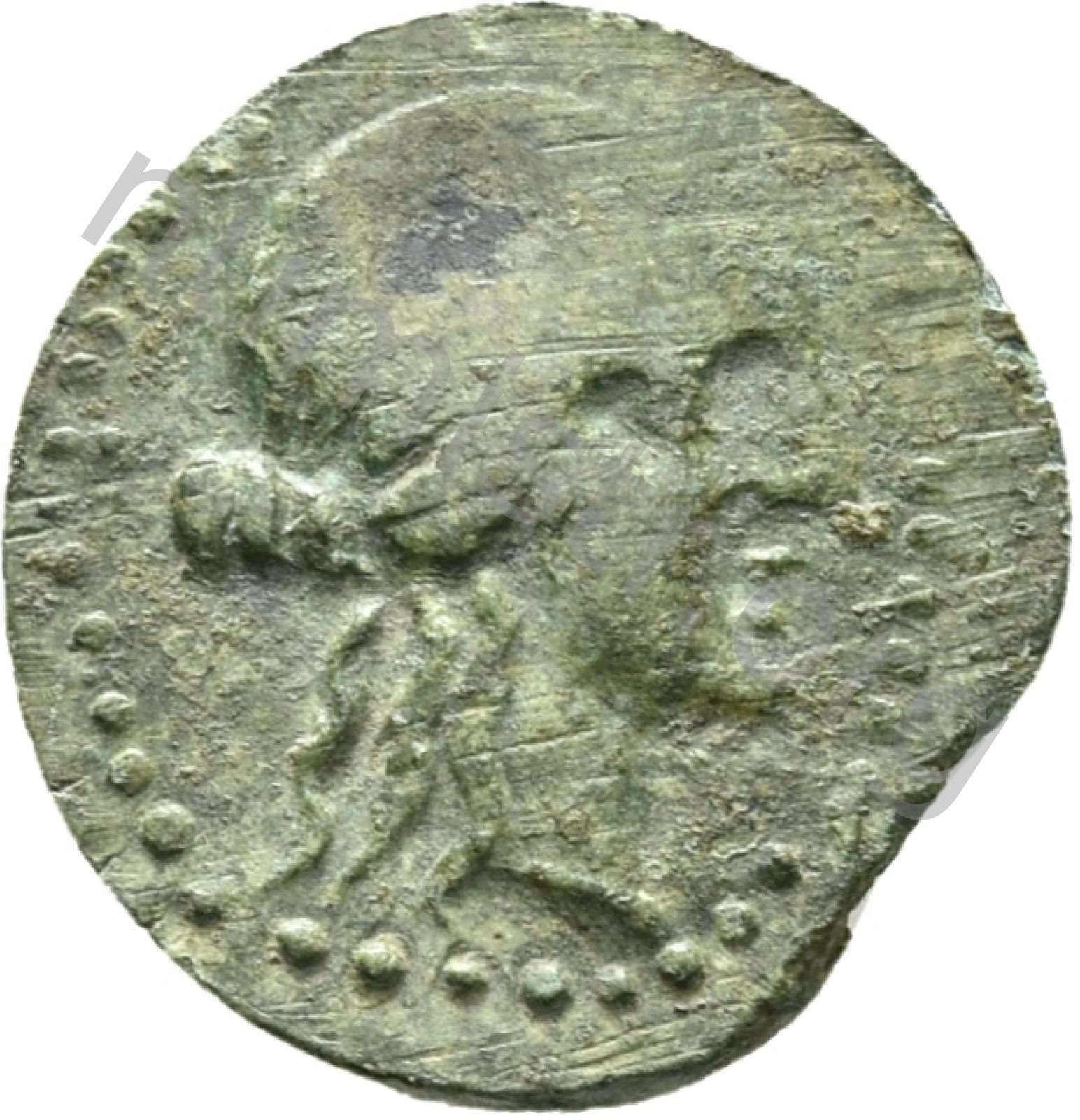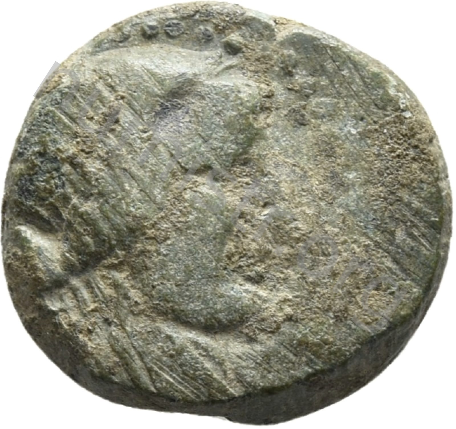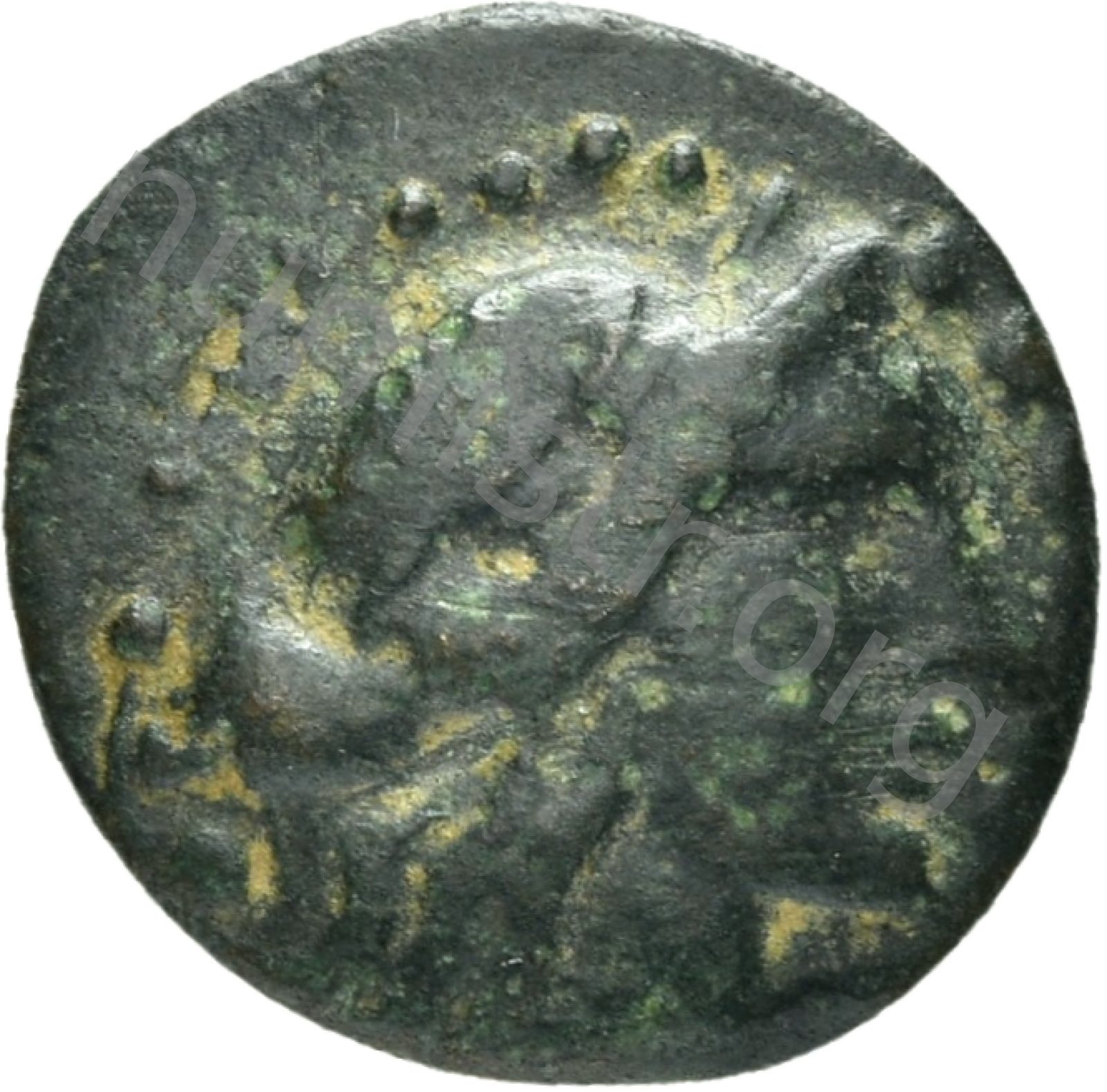 Head of Apollo wearing a laurel wreath in a round border of dots -[en]