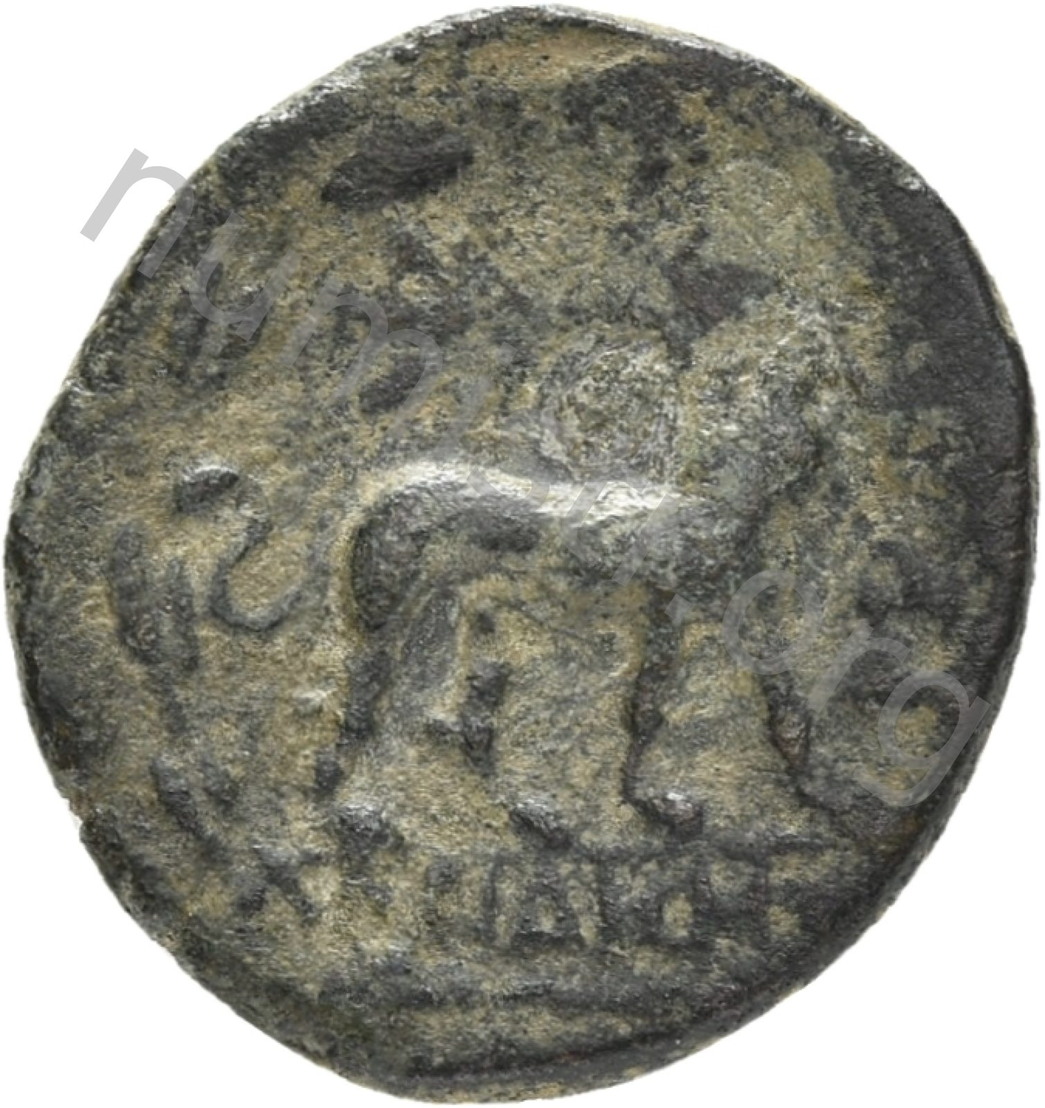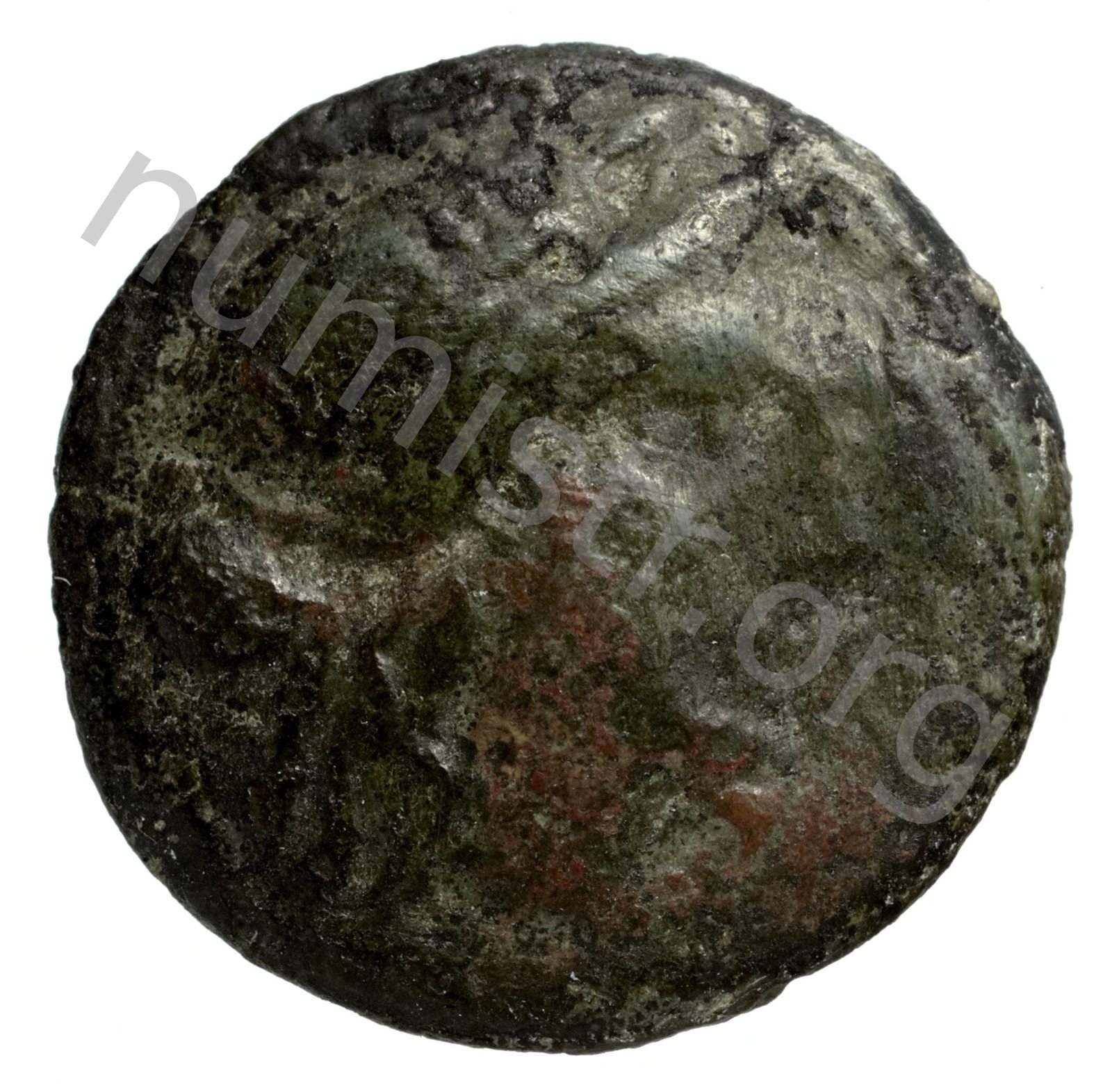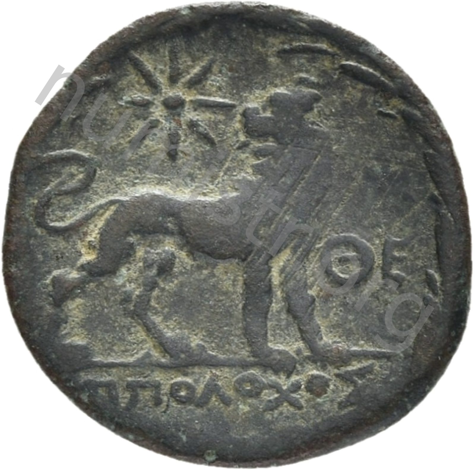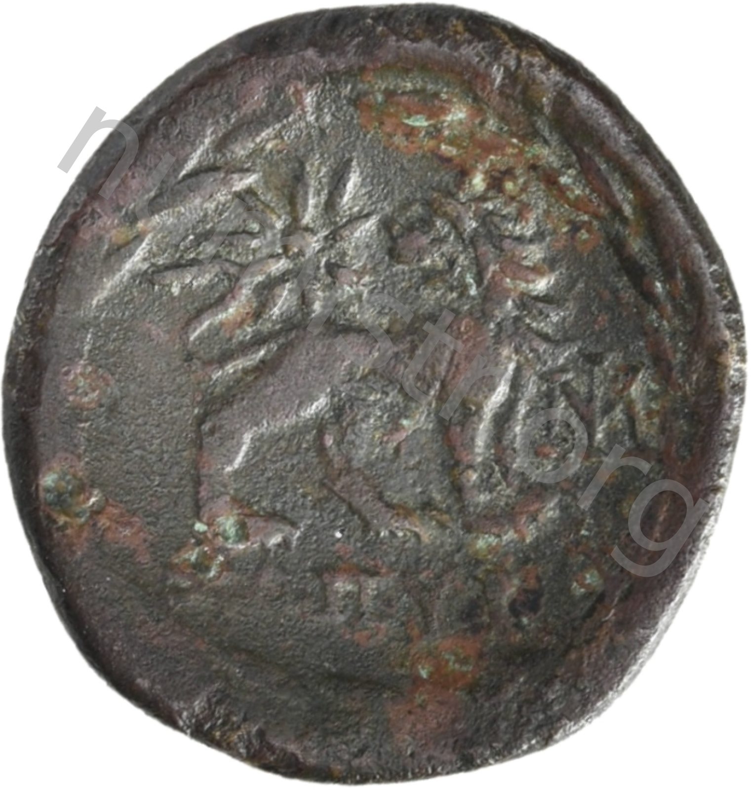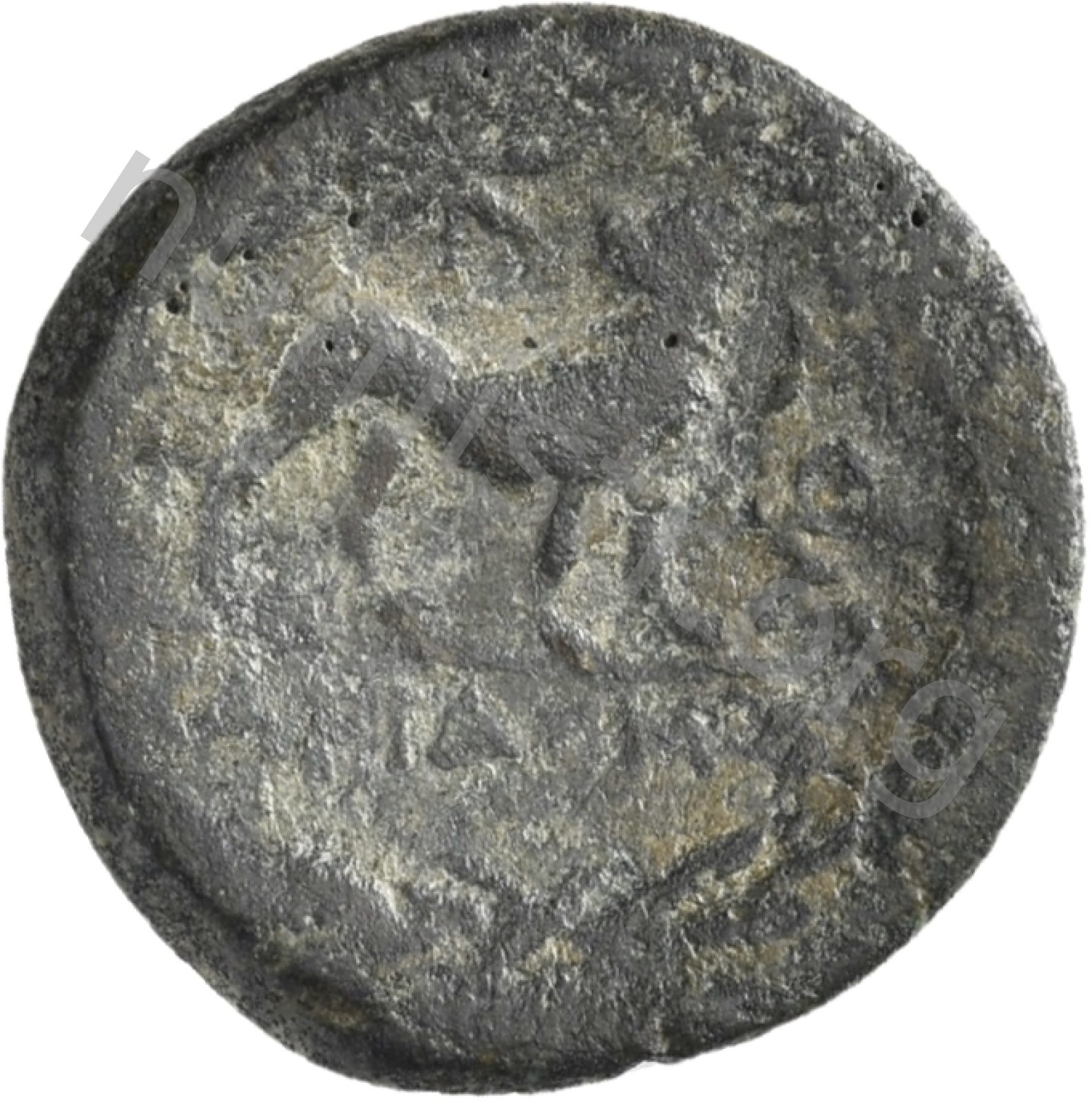 Head of Apollo wearing a laurel wreath in a round border of dots -[en]