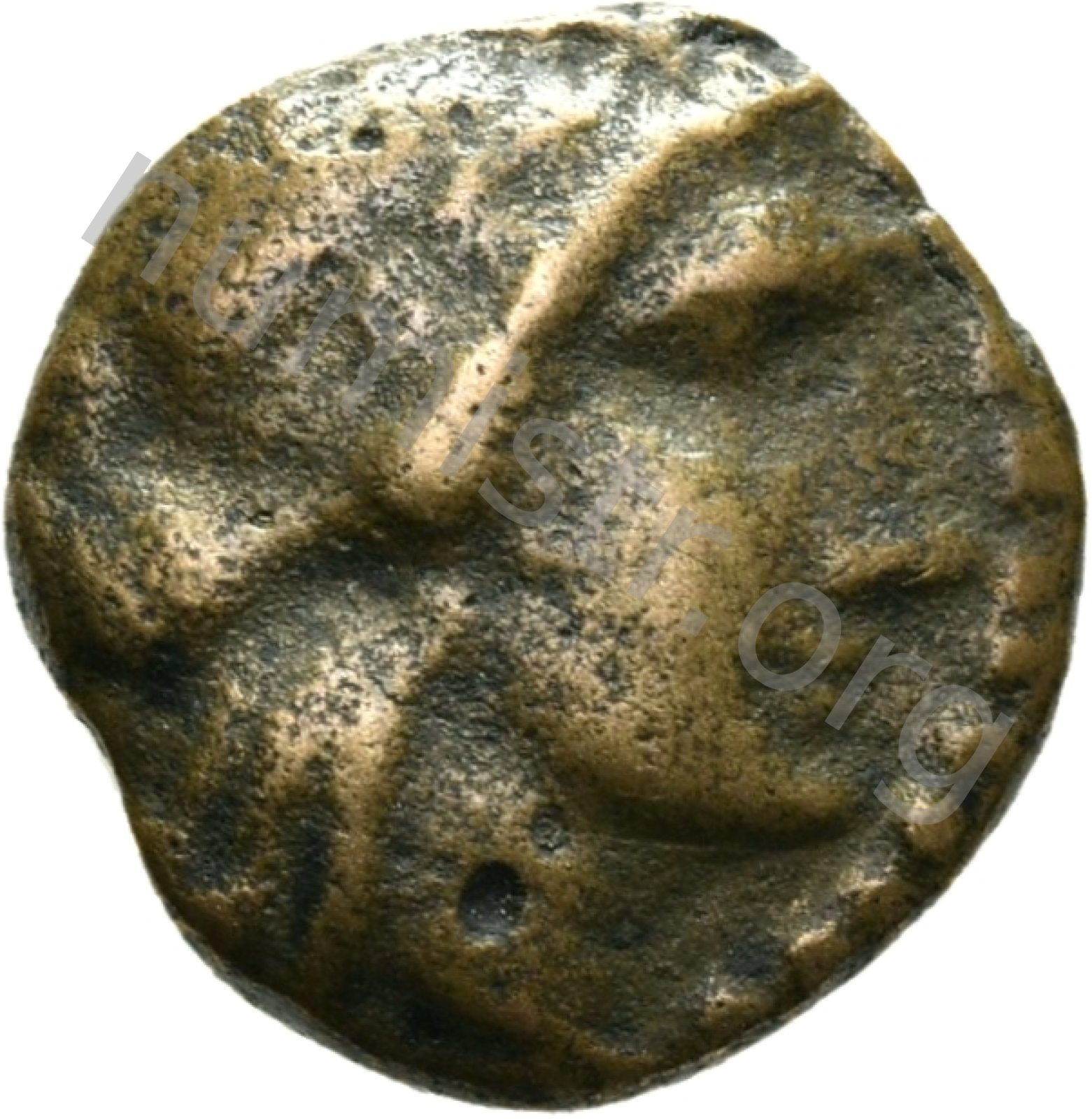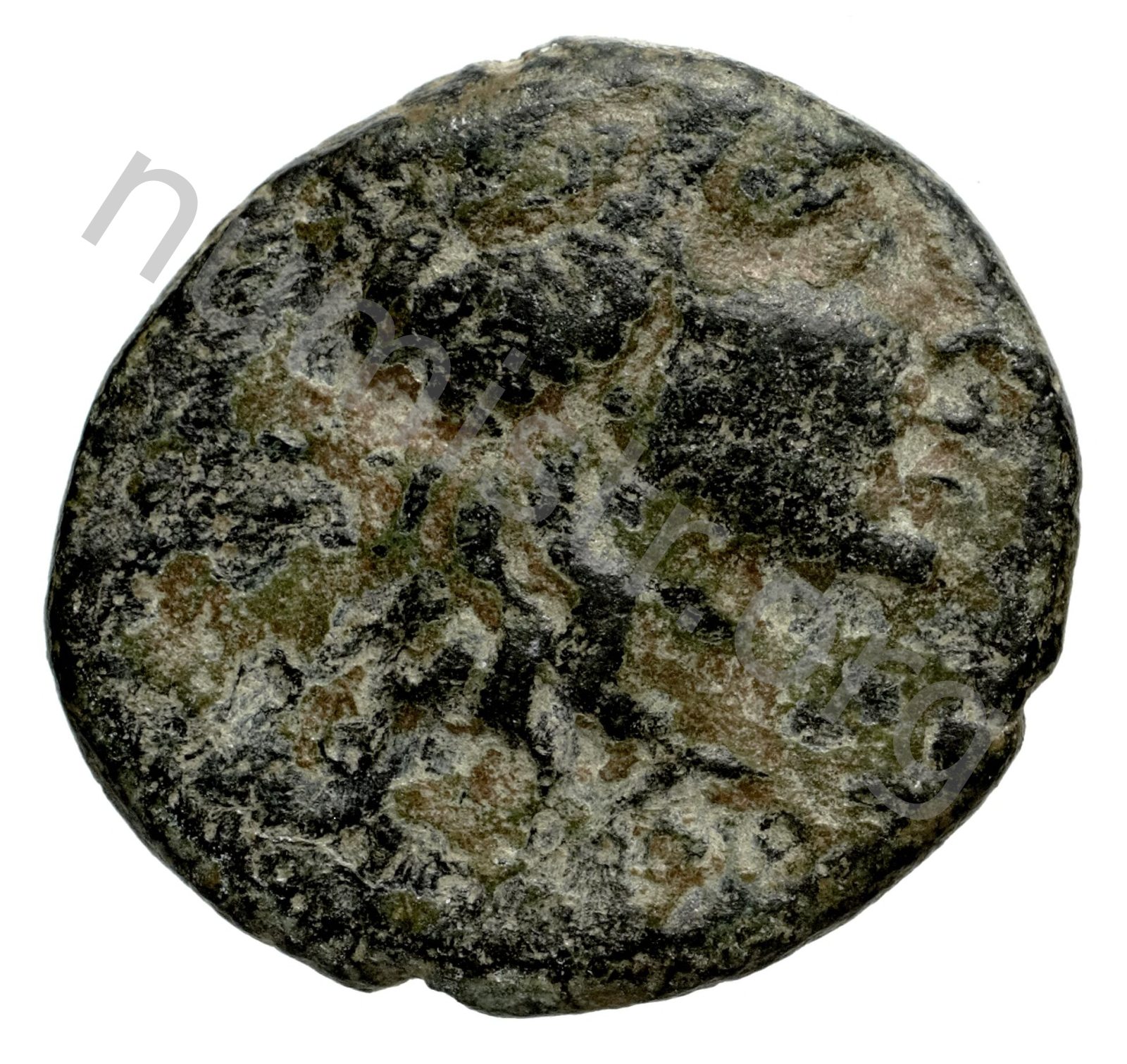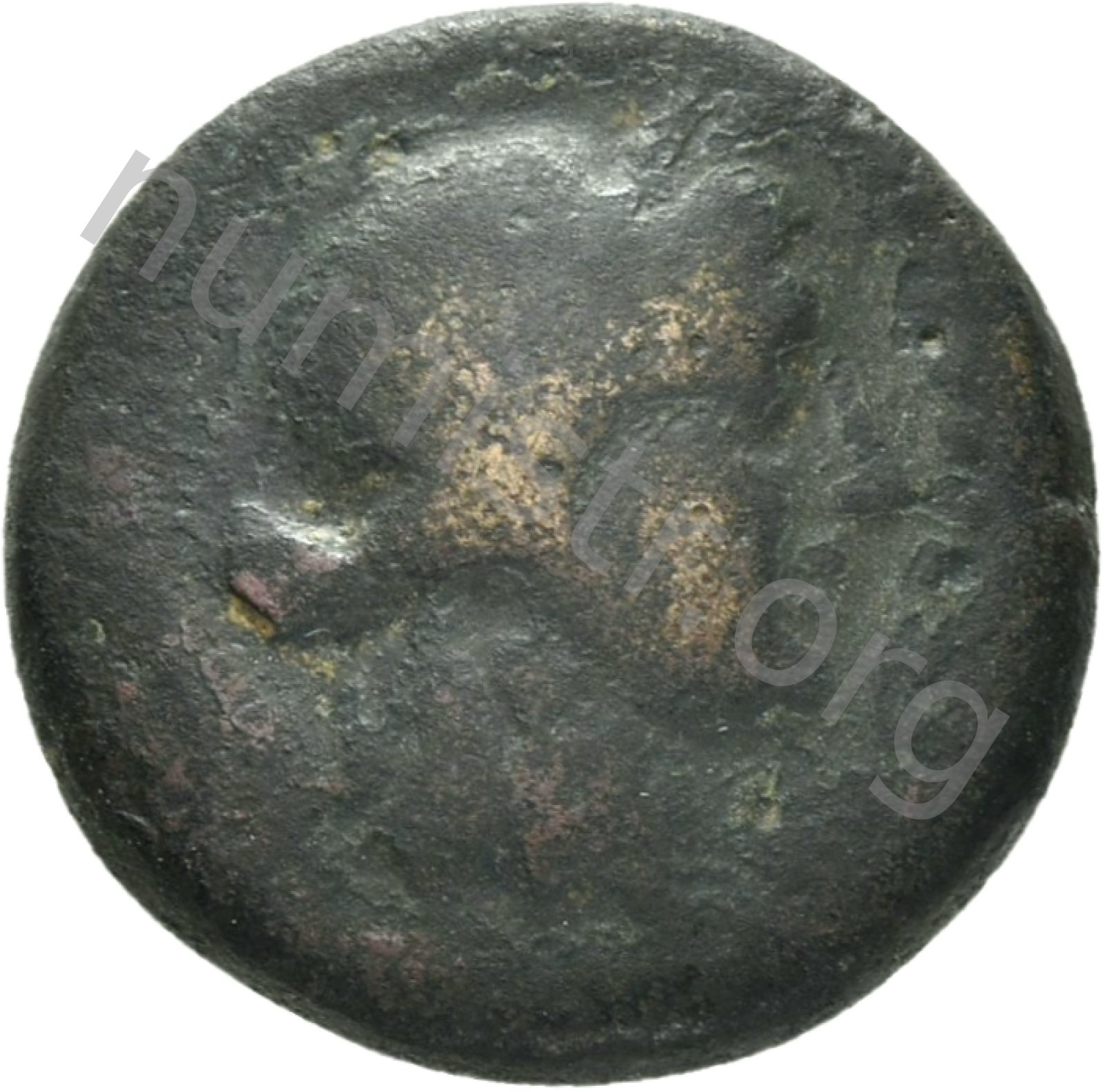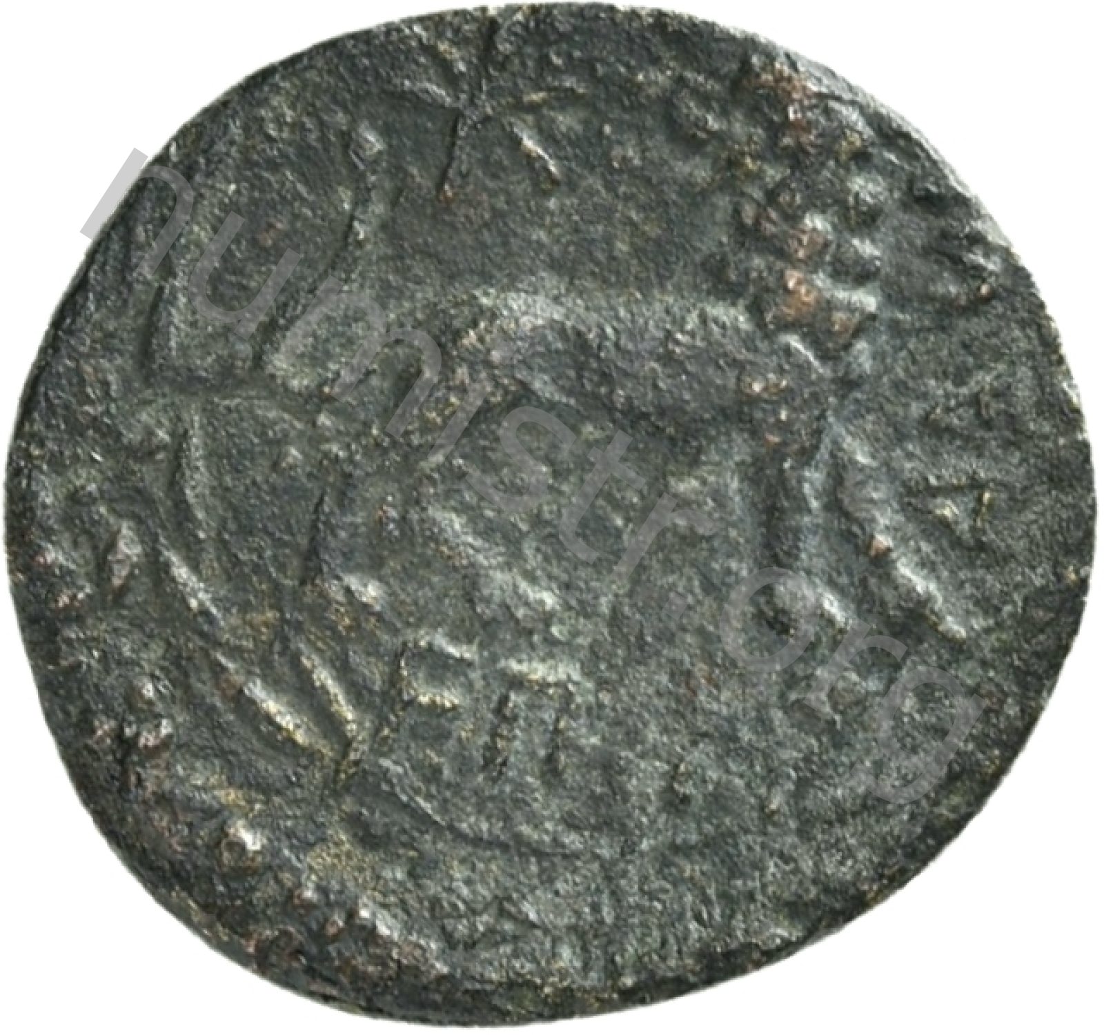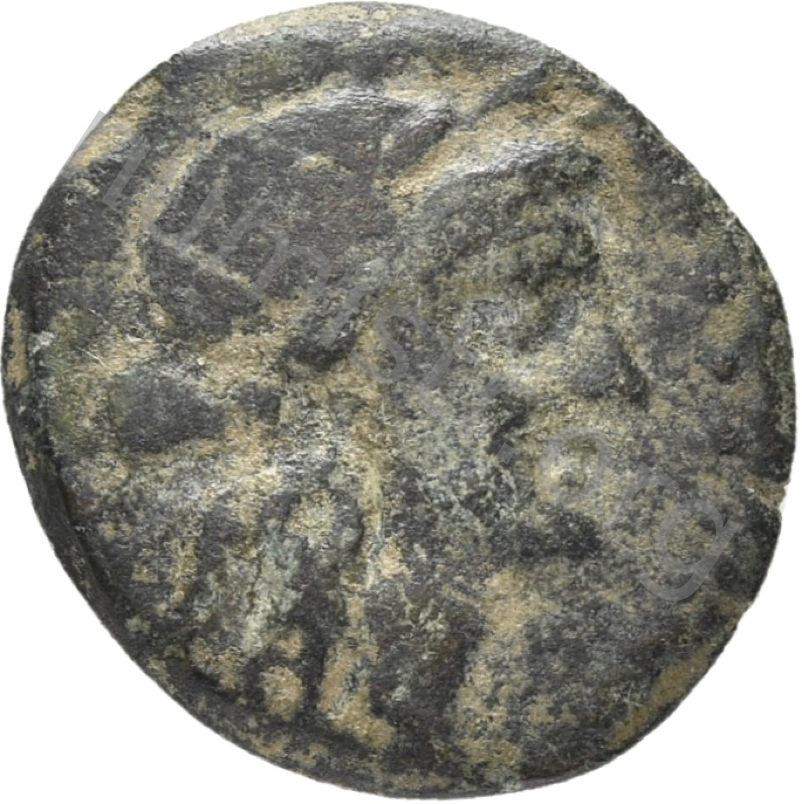 Head of Apollo wearing a laurel wreath in a round border of dots -[en]