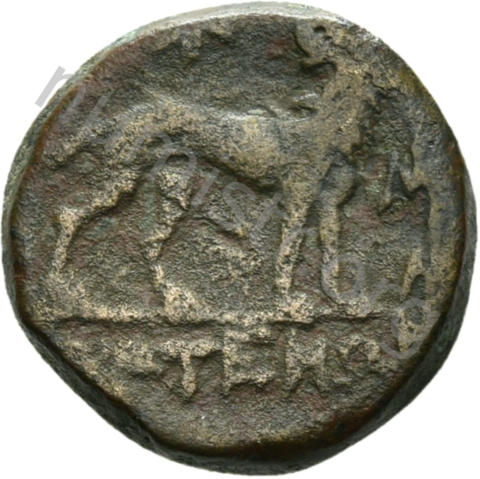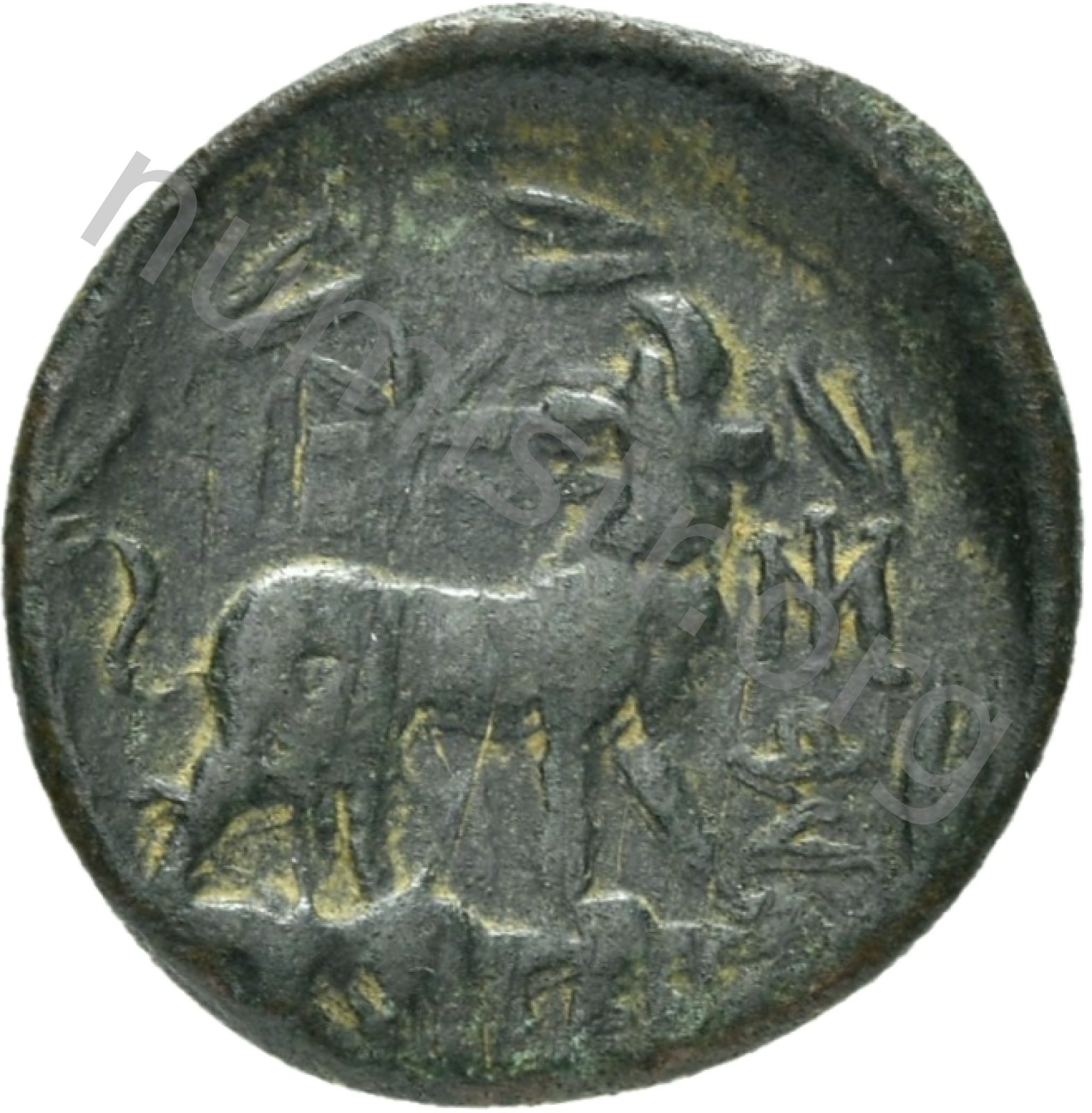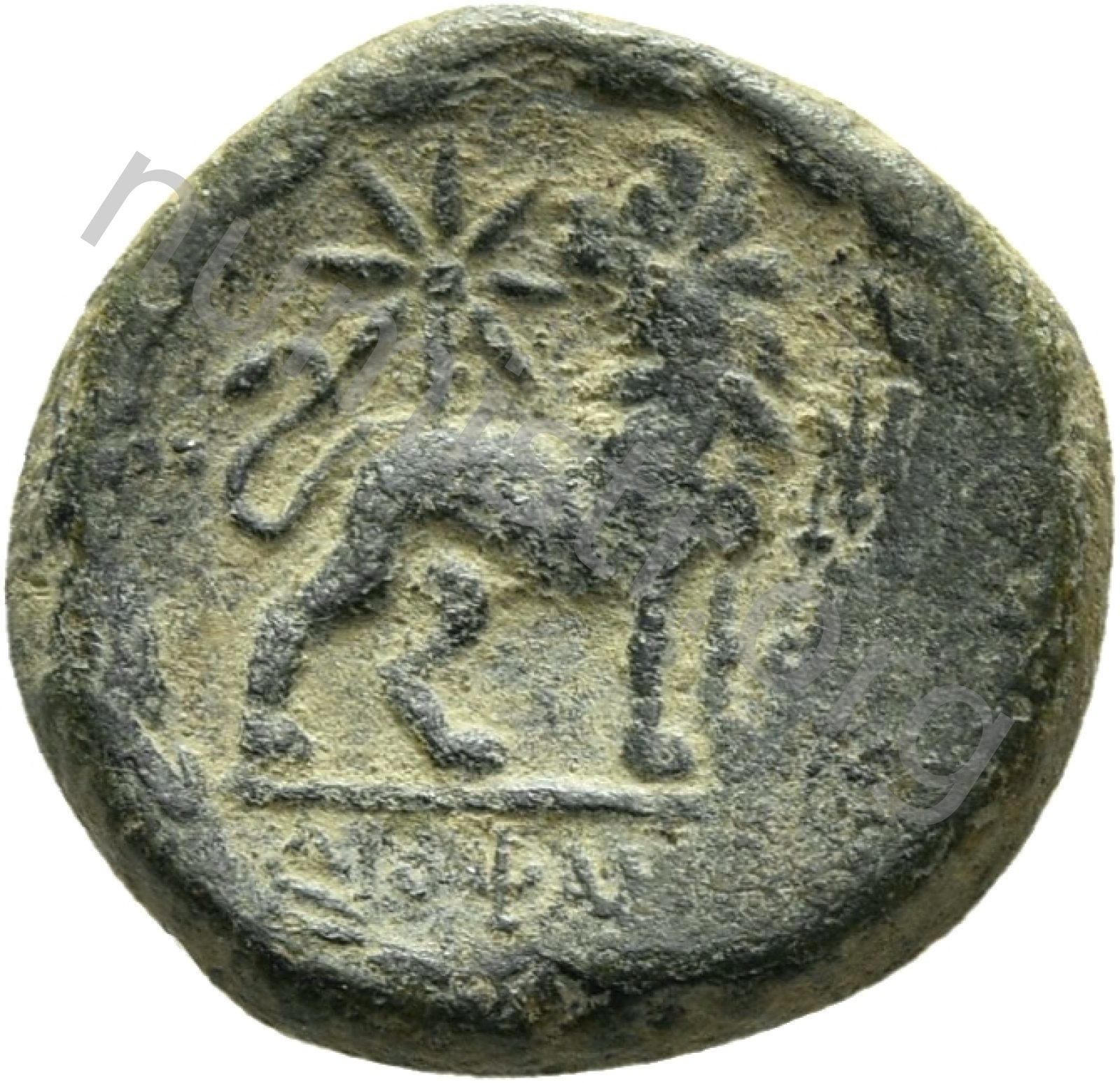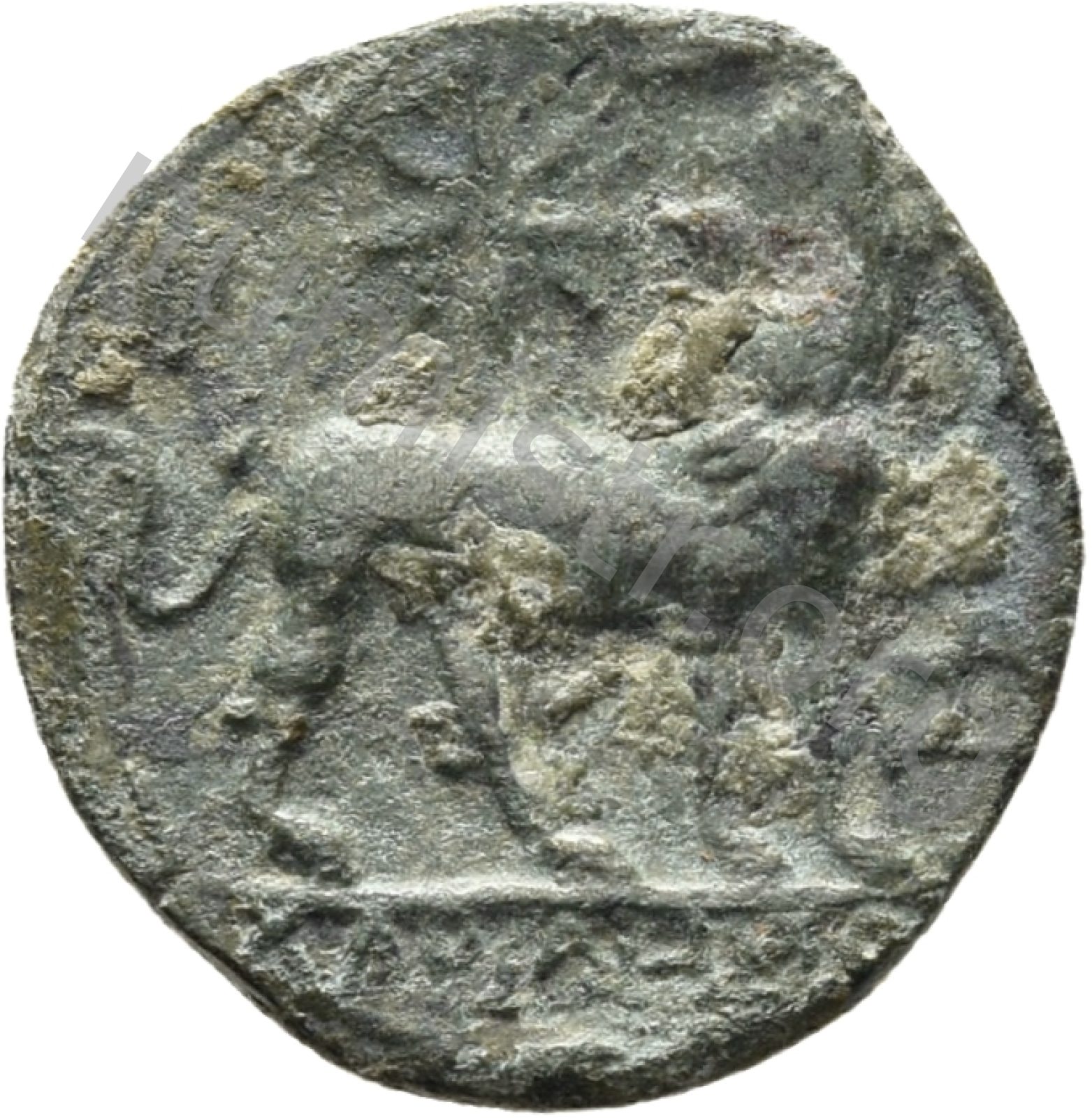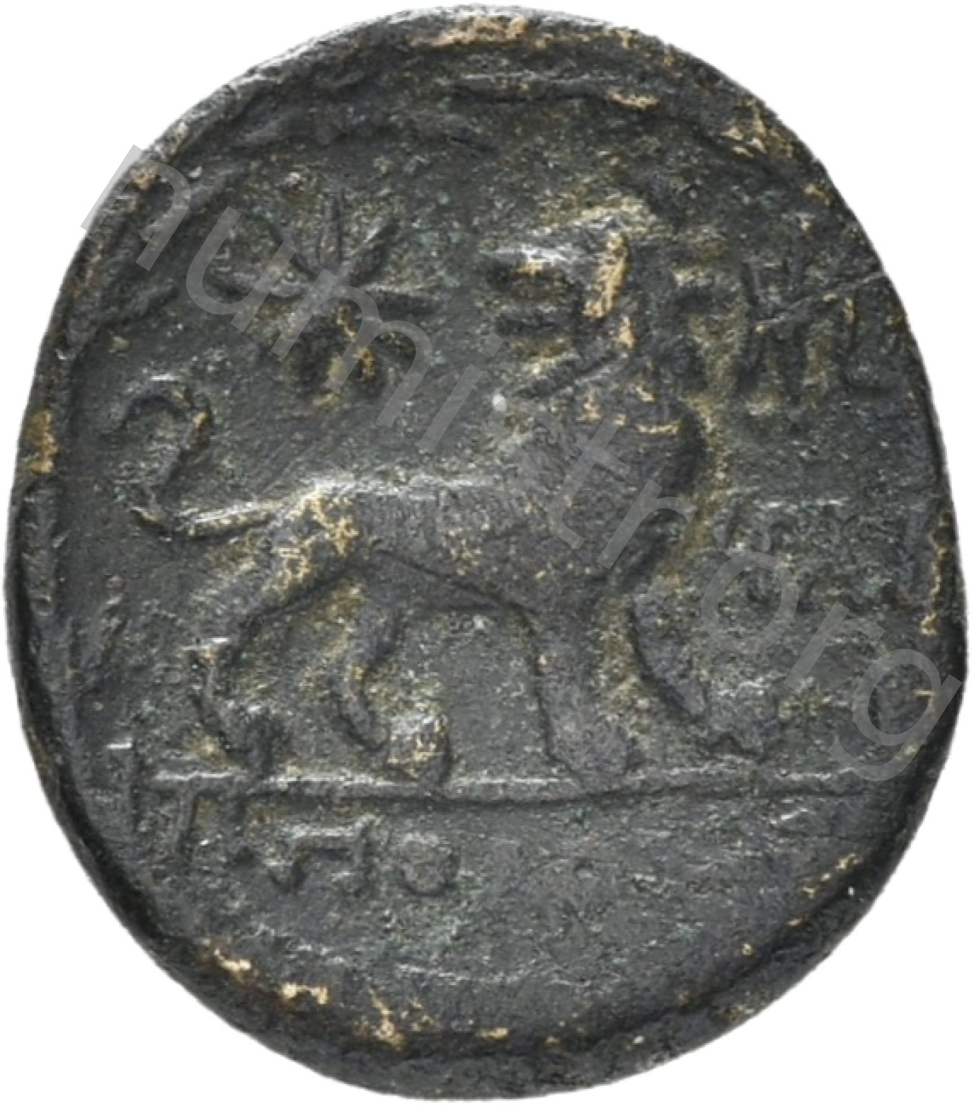 Head of Apollo wearing a laurel wreath in a round border of dots -[en]