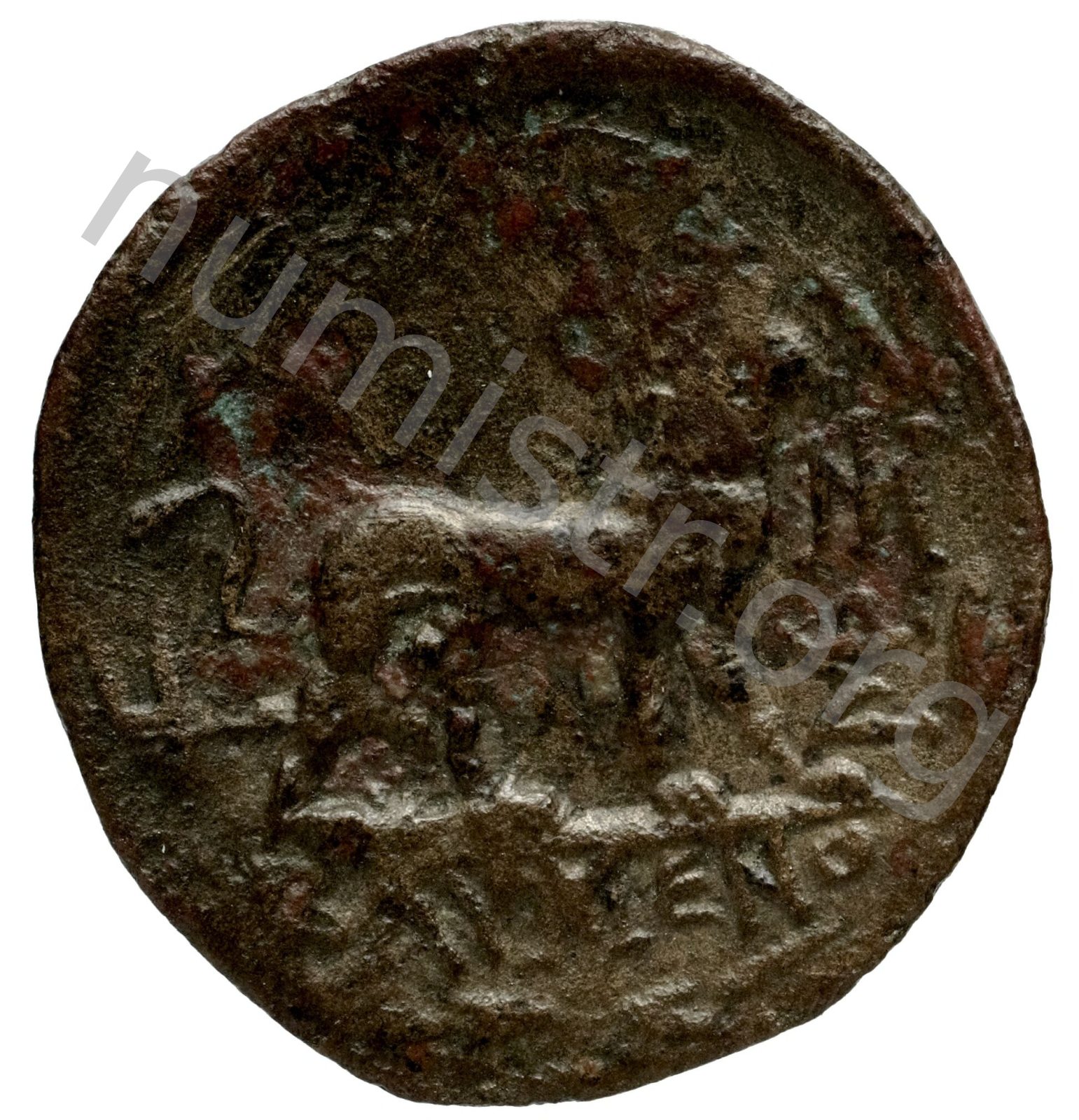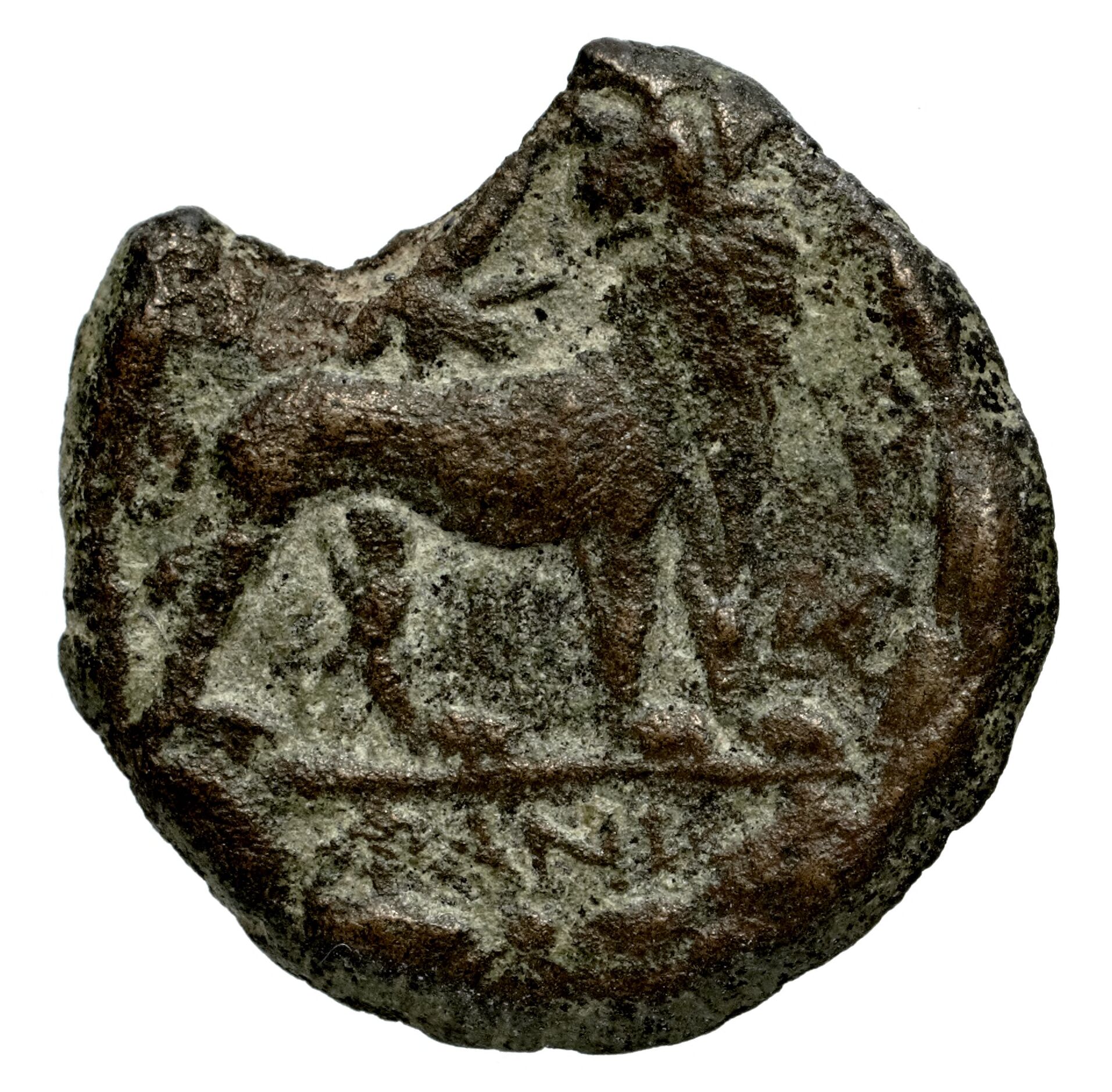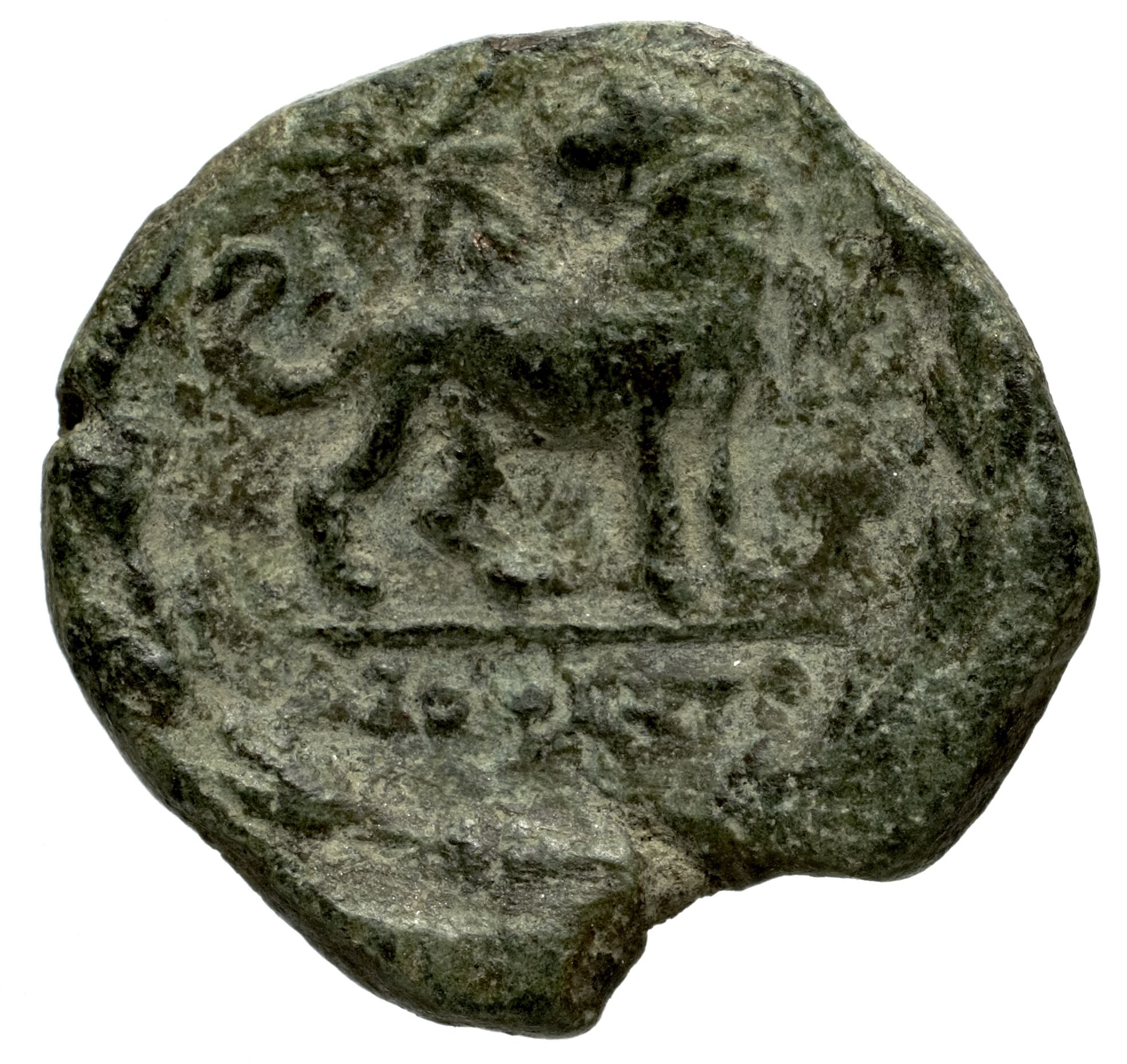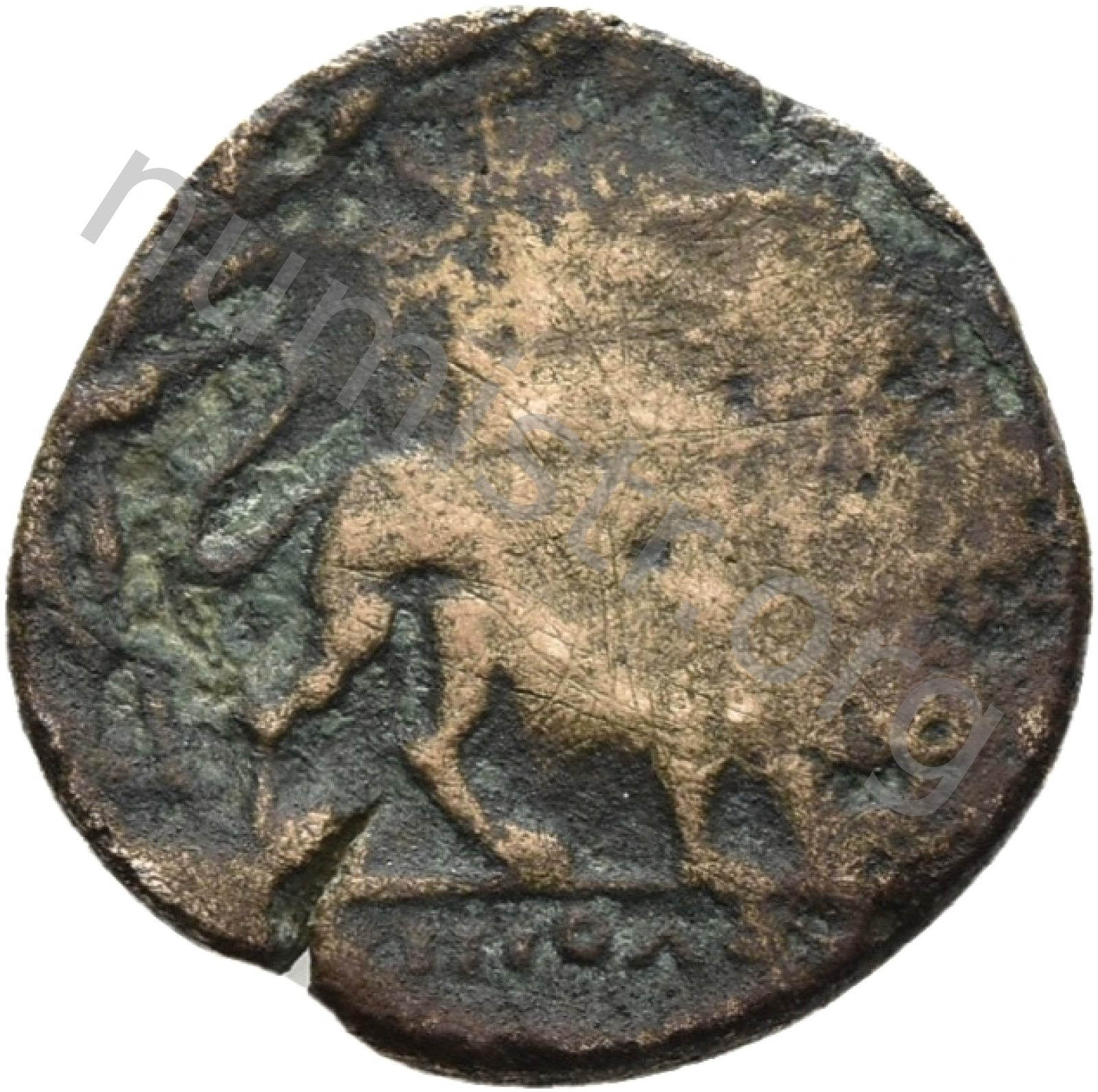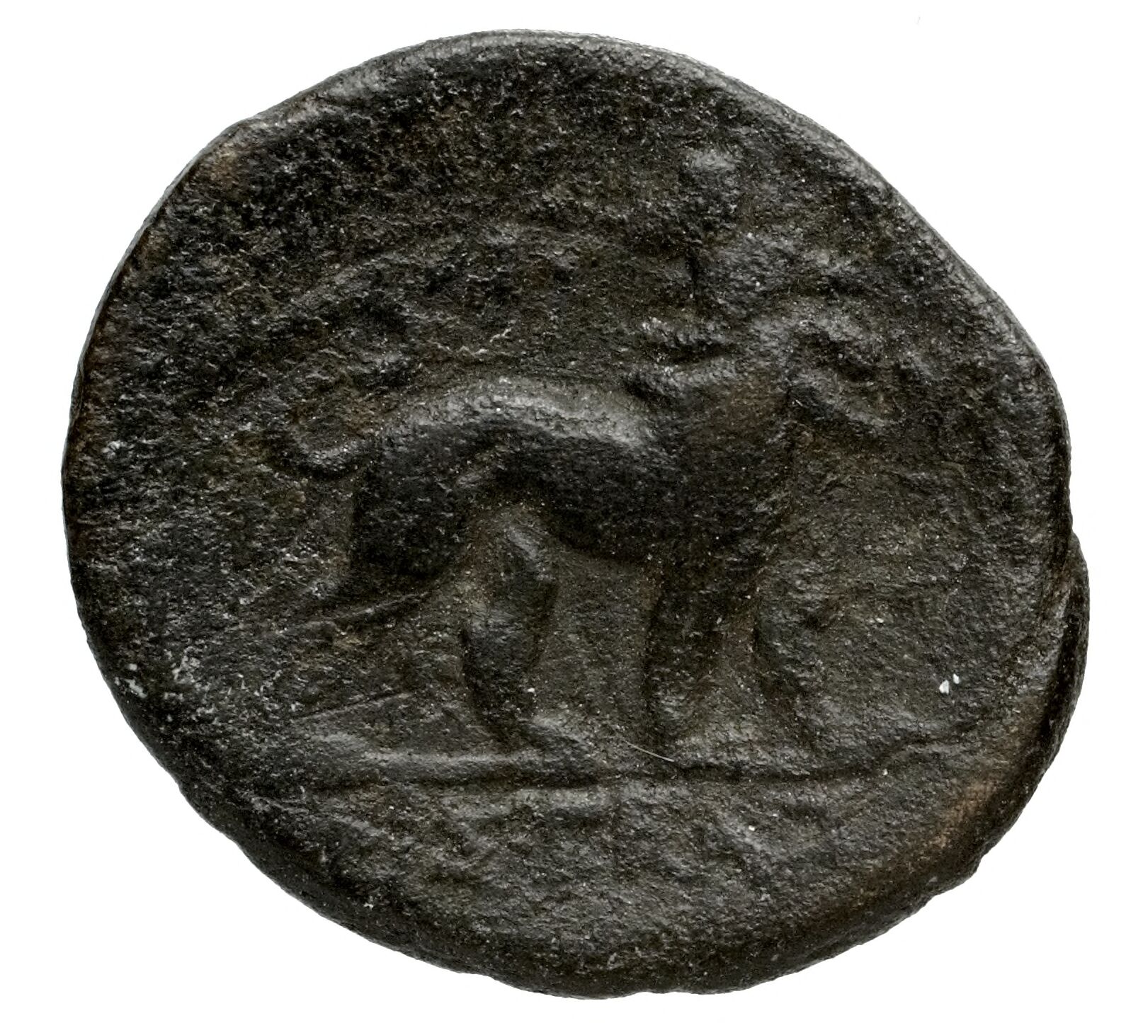 Head of Apollo wearing a laurel wreath in a round border of dots -[en]
