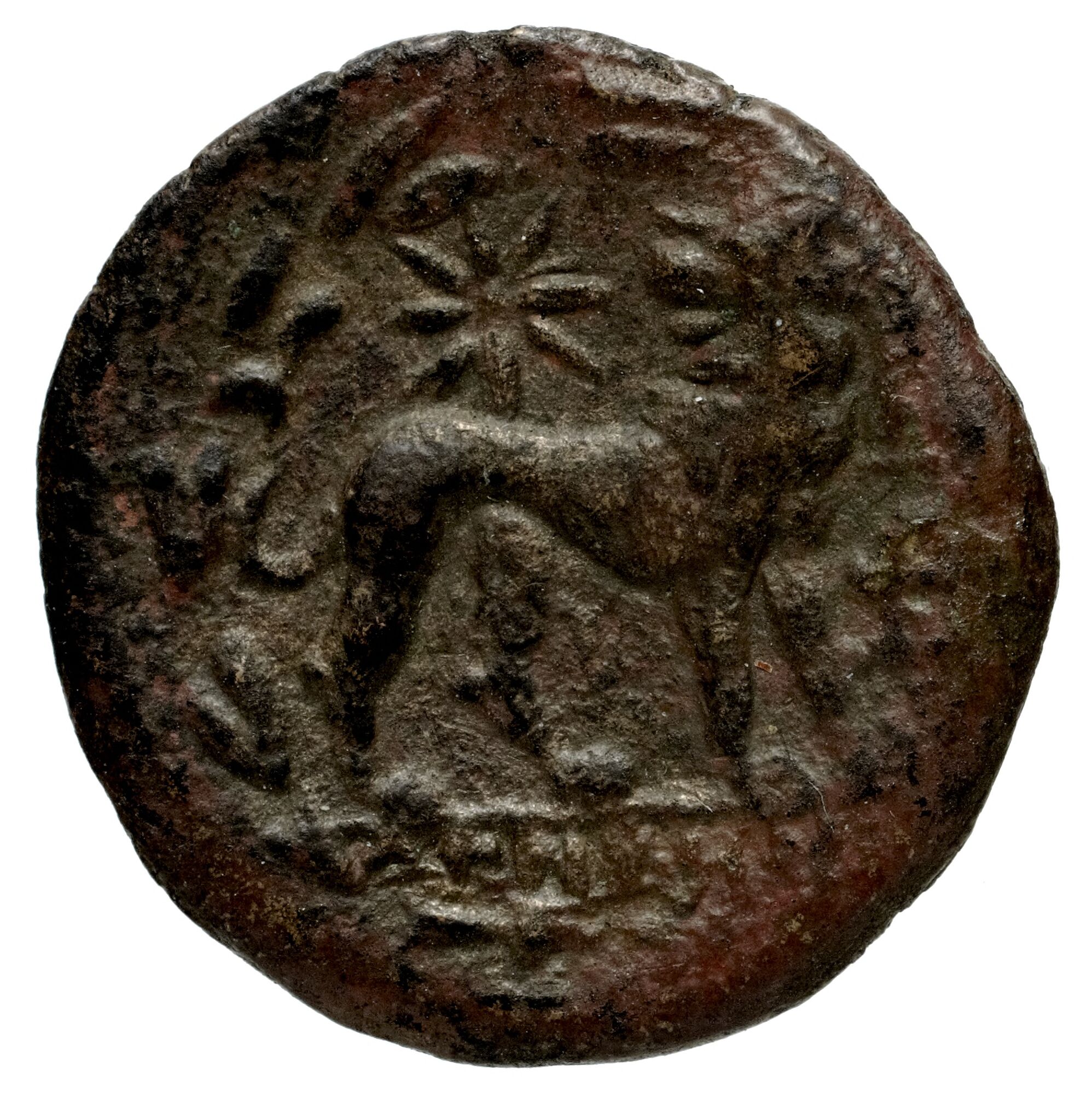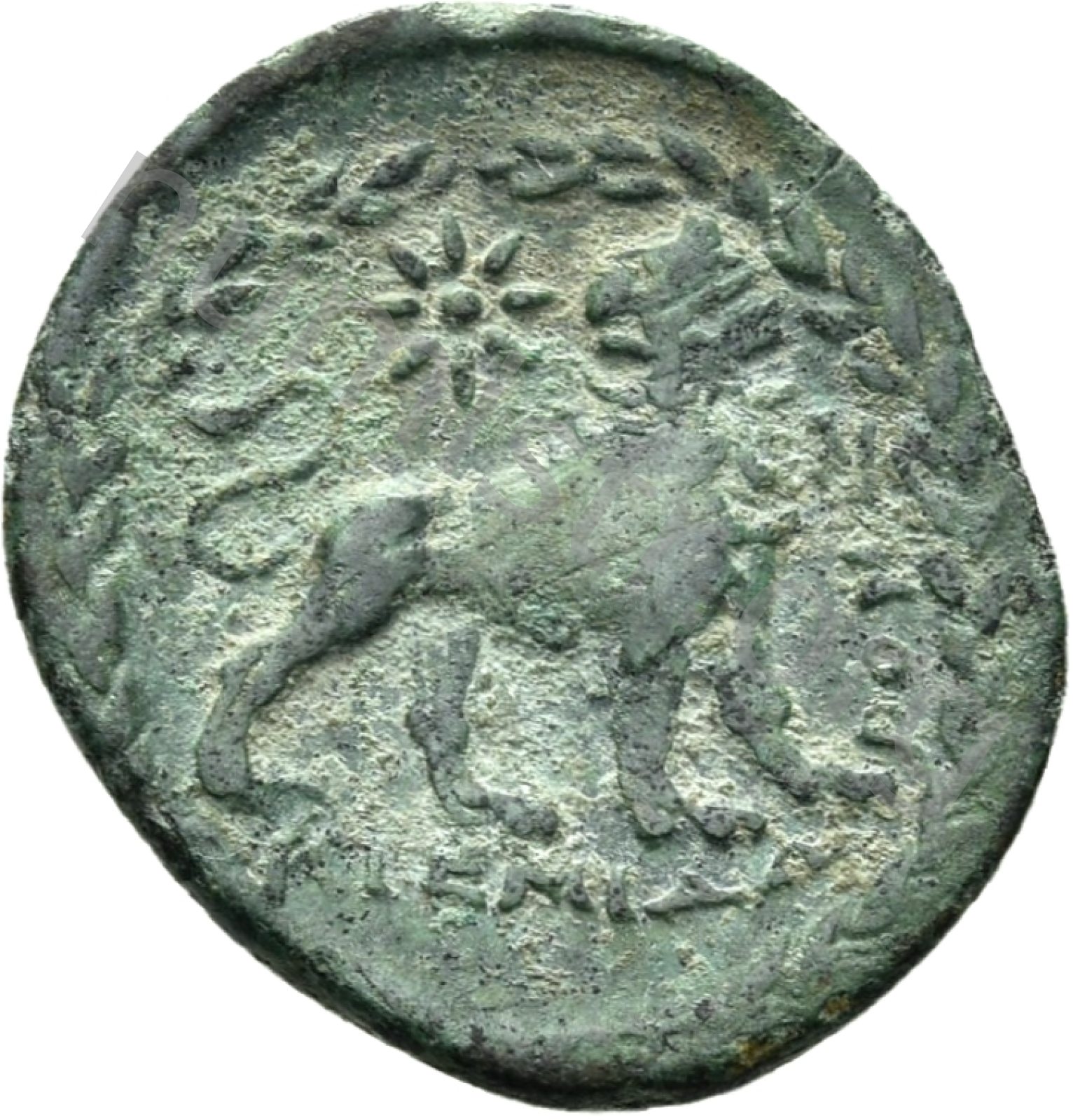 Başını çeviren aslan; üst alanda yıldız; hepsi defne çelengi içinde