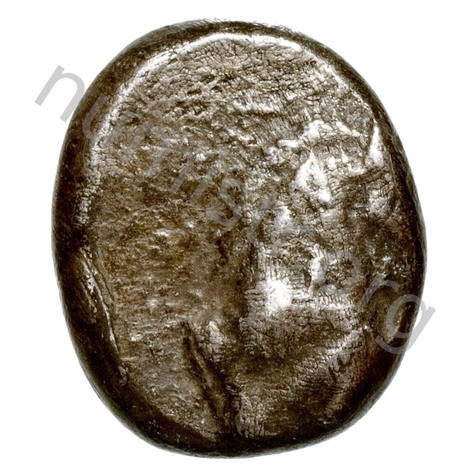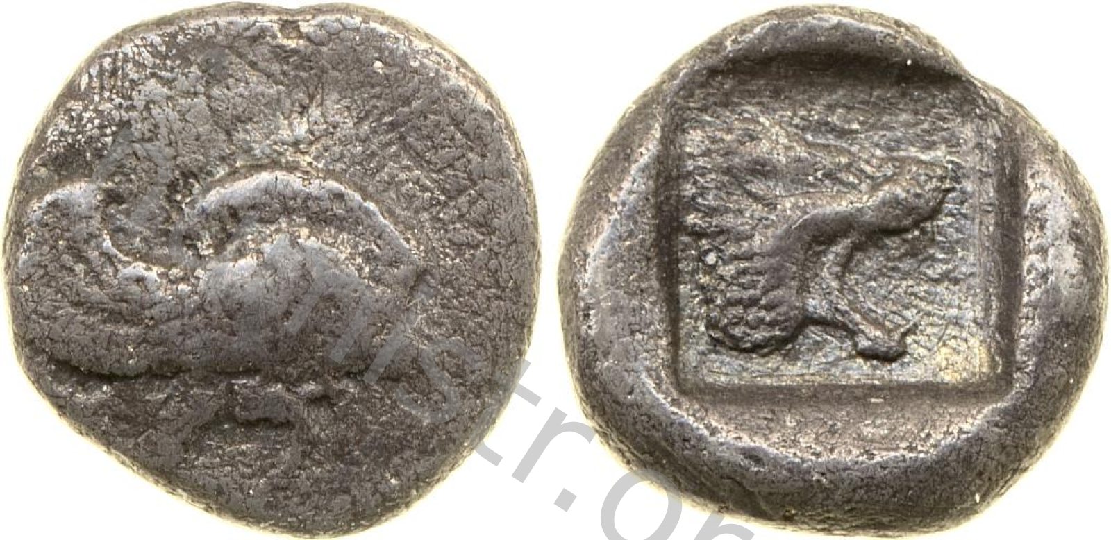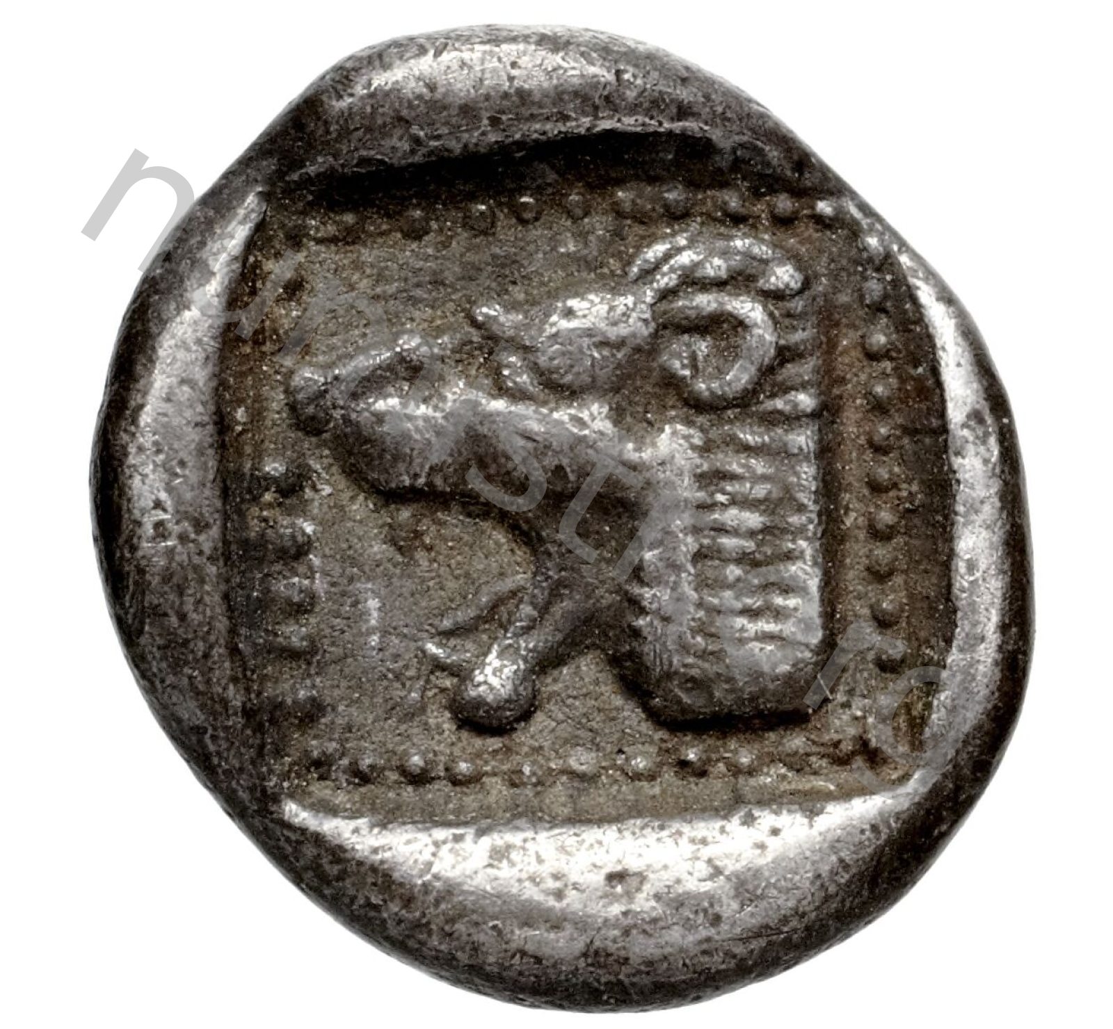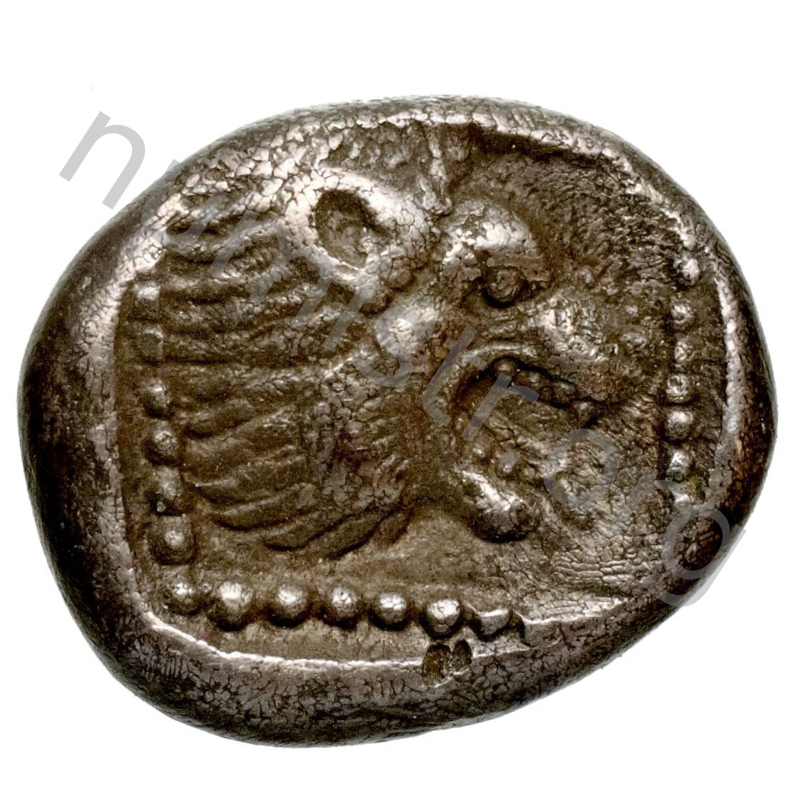 Head of a lion roaring in an incuse square with dotted border -[en]