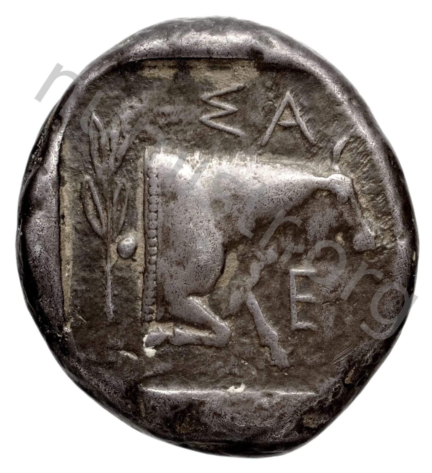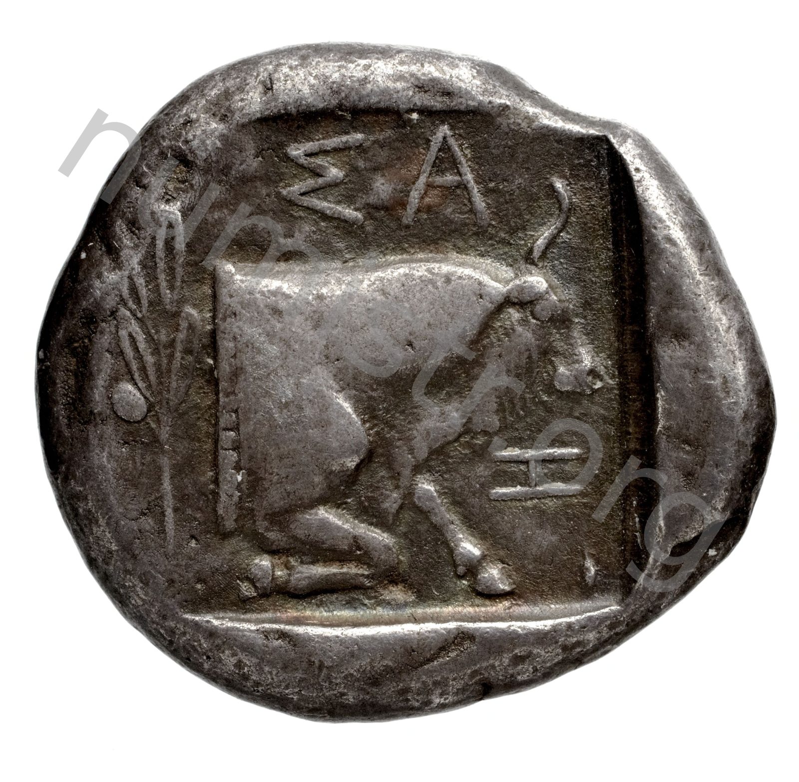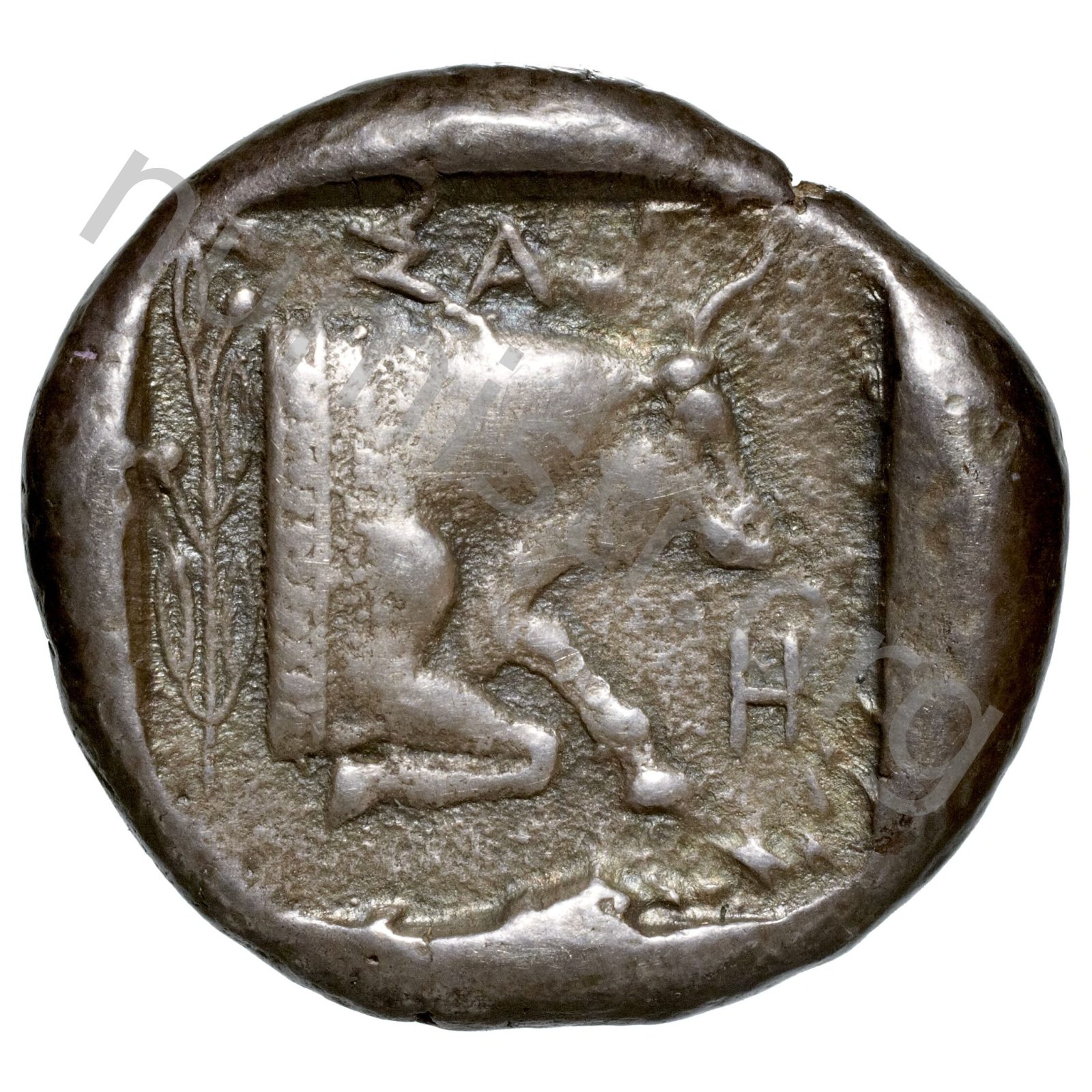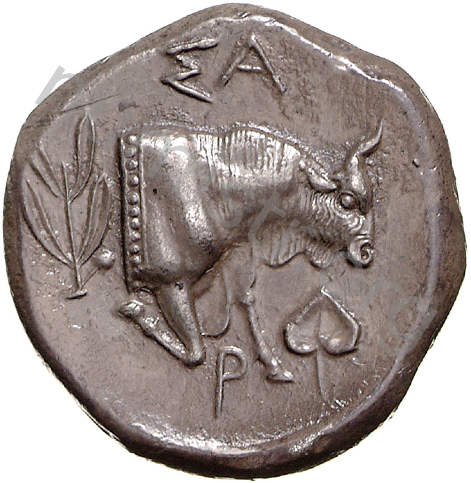 Forepart of a bull the neck adorned with a collar; in the field olive branch; all in an incuse square -[en]