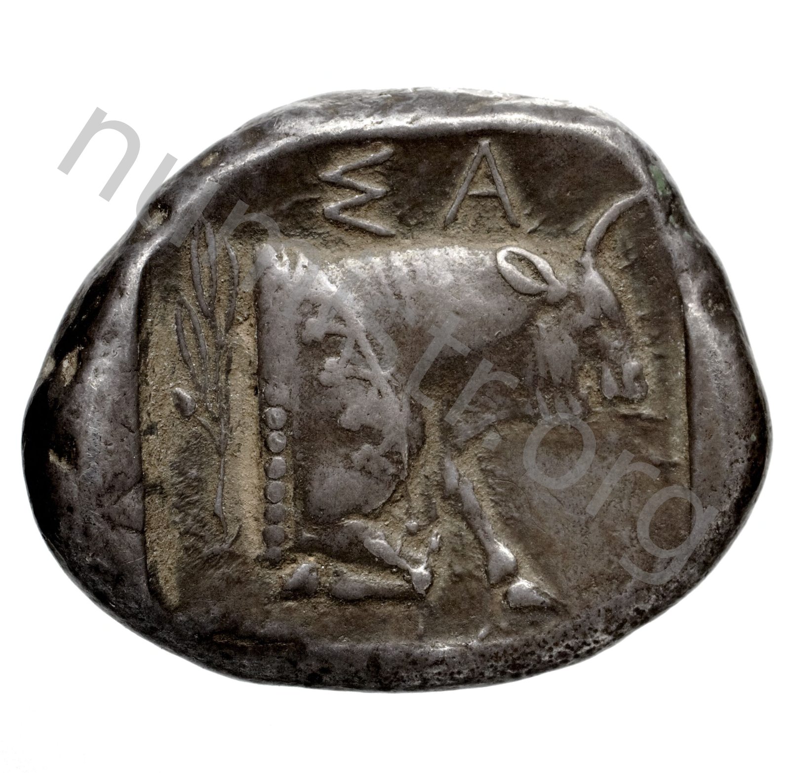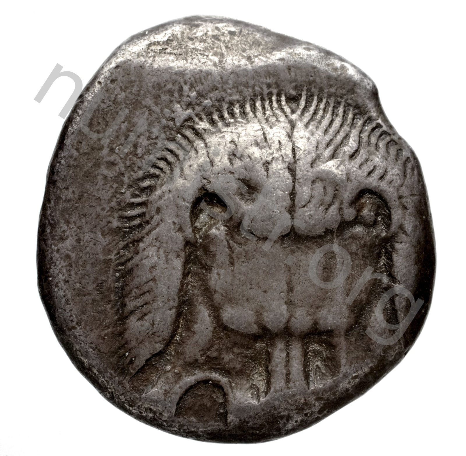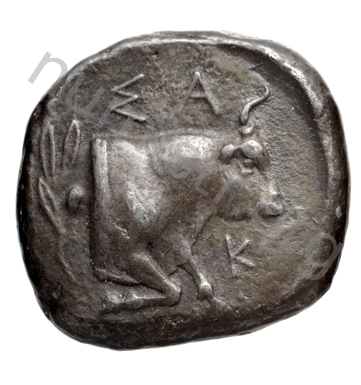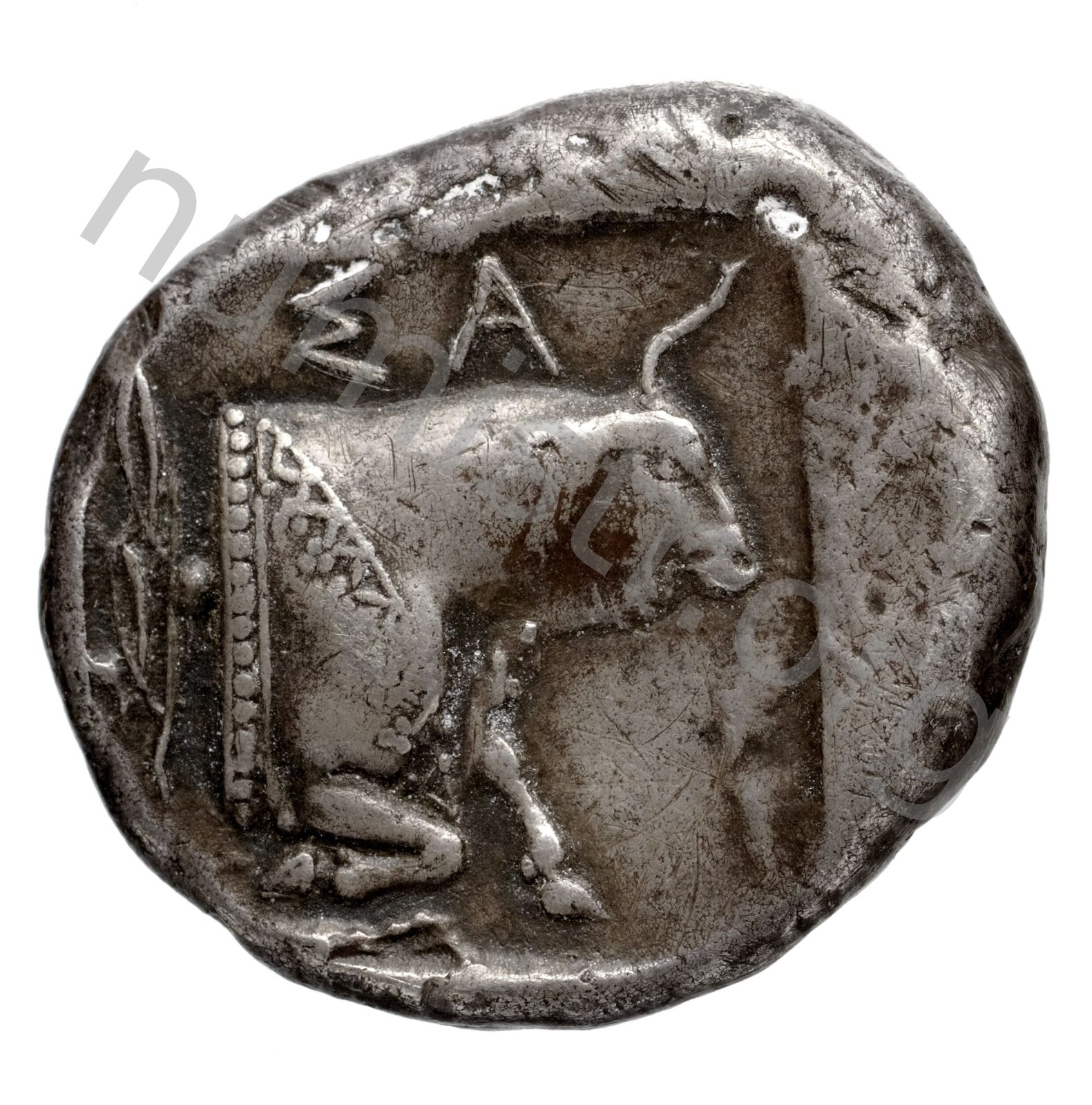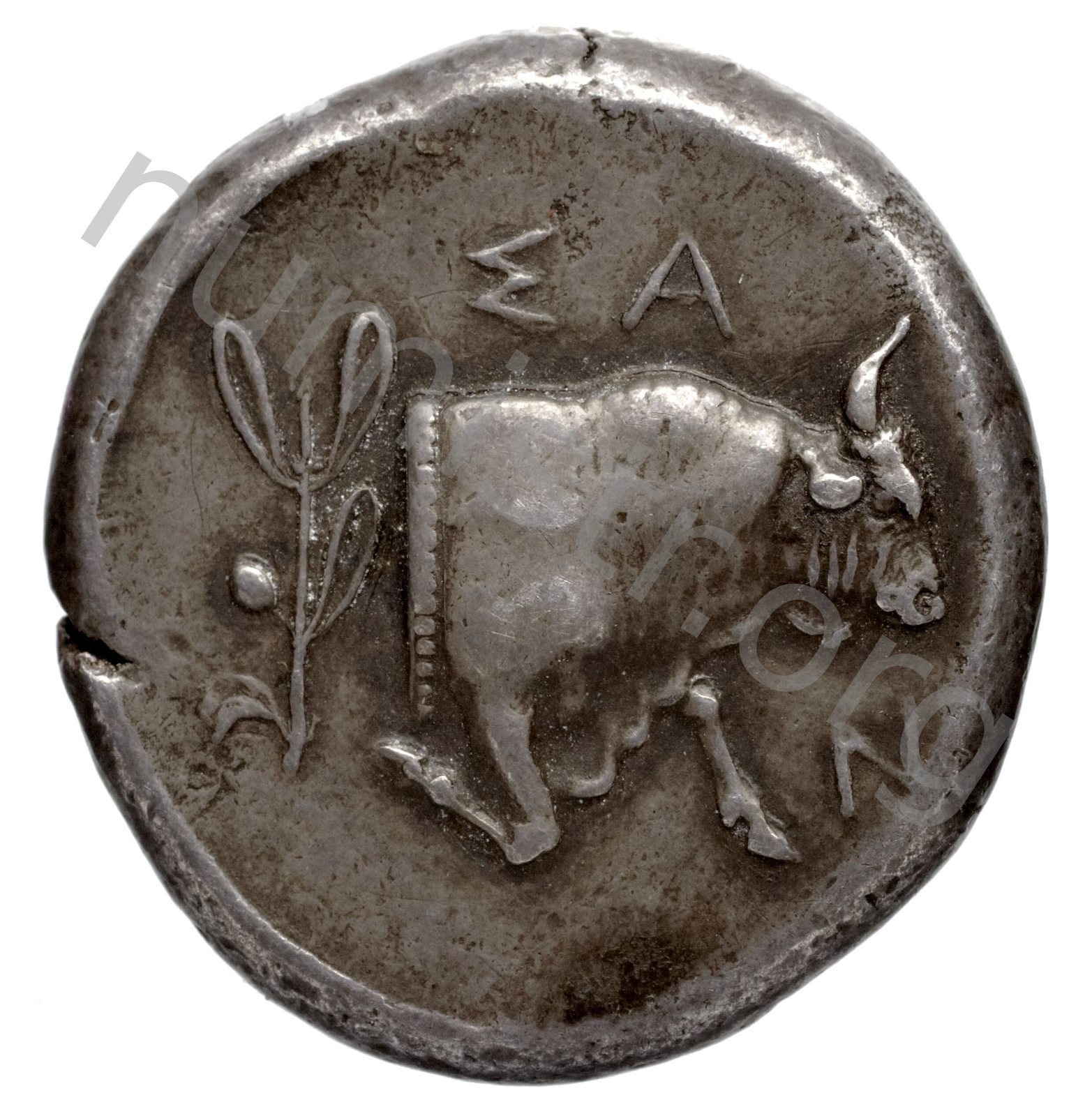 Forepart of a bull the neck adorned with a collar; in the field olive branch; all in an incuse square -[en]
