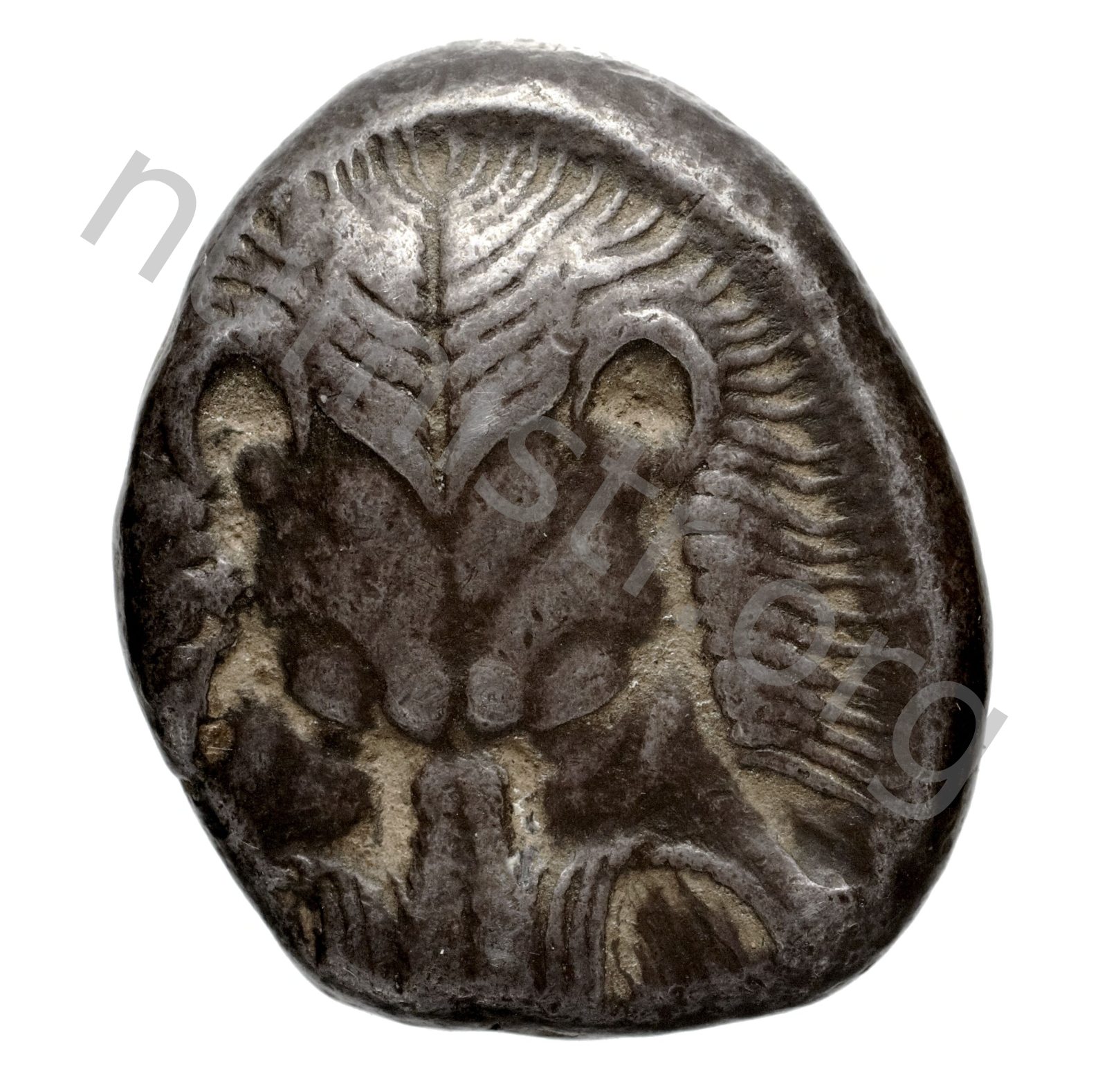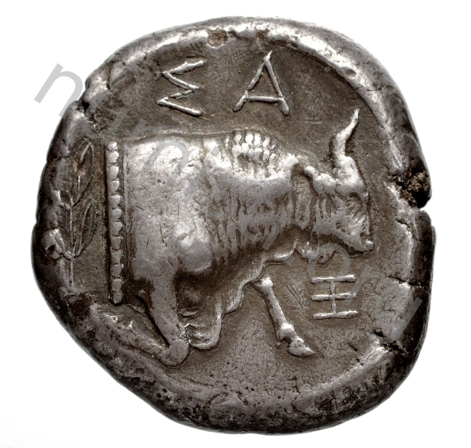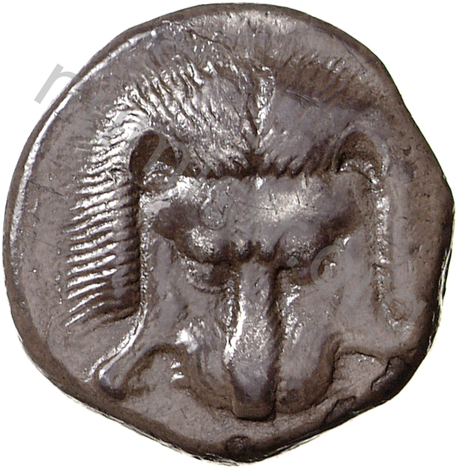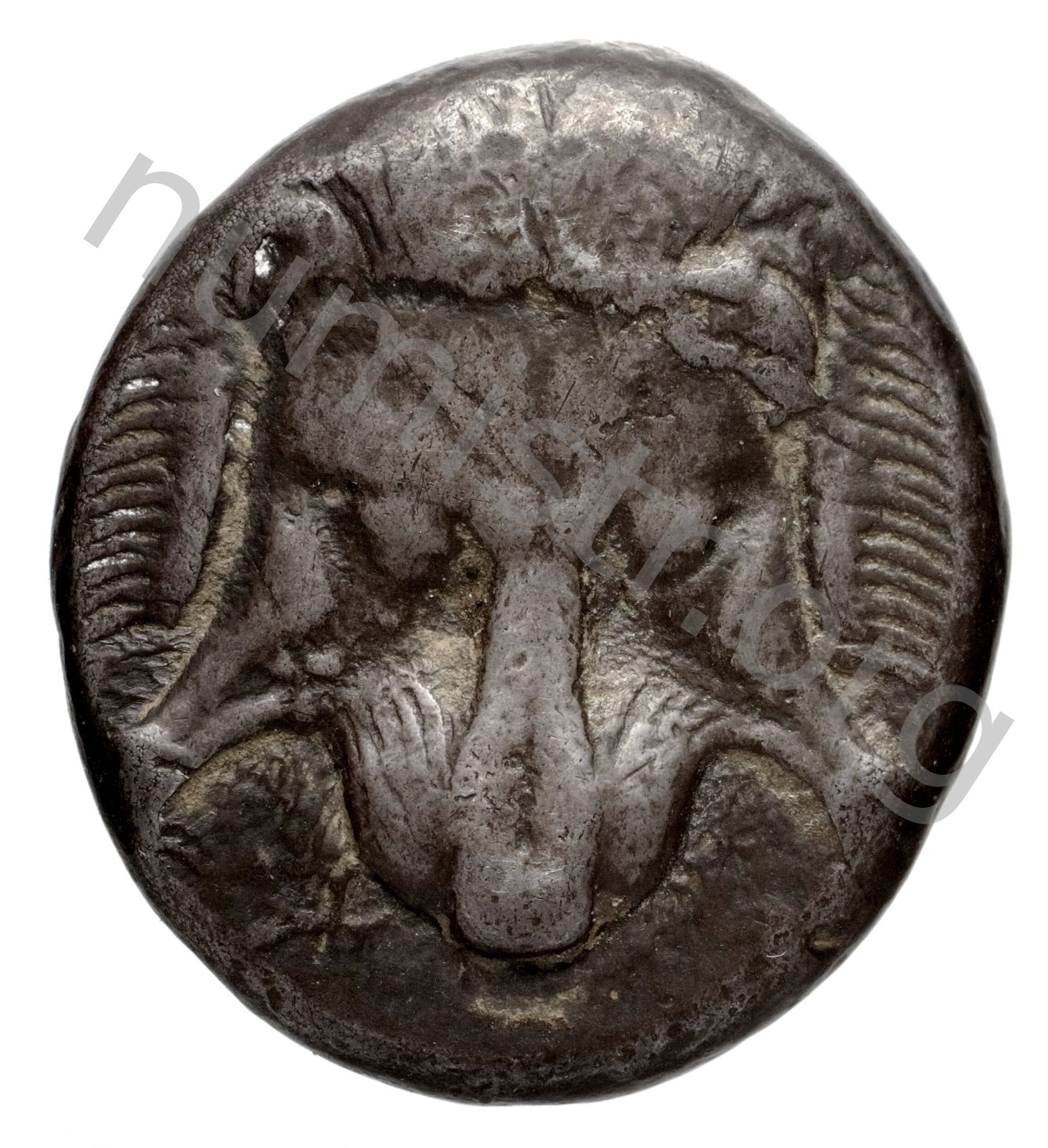 Forepart of a bull the neck adorned with a collar; in the field olive branch; all in an incuse square -[en]