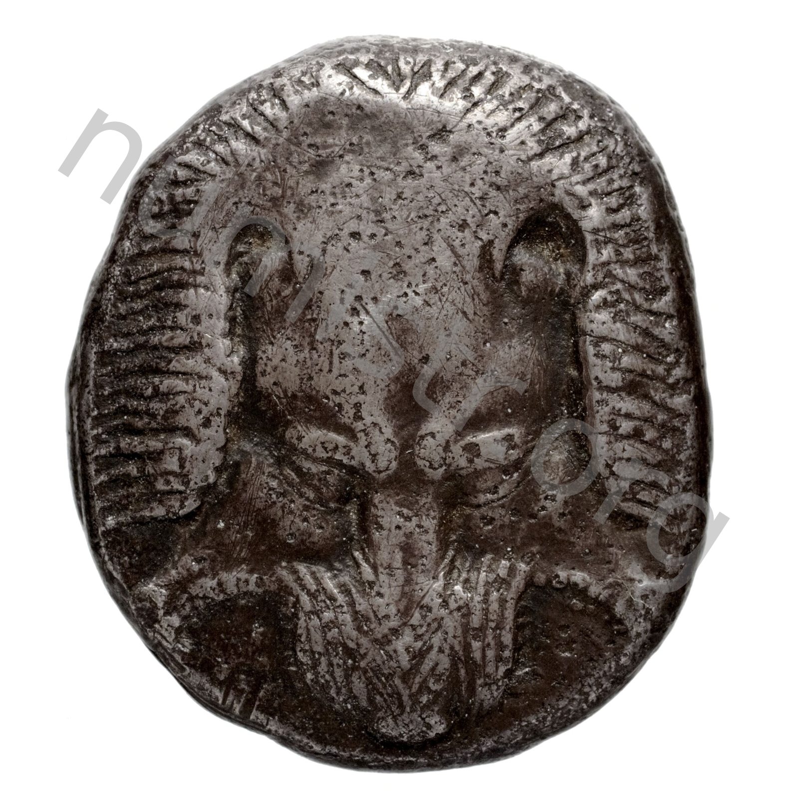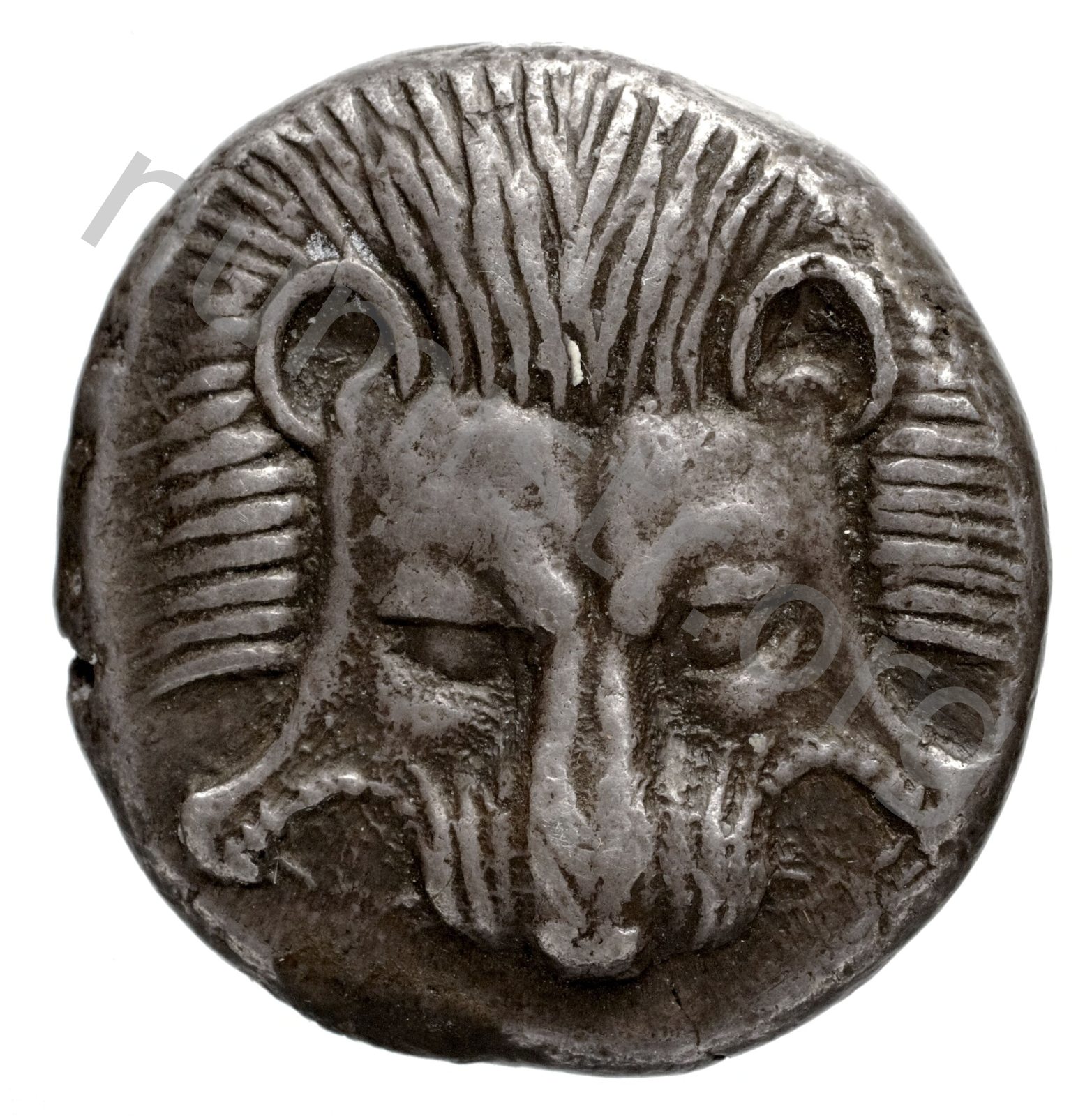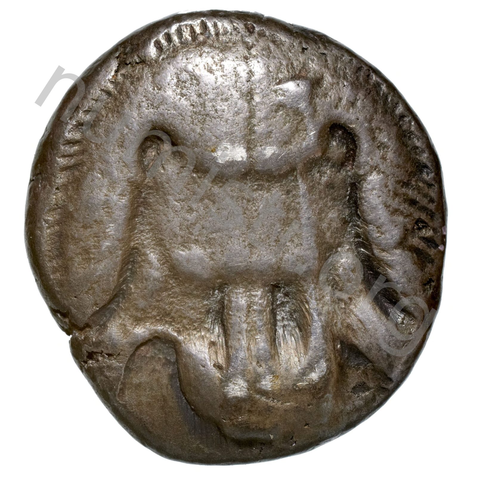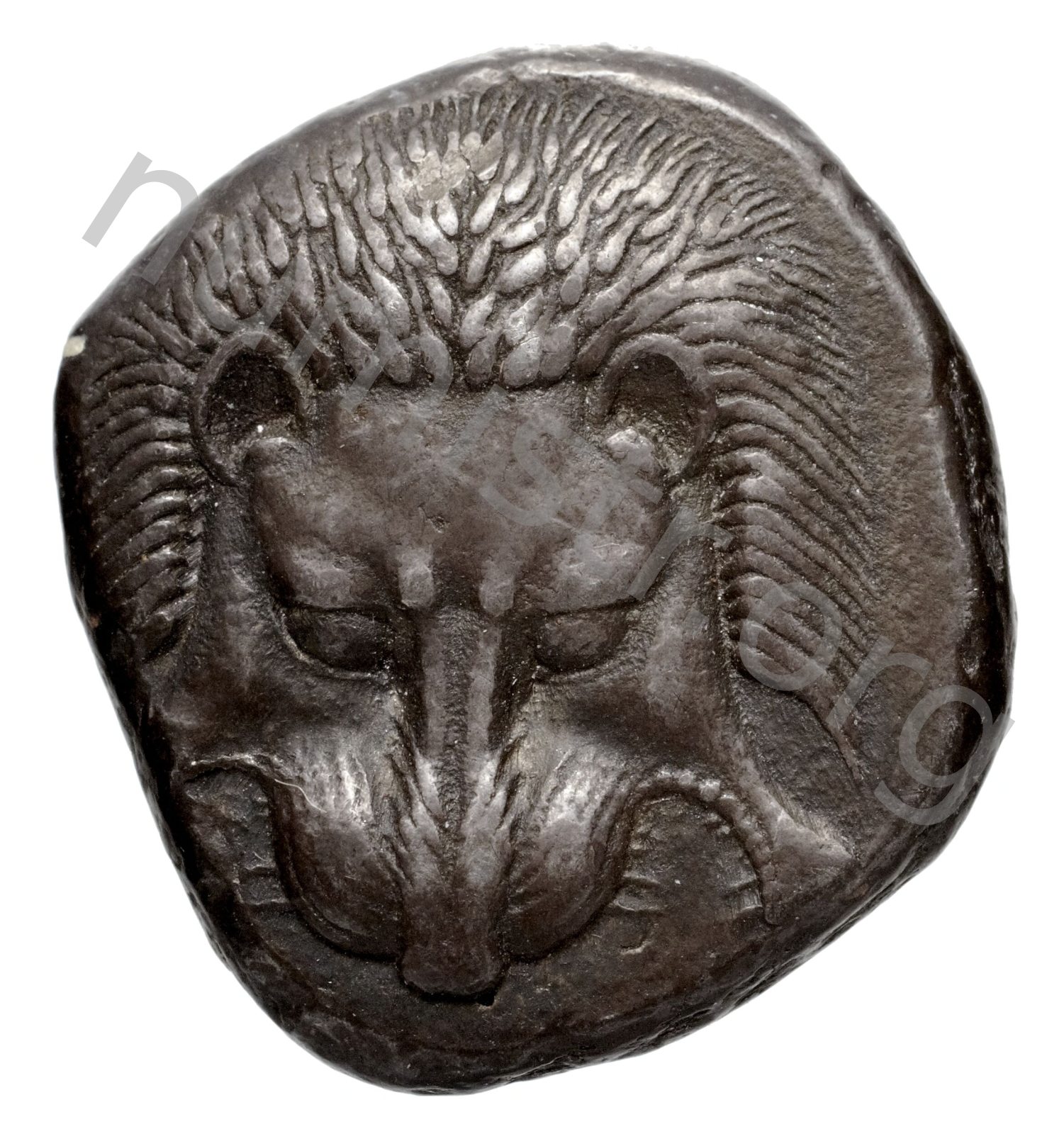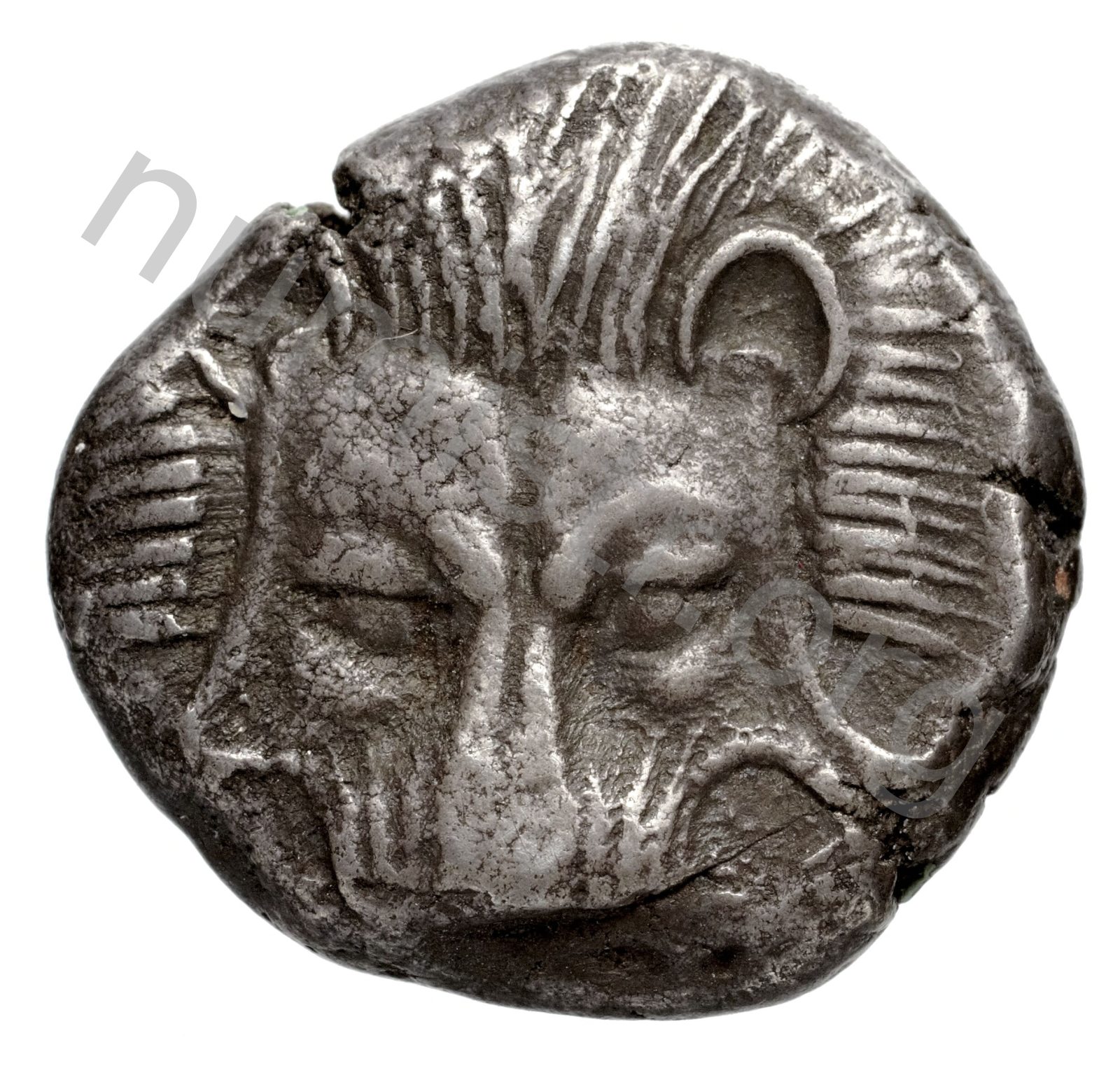 Forepart of a bull the neck adorned with a collar; in the field olive branch; all in an incuse square -[en]