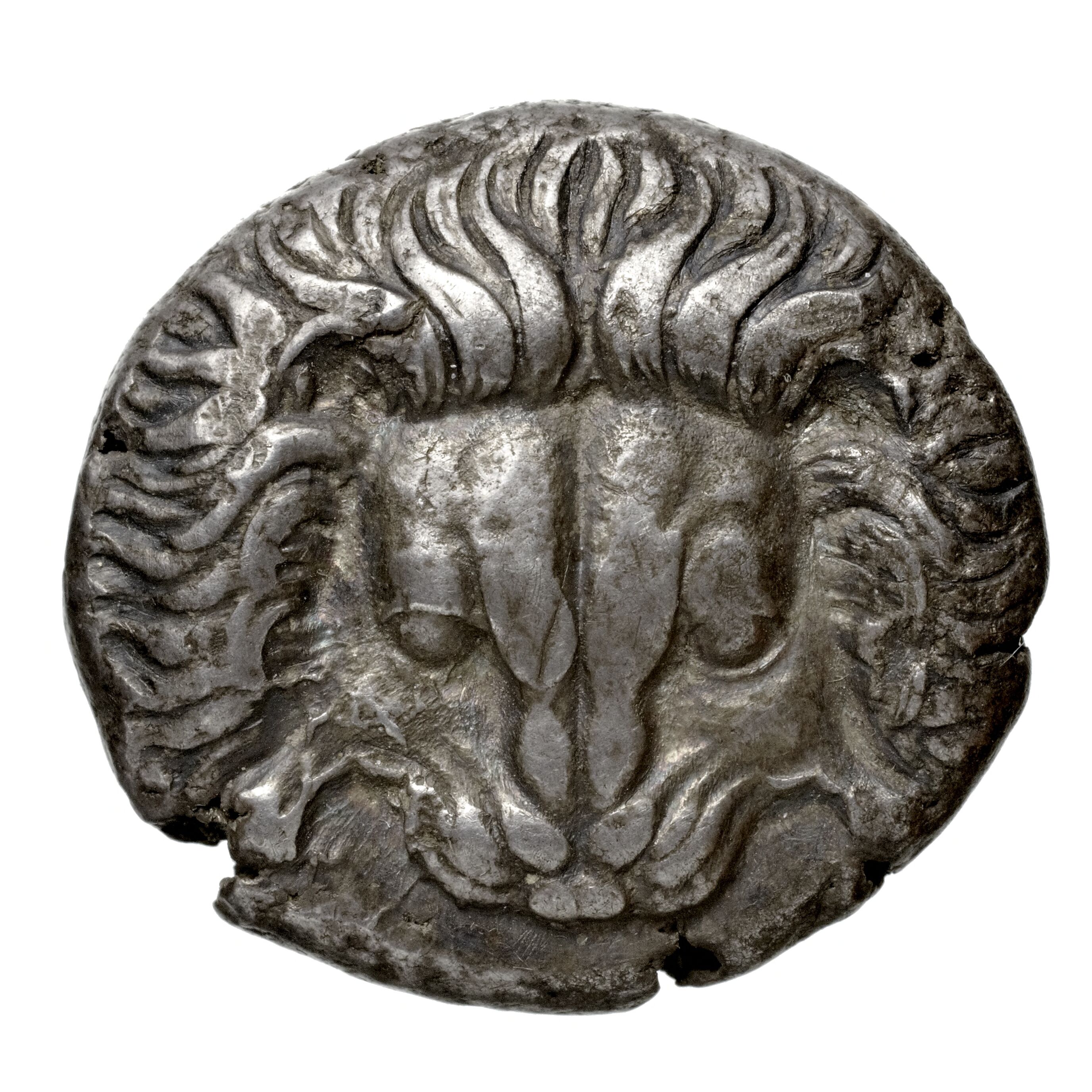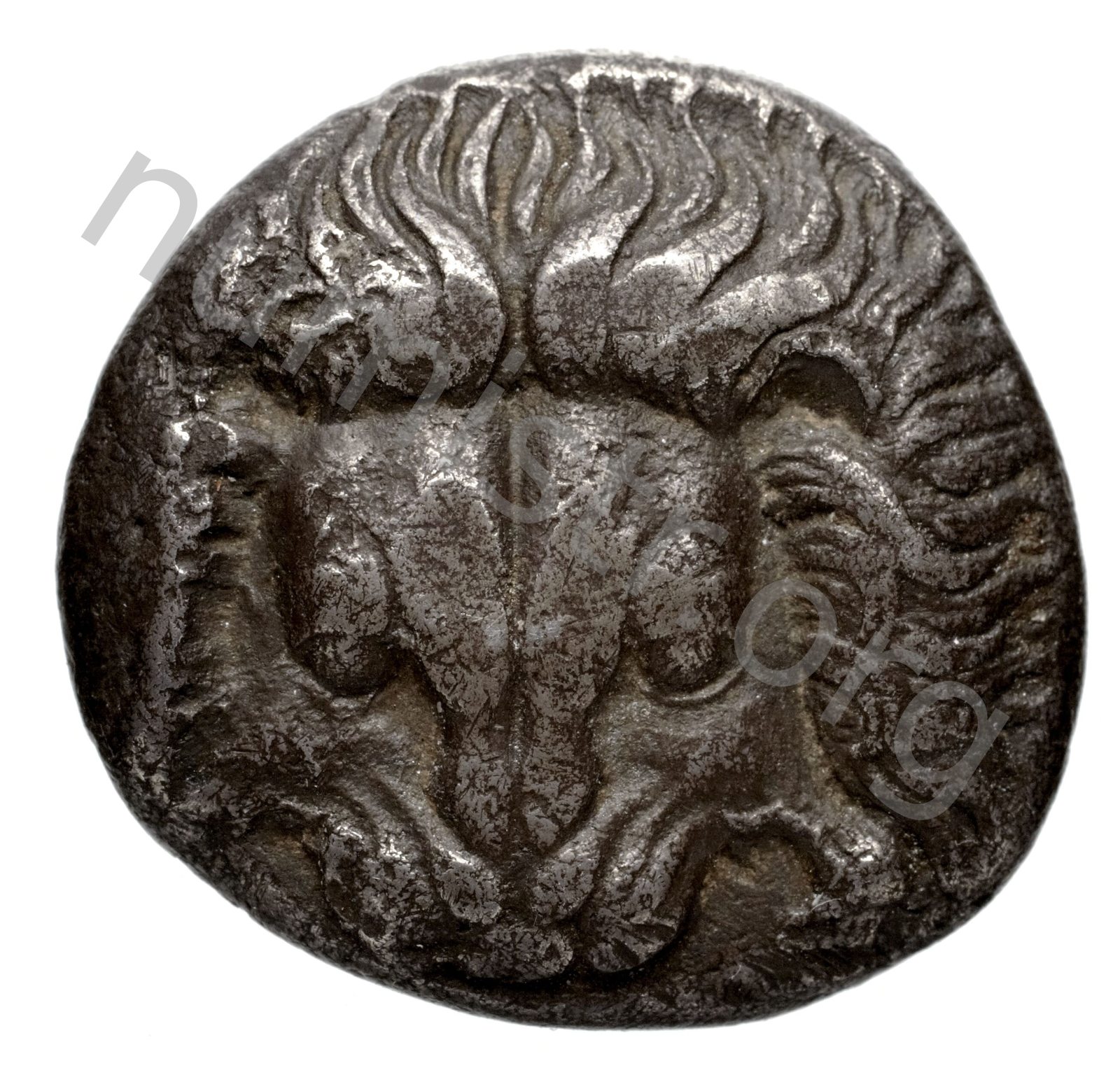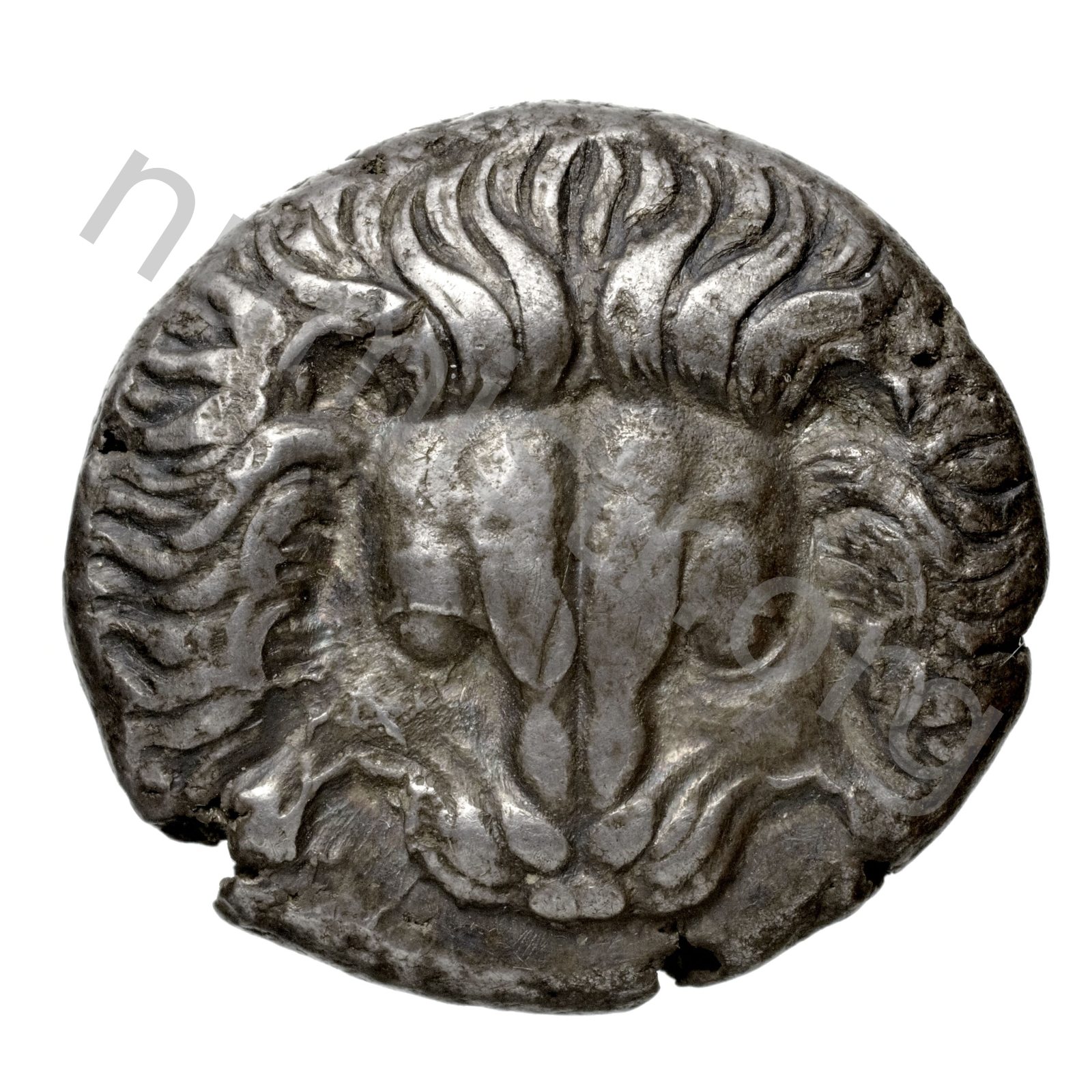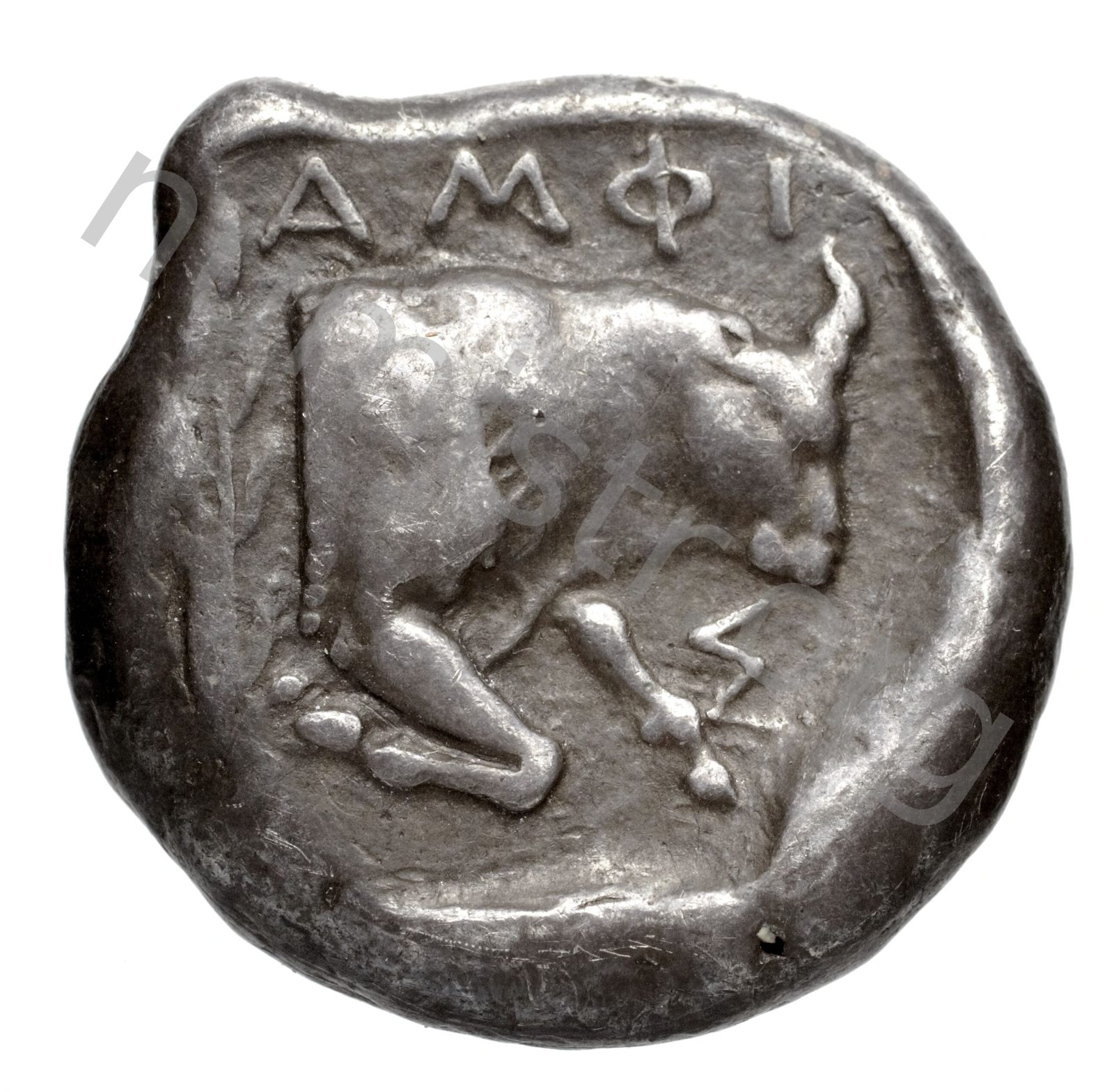 Forepart of a bull the neck adorned with a collar; all in an incuse square -[en]