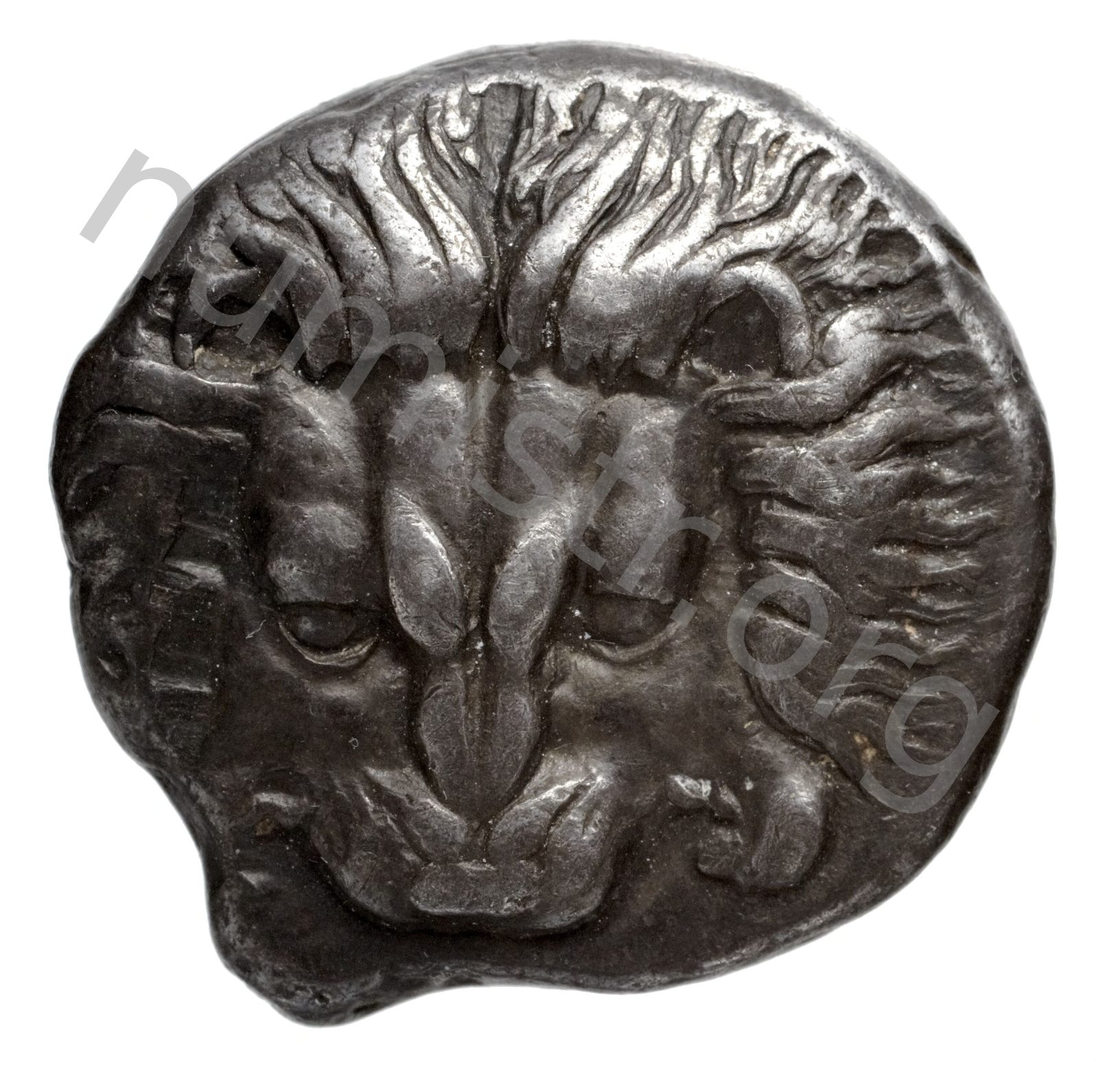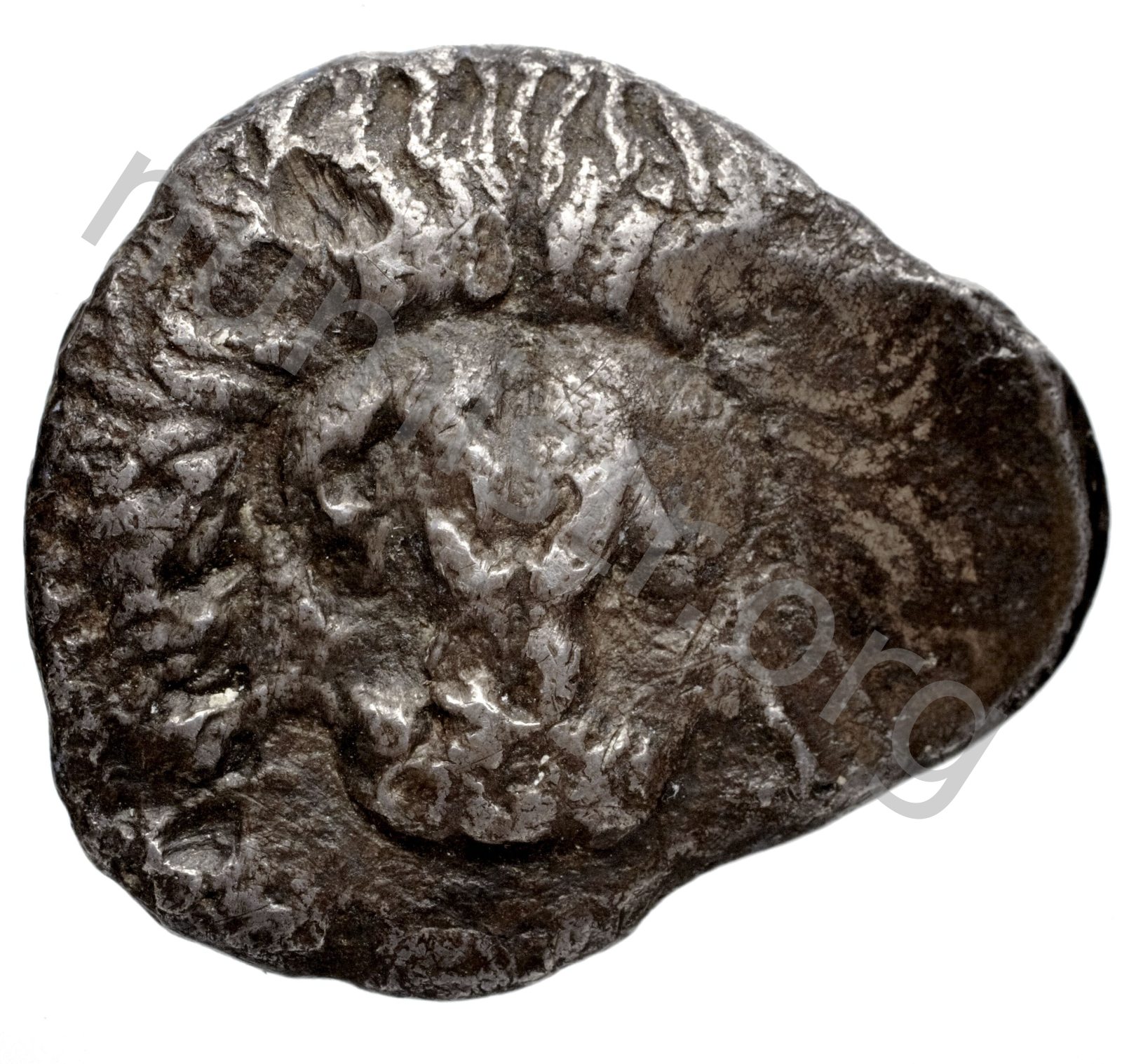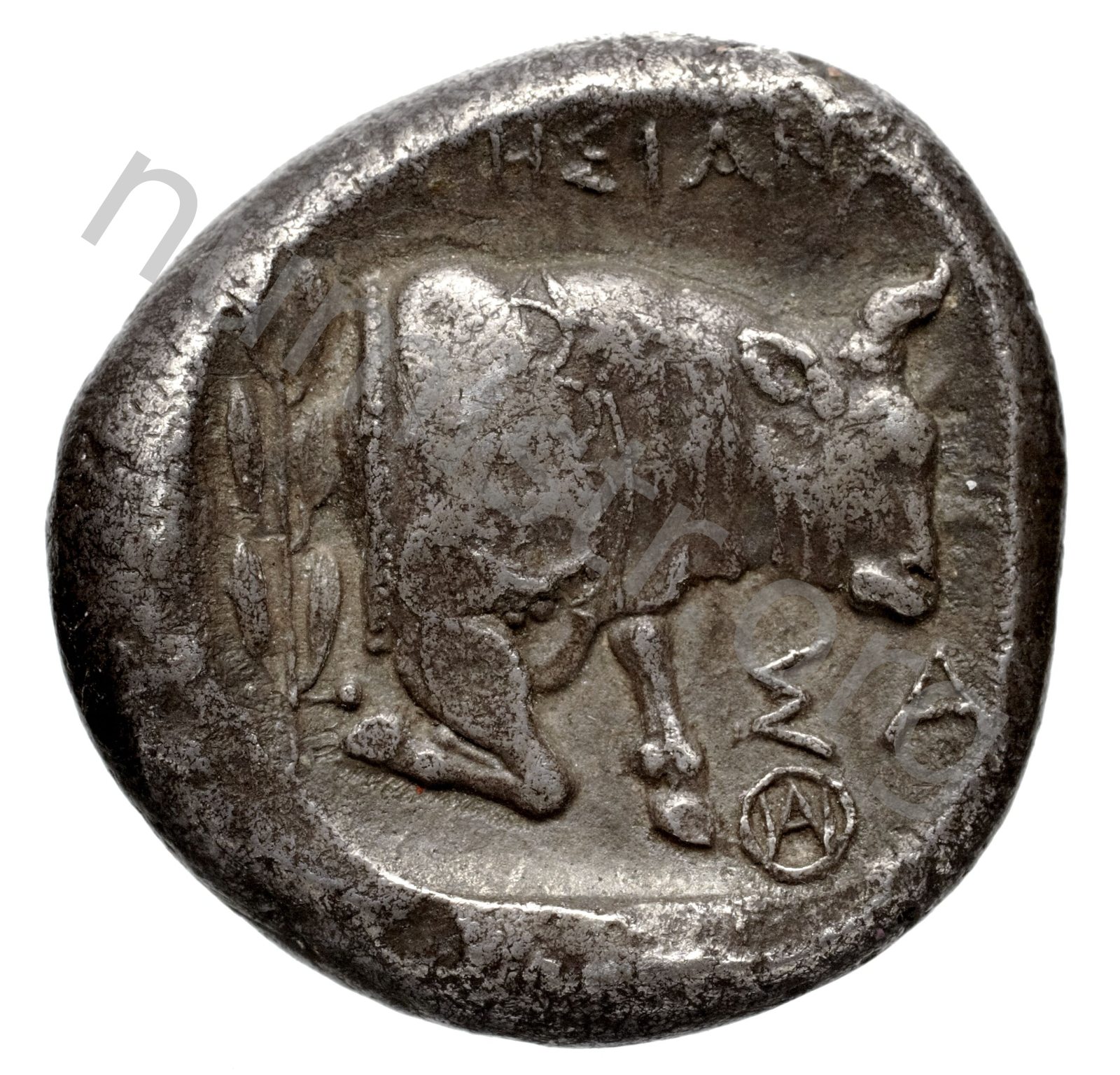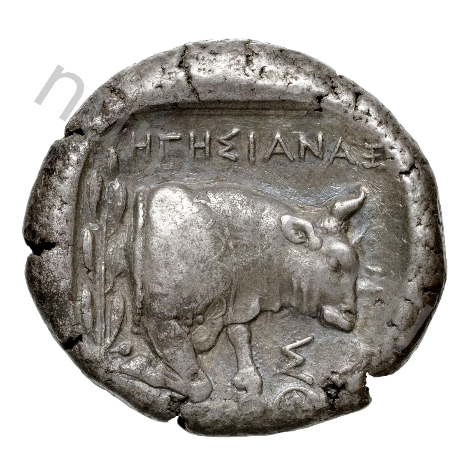 Forepart of a bull the neck adorned with a collar; all in an incuse square -[en]