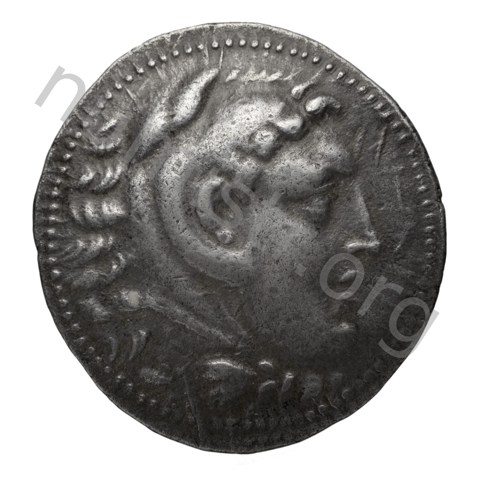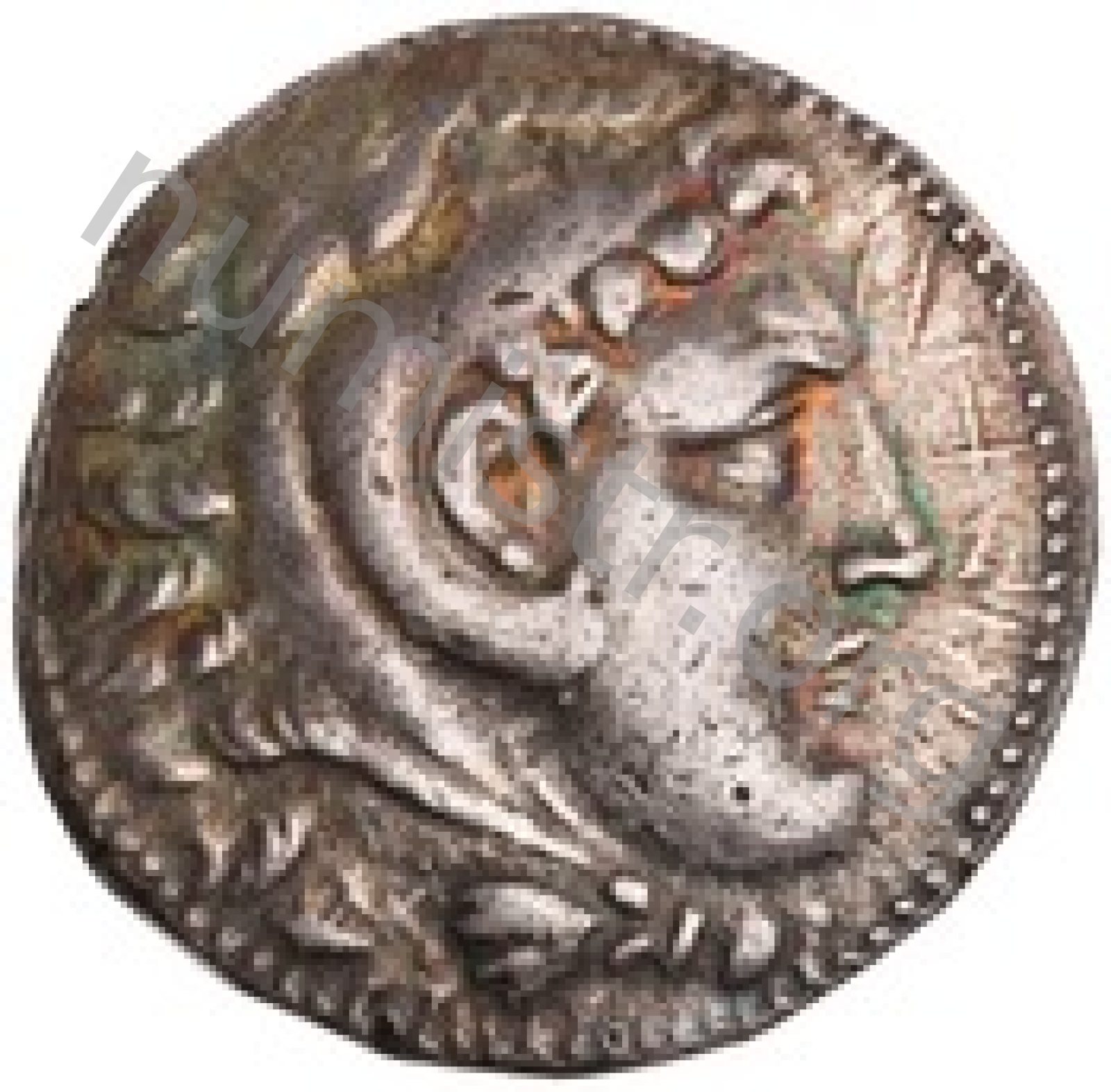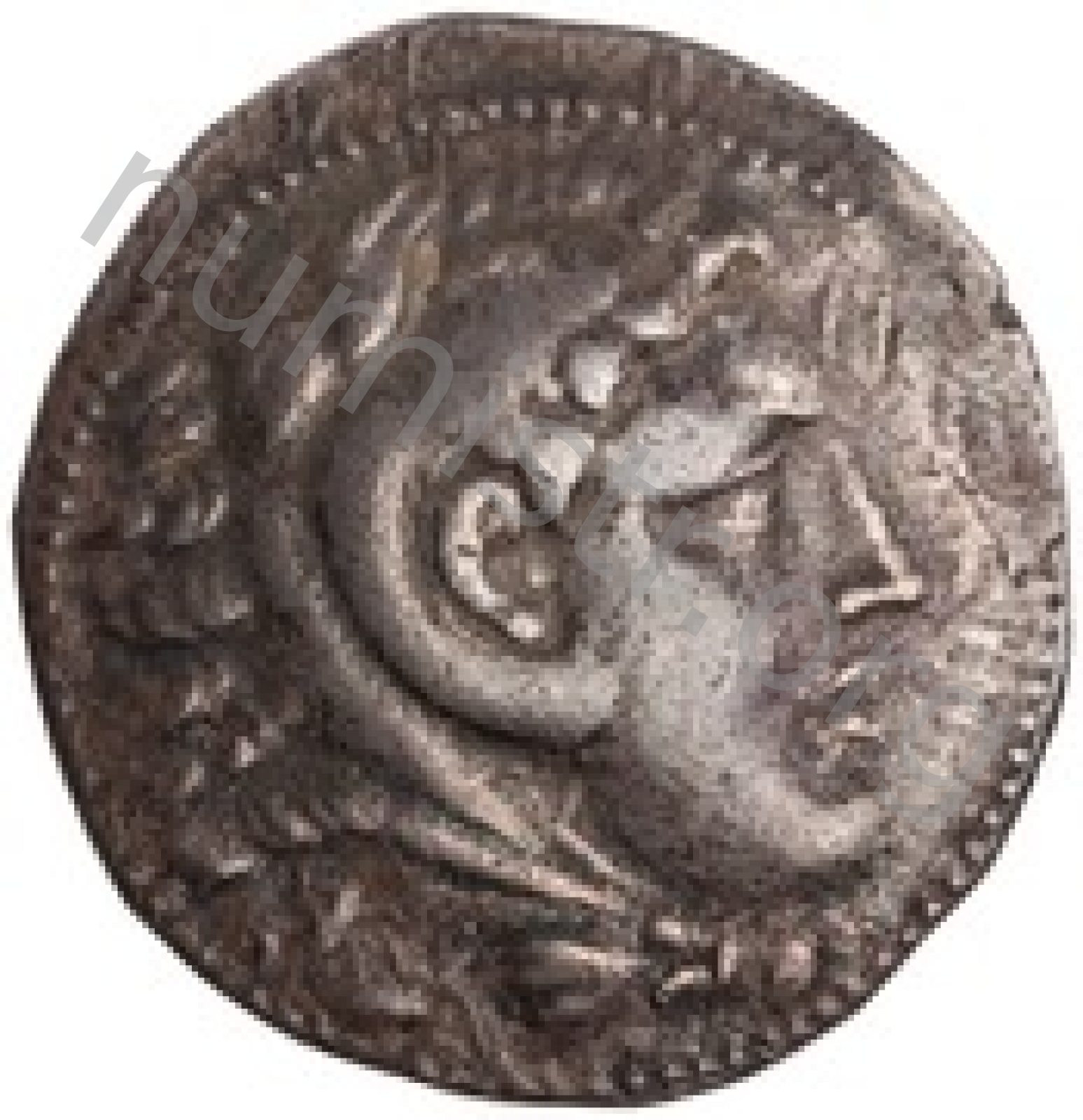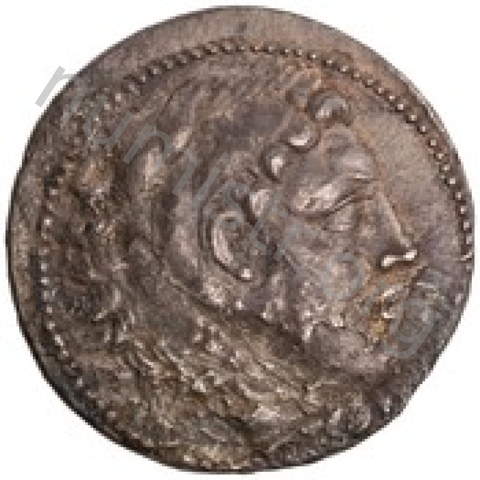Head of beardless Heracles right wearing lion skin headdress -[en]