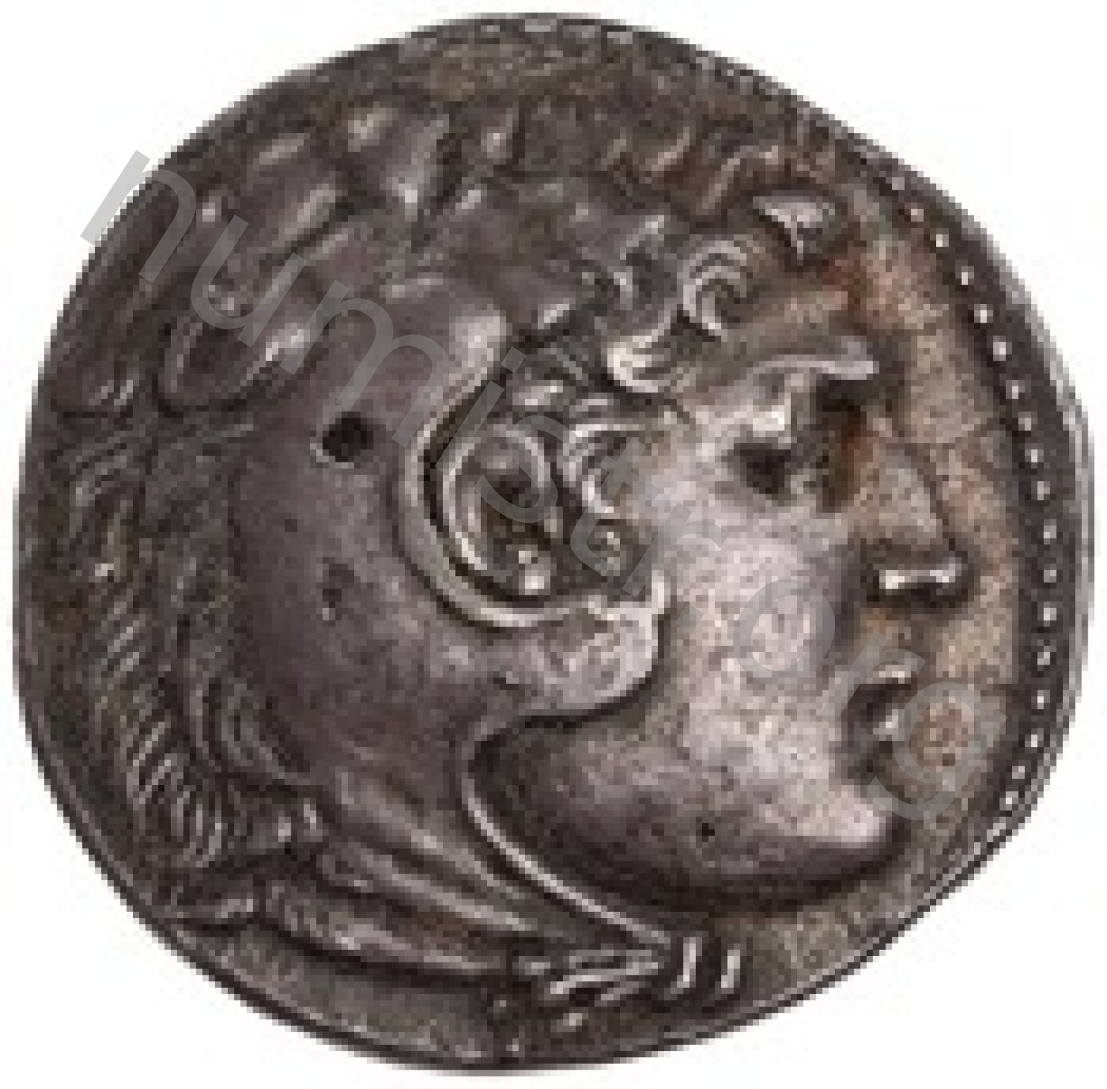Head of beardless Heracles right wearing lion skin headdress -[en]