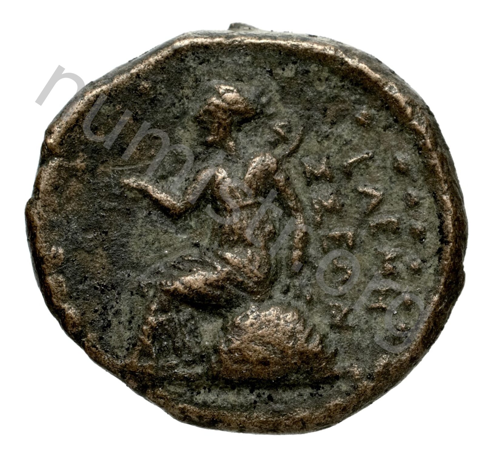 Apollo sitting on the omphalos holding an arrow and leaning on bow -[en]