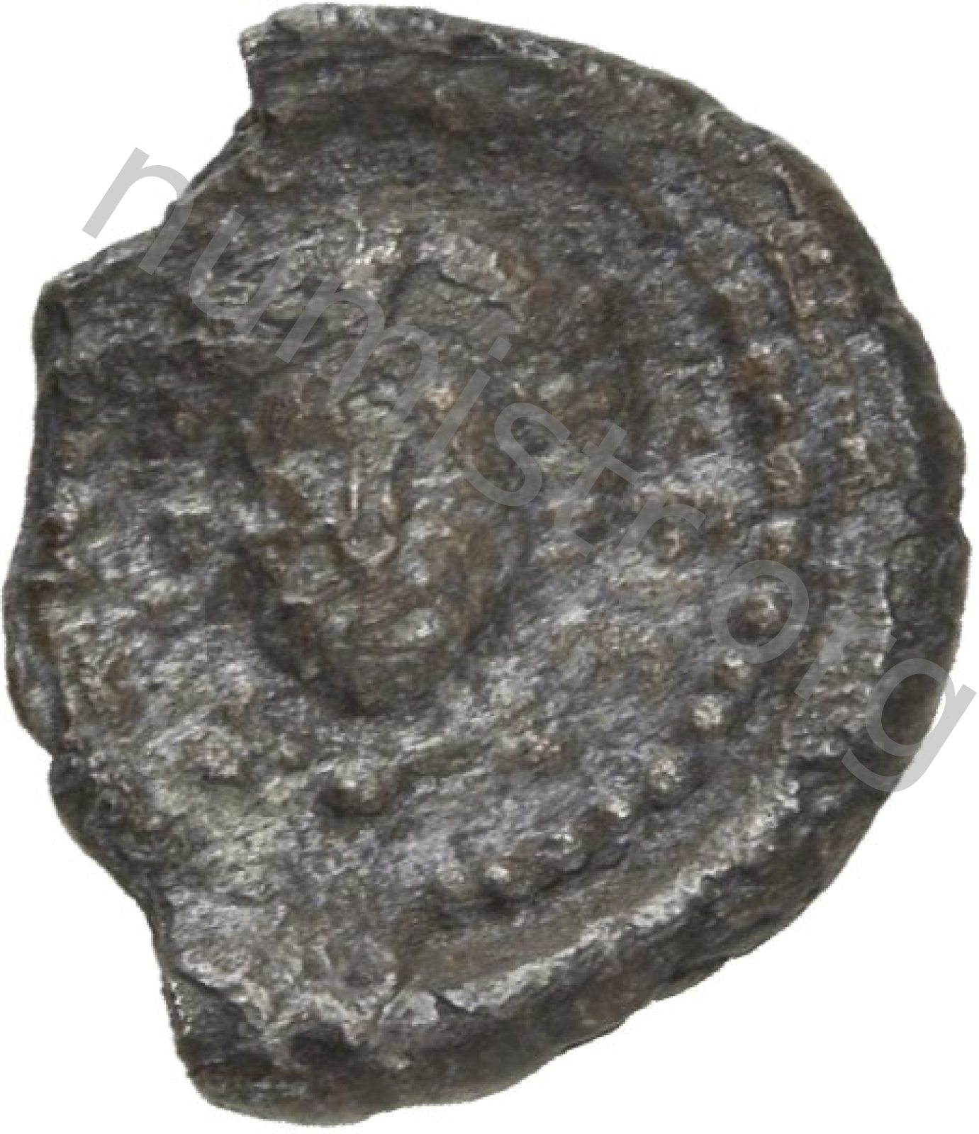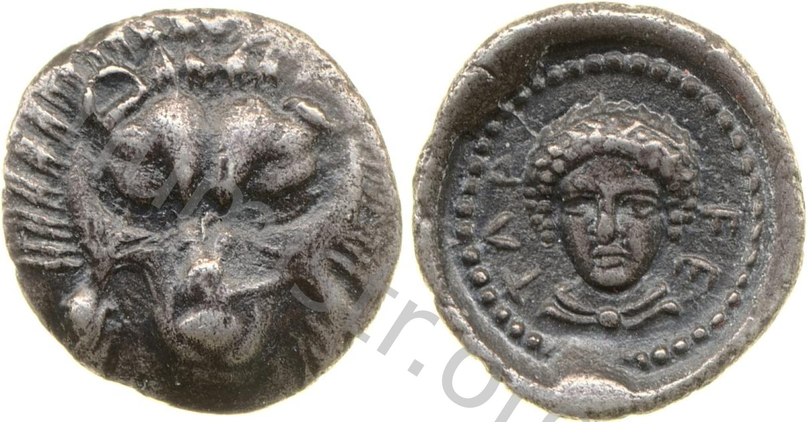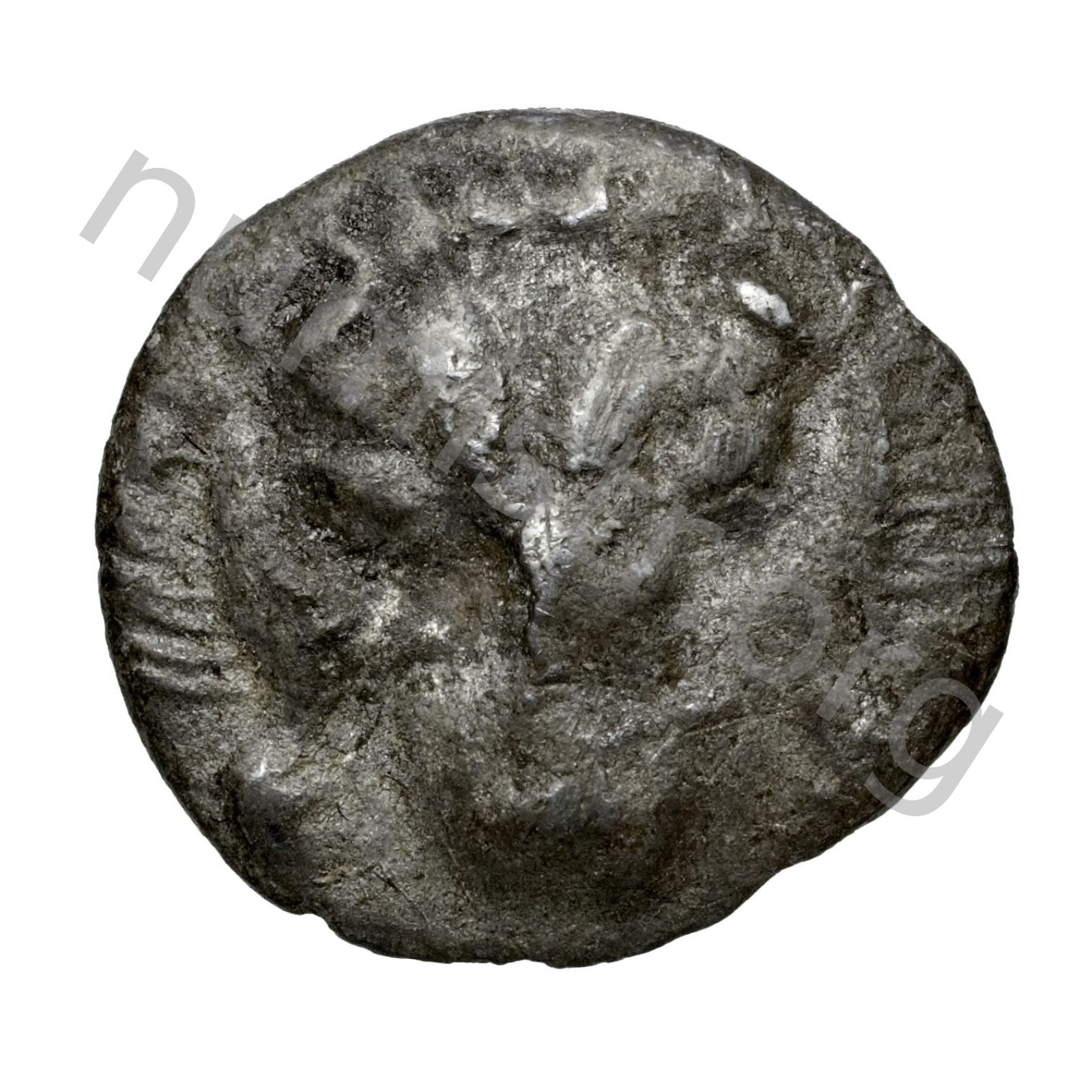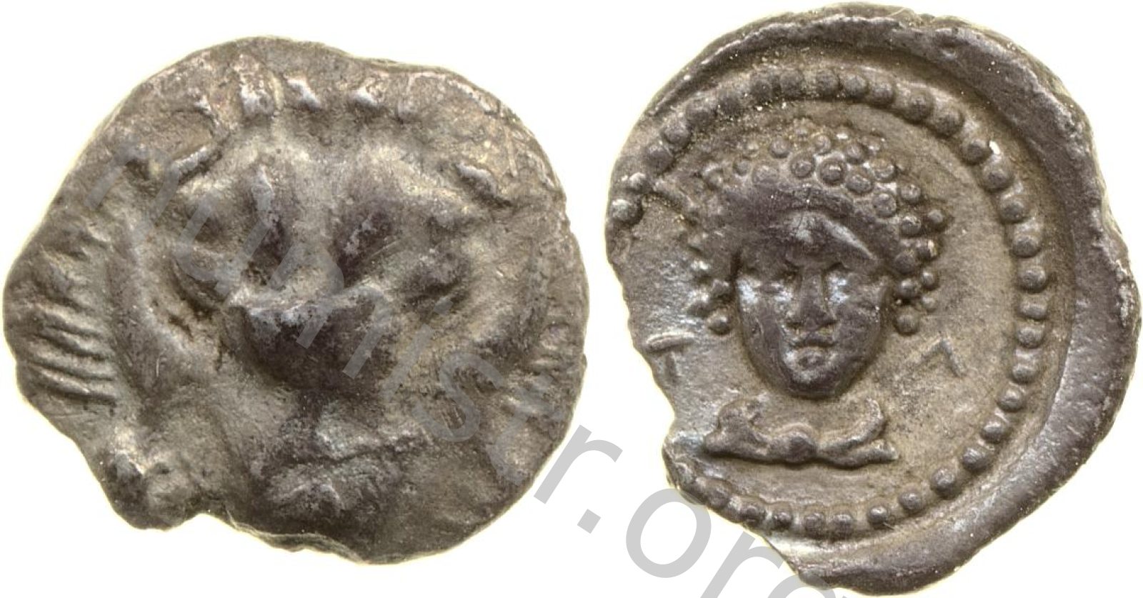 Bust of Apollo facing wearing a laurel wreath and dressed in a chlamys (cloak) in an incuse dotted round border -[en]