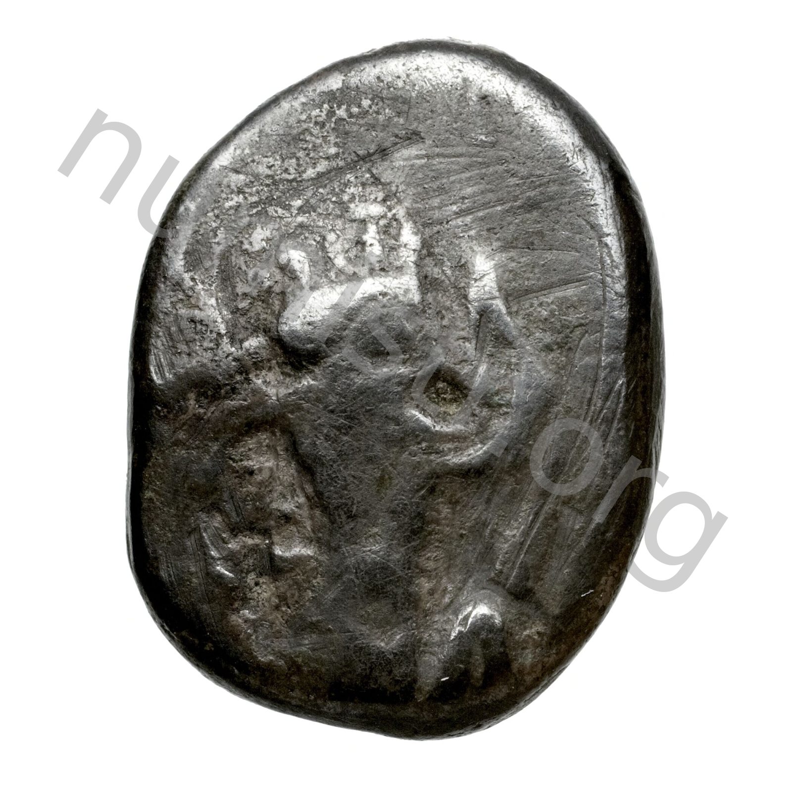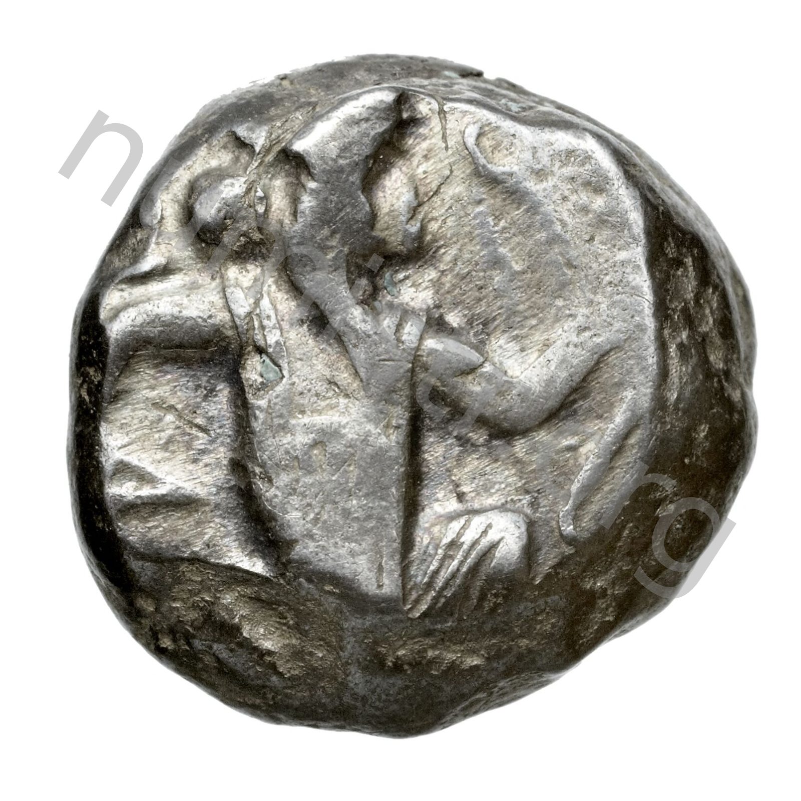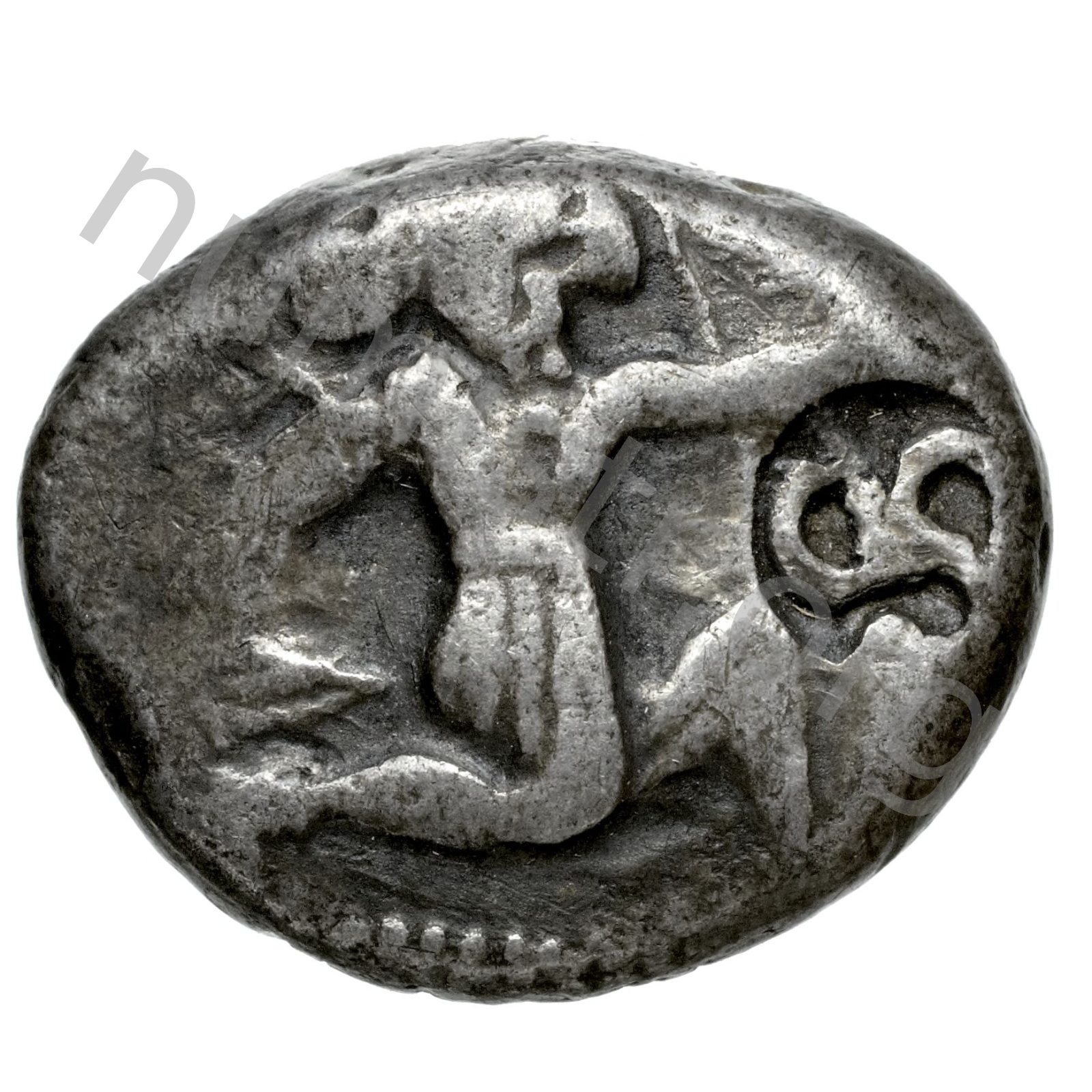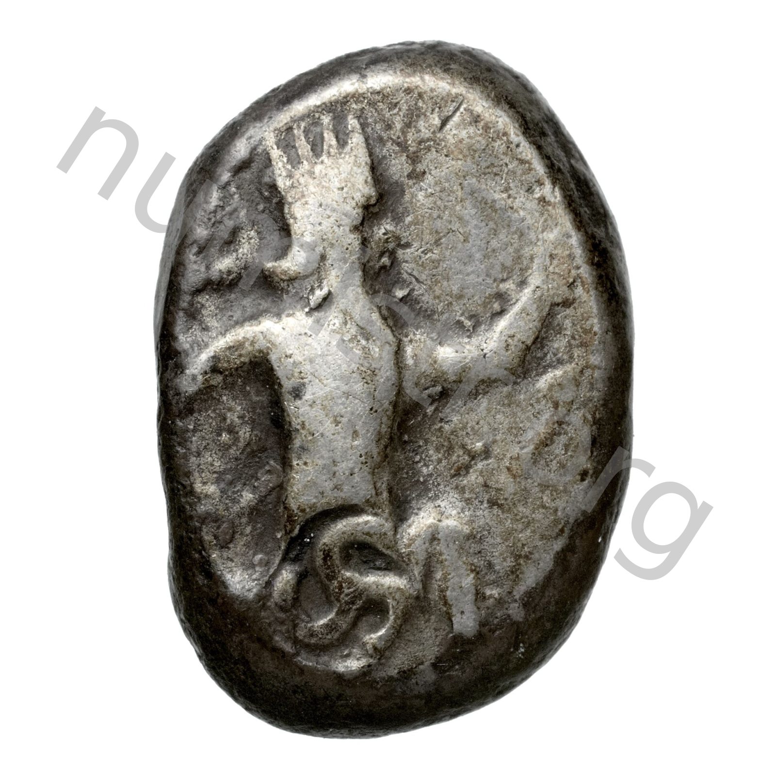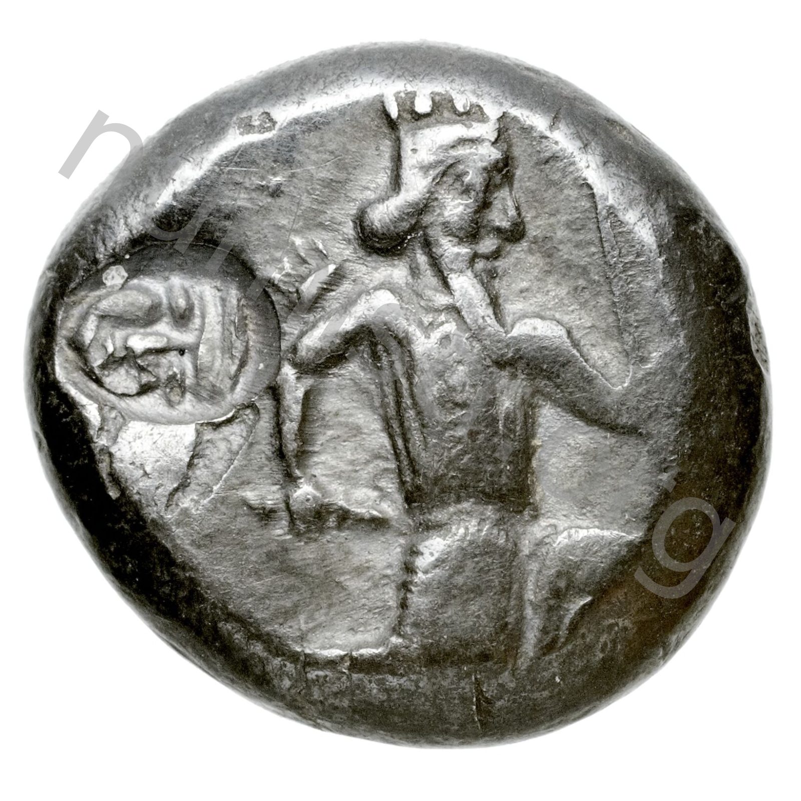 Persian Great King bearded kneeling wearing a serrated wreath and kandys (Persian tunic) holding a dagger behind and a bow in front; at his back a quiver -[en]