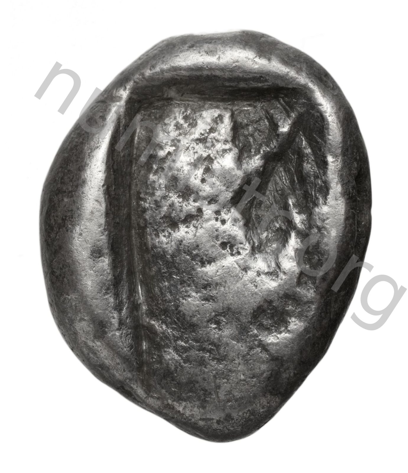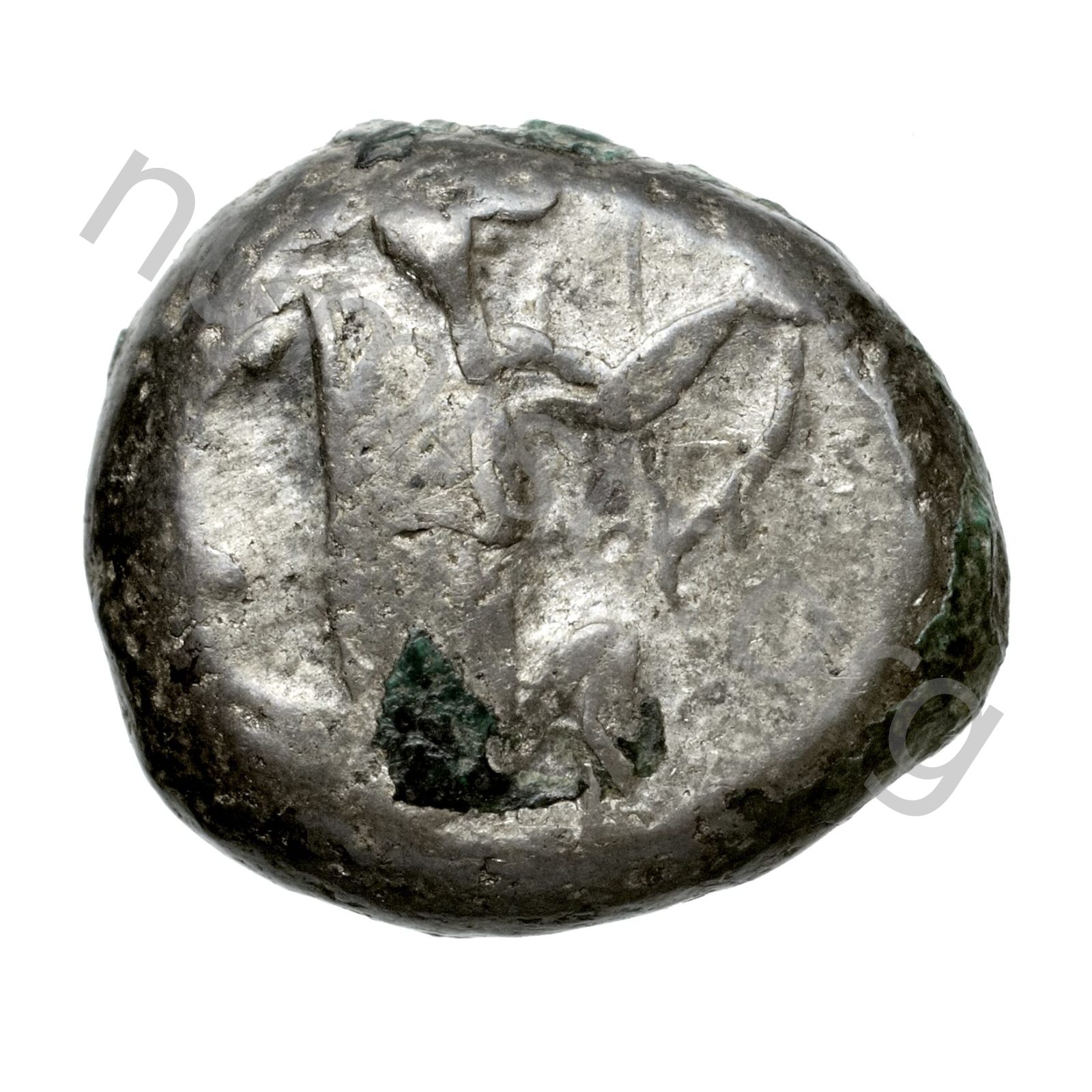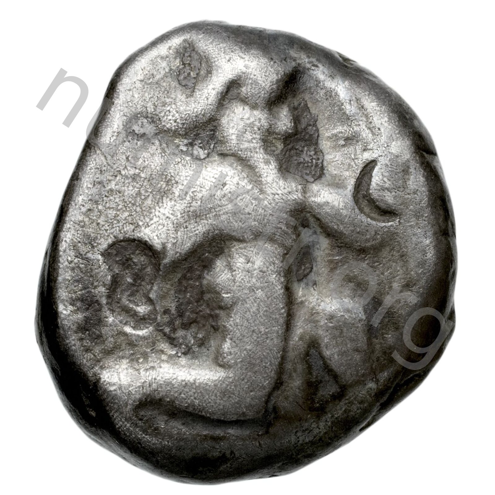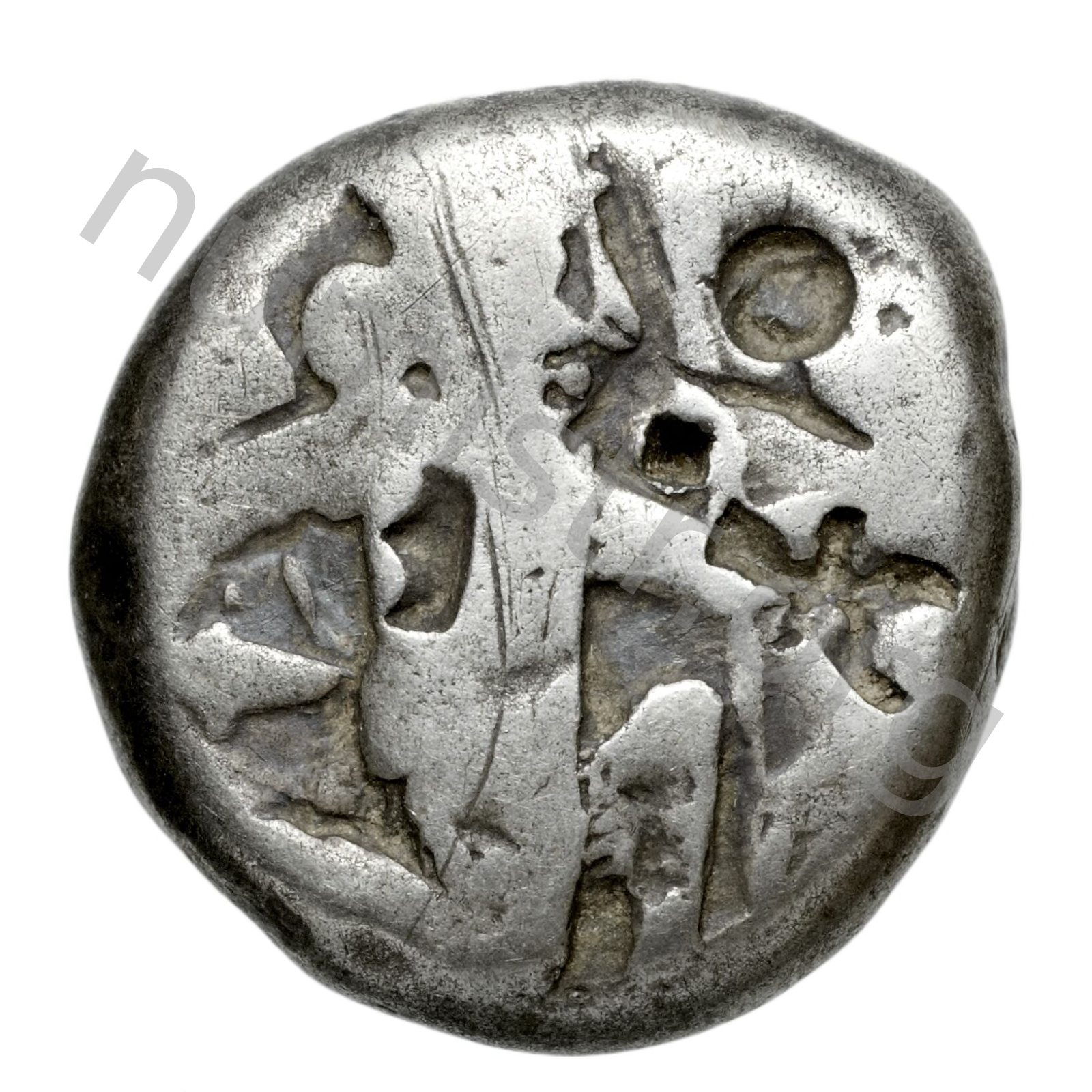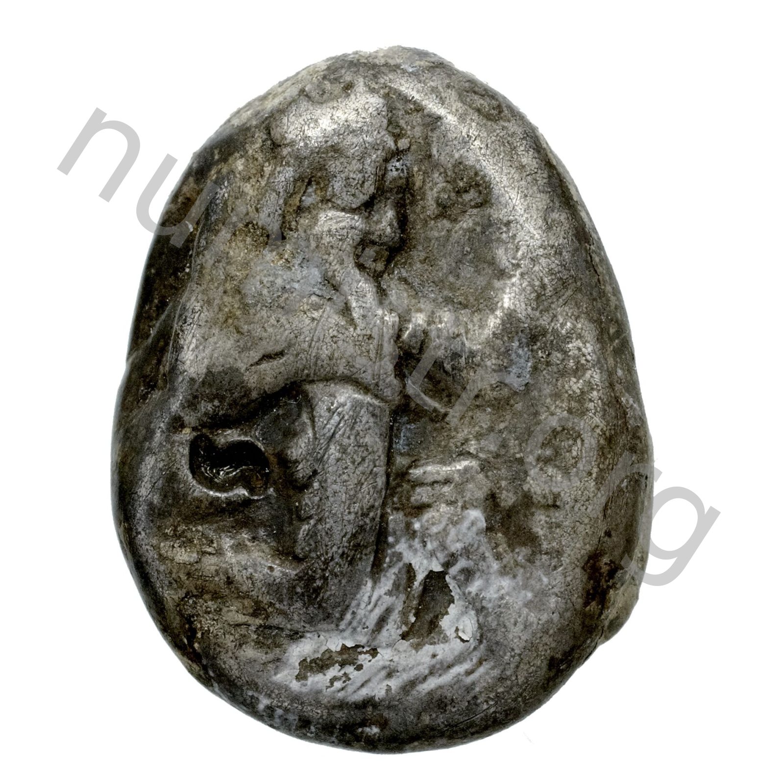 Persian Great King bearded kneeling wearing a serrated wreath and kandys (Persian tunic) holding a dagger behind and a bow in front; at his back a quiver -[en]