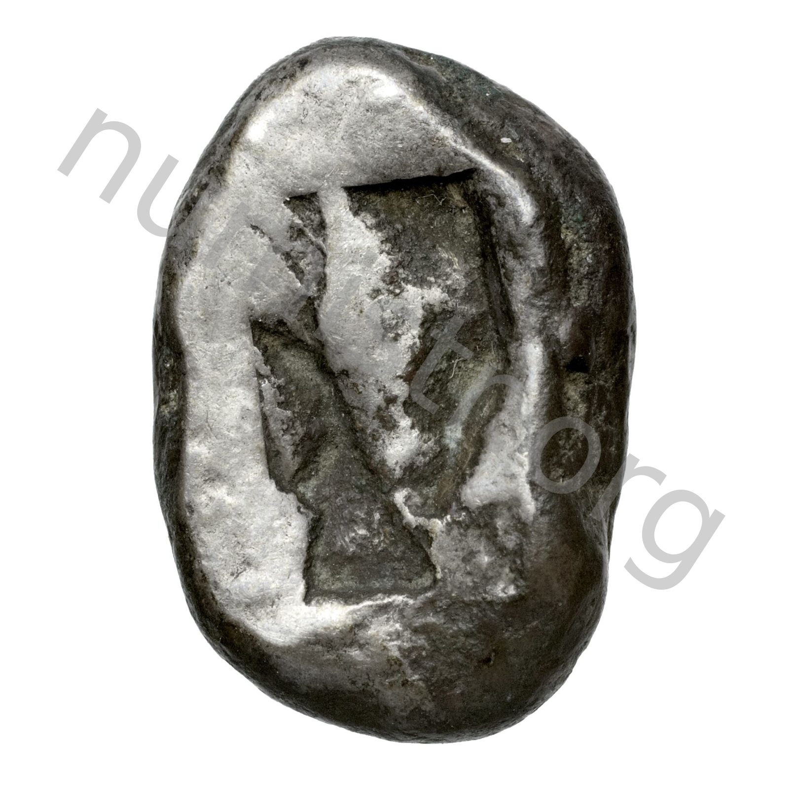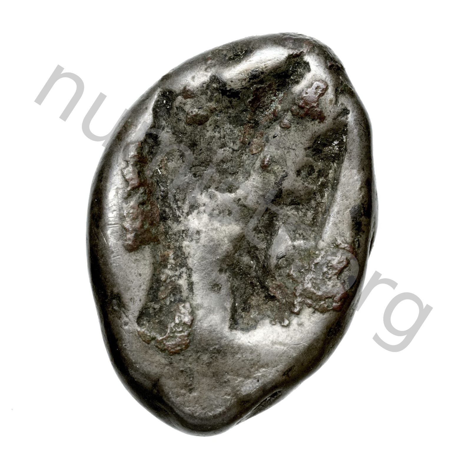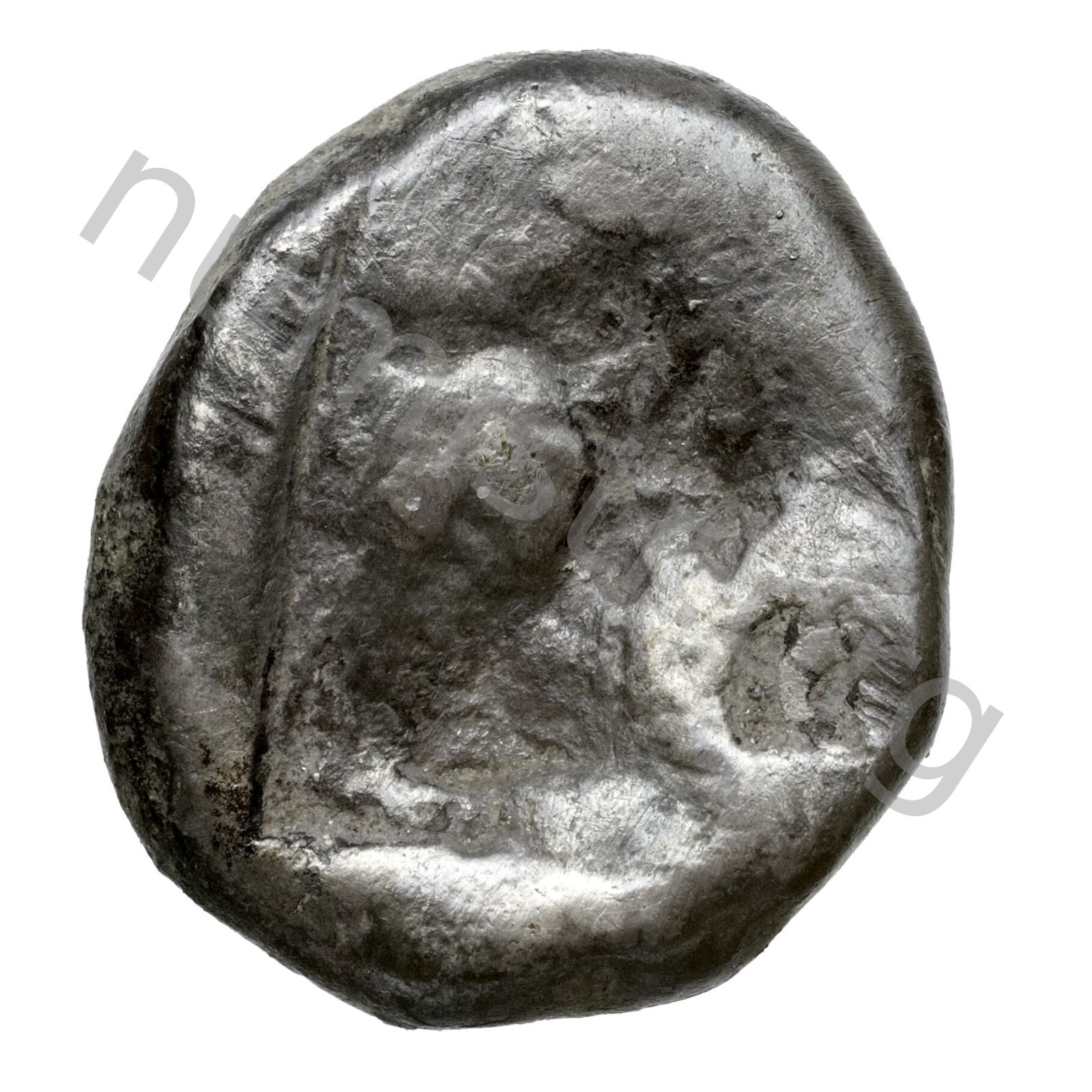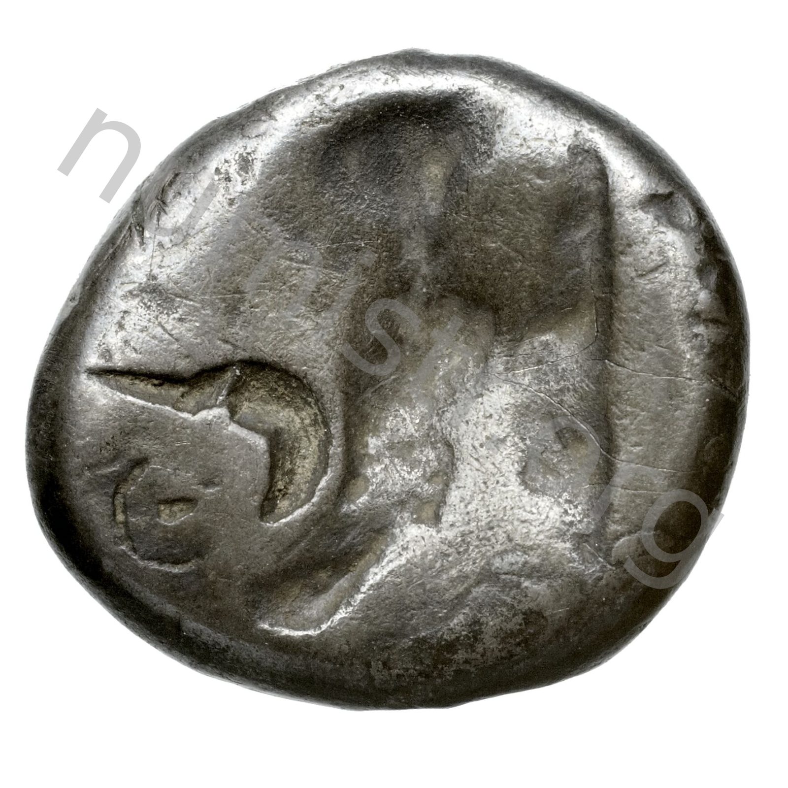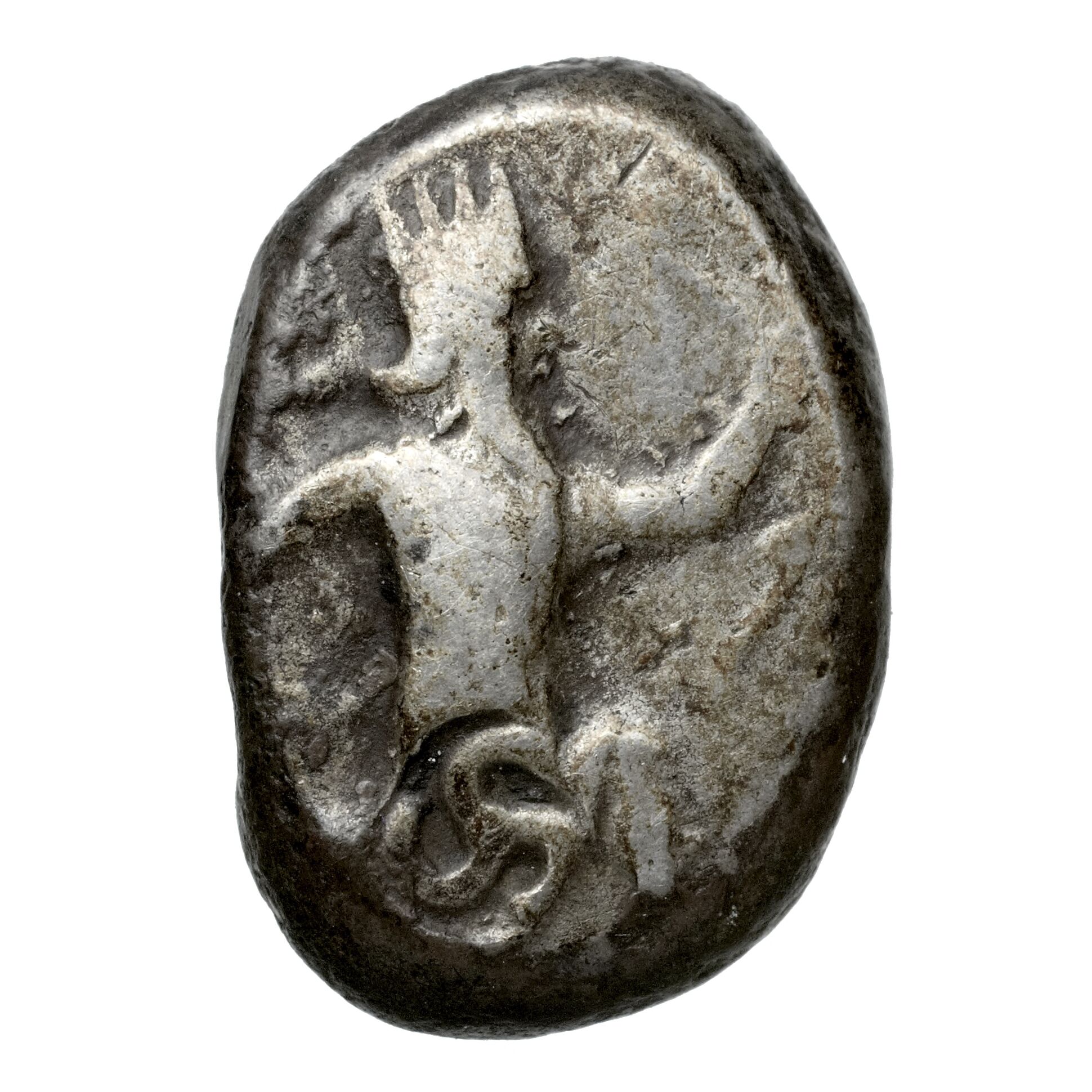 Sakallı Pers Büyük Kralı tırtıklı bir çelenk ve kandys (Pers tuniği) takmış diz çökmüş arkasında bir hançer ve önünde bir yay tutuyor; sırtında bir sadak