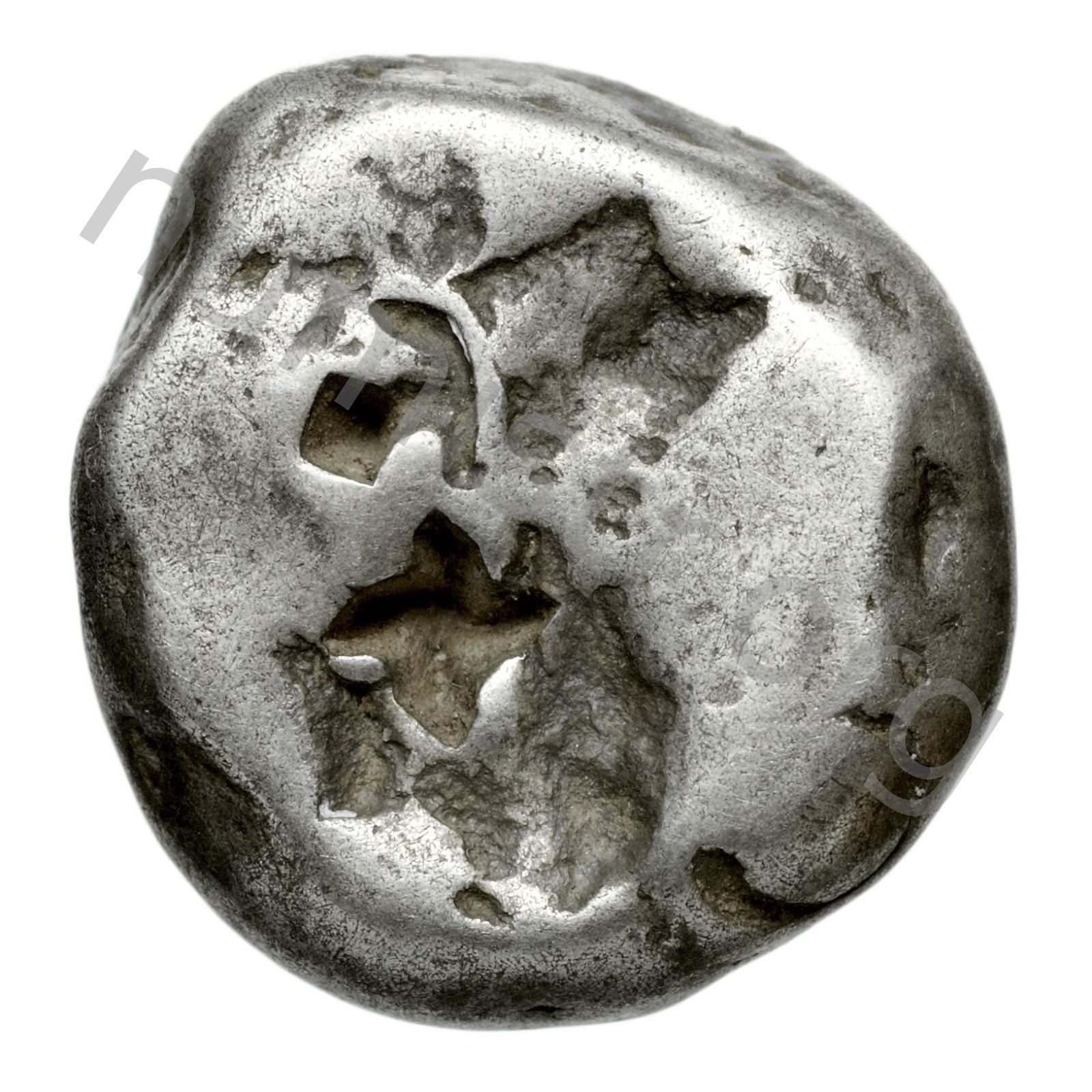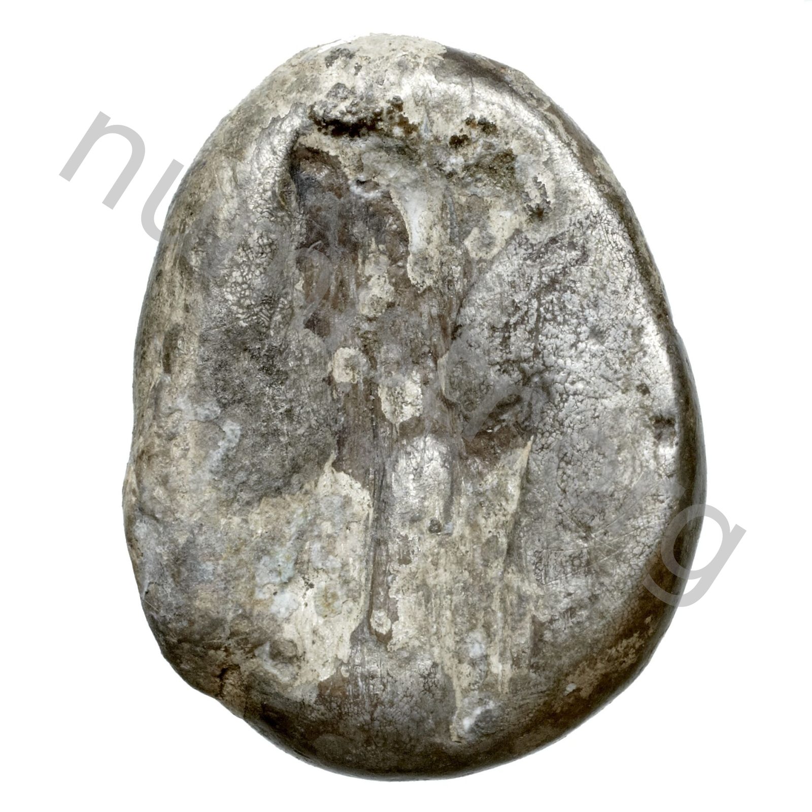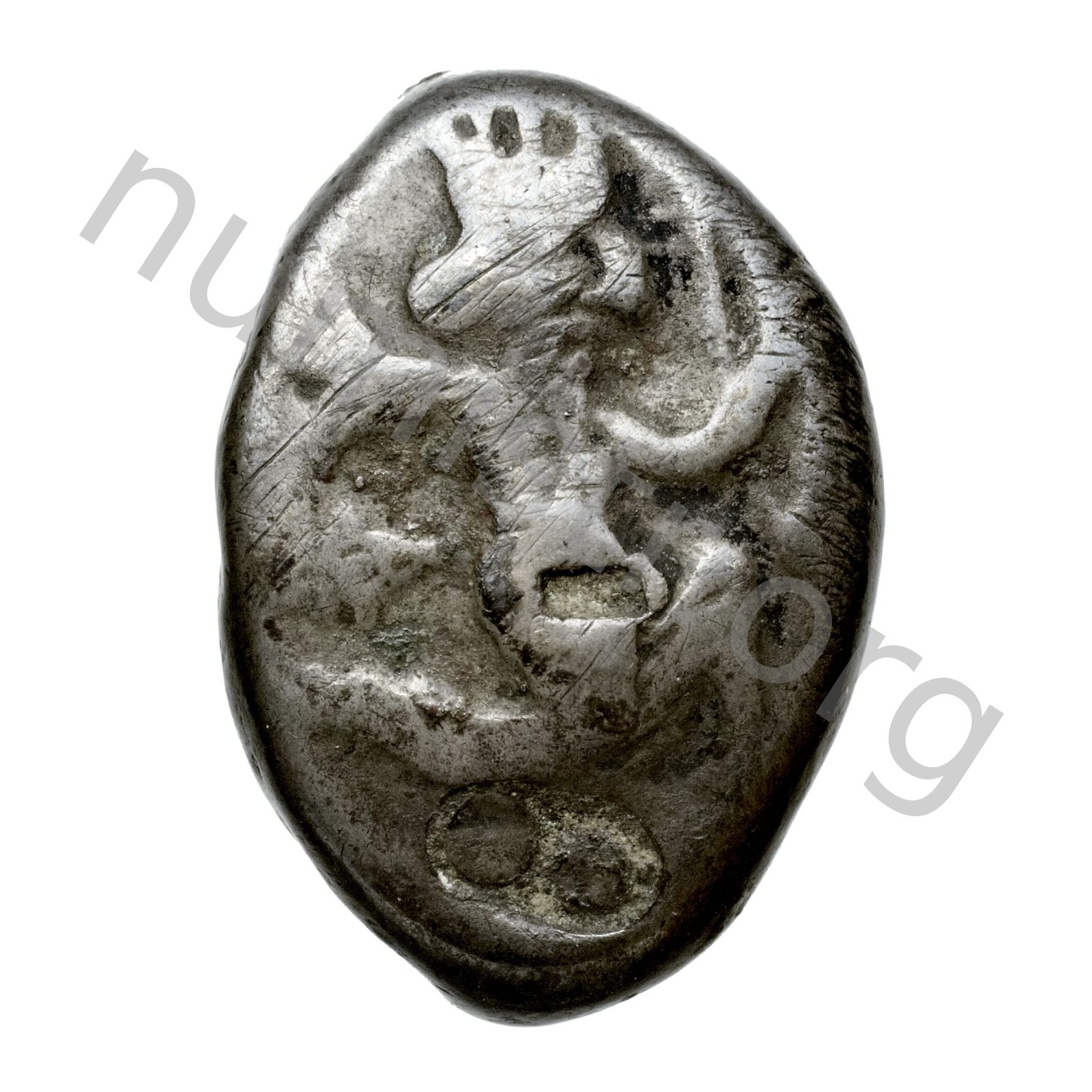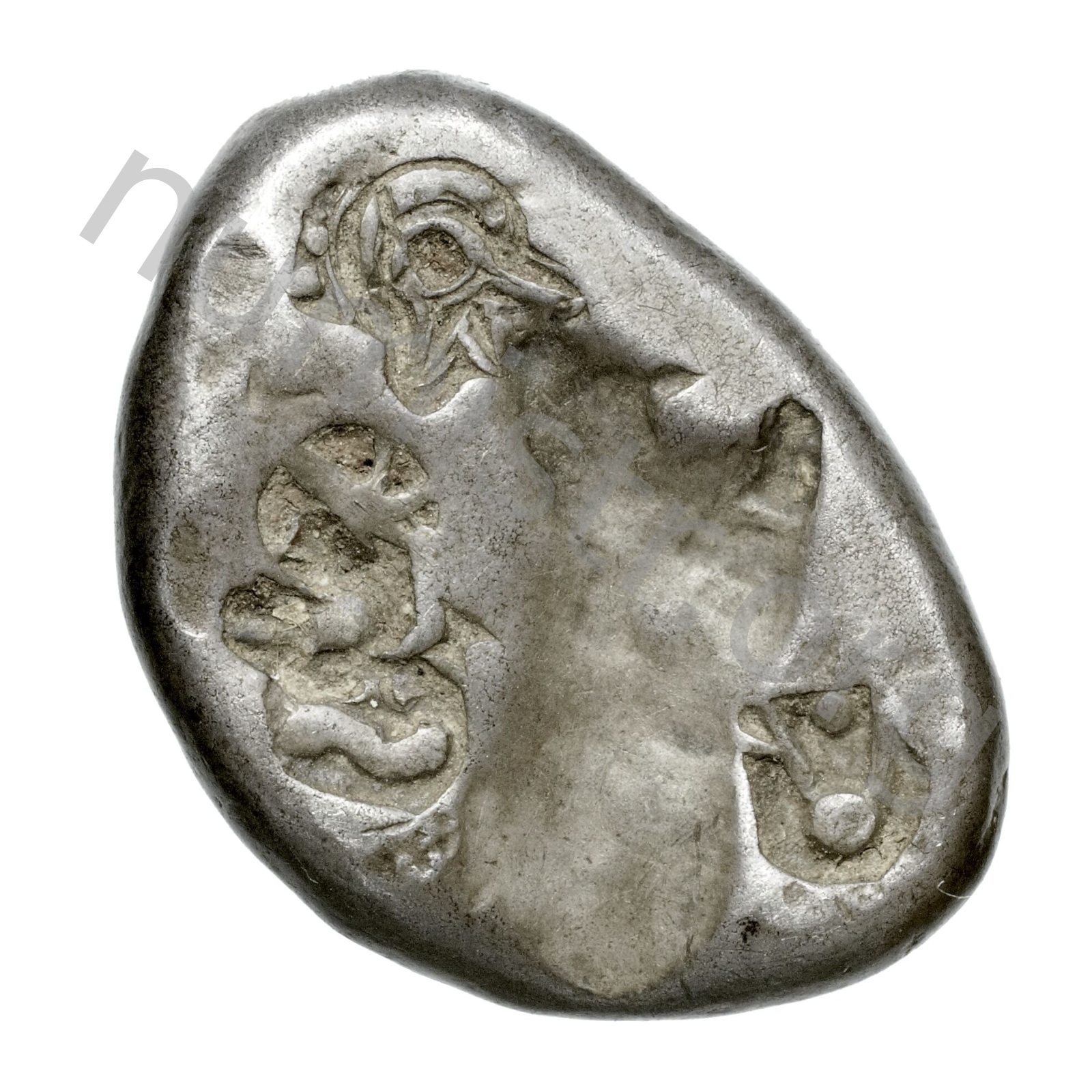 Sakallı Pers Büyük Kralı tırtıklı bir çelenk ve kandys (Pers tuniği) takmış diz çökmüş arkasında bir hançer ve önünde bir yay tutuyor; sırtında bir sadak