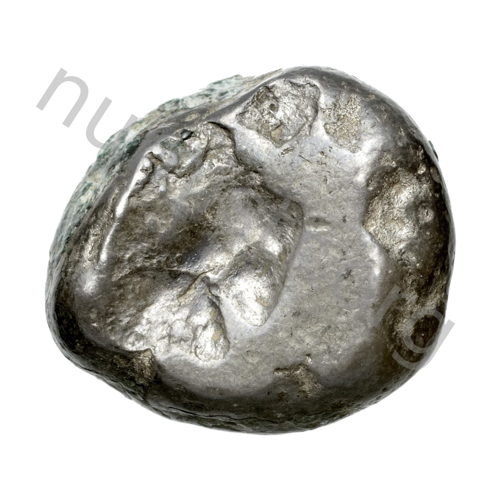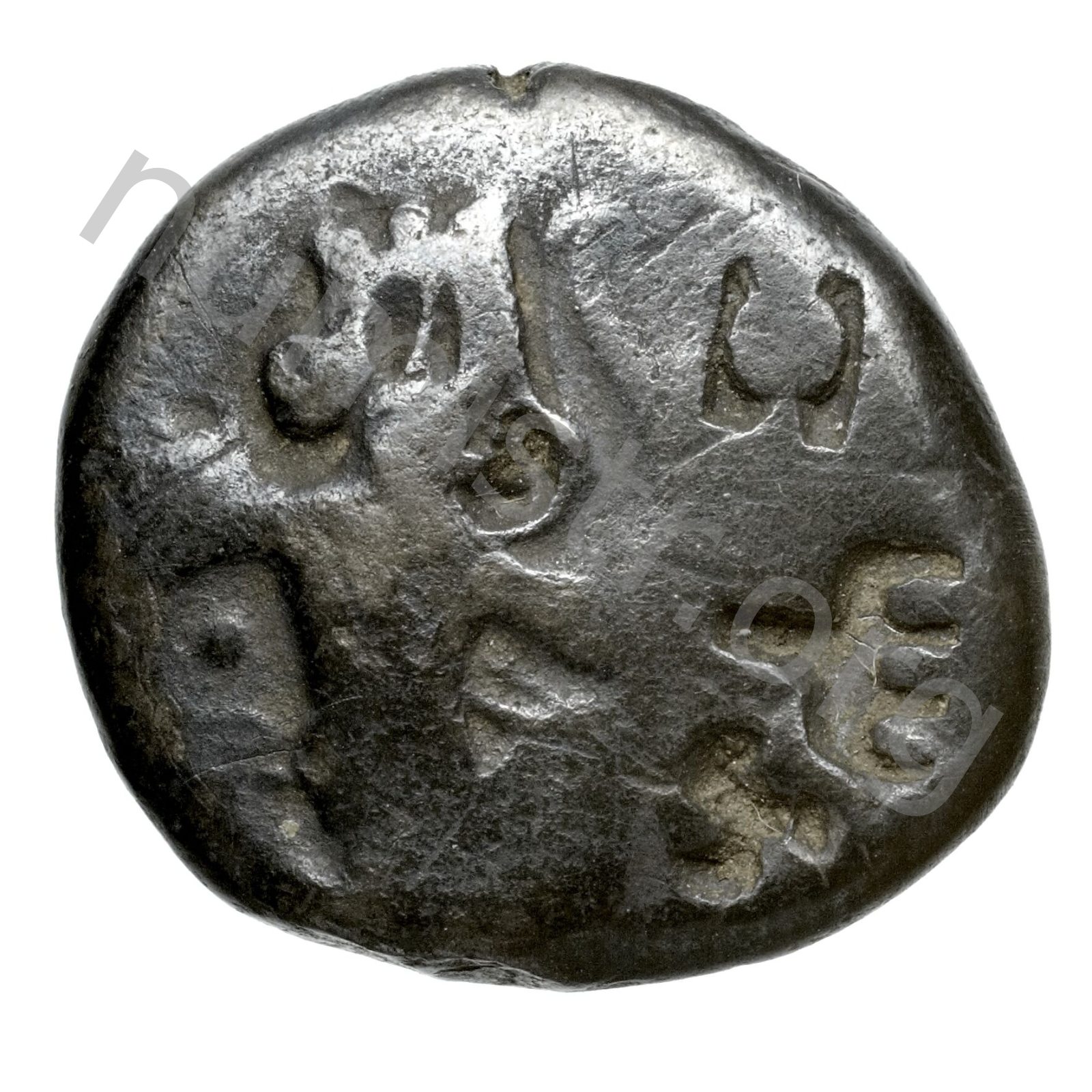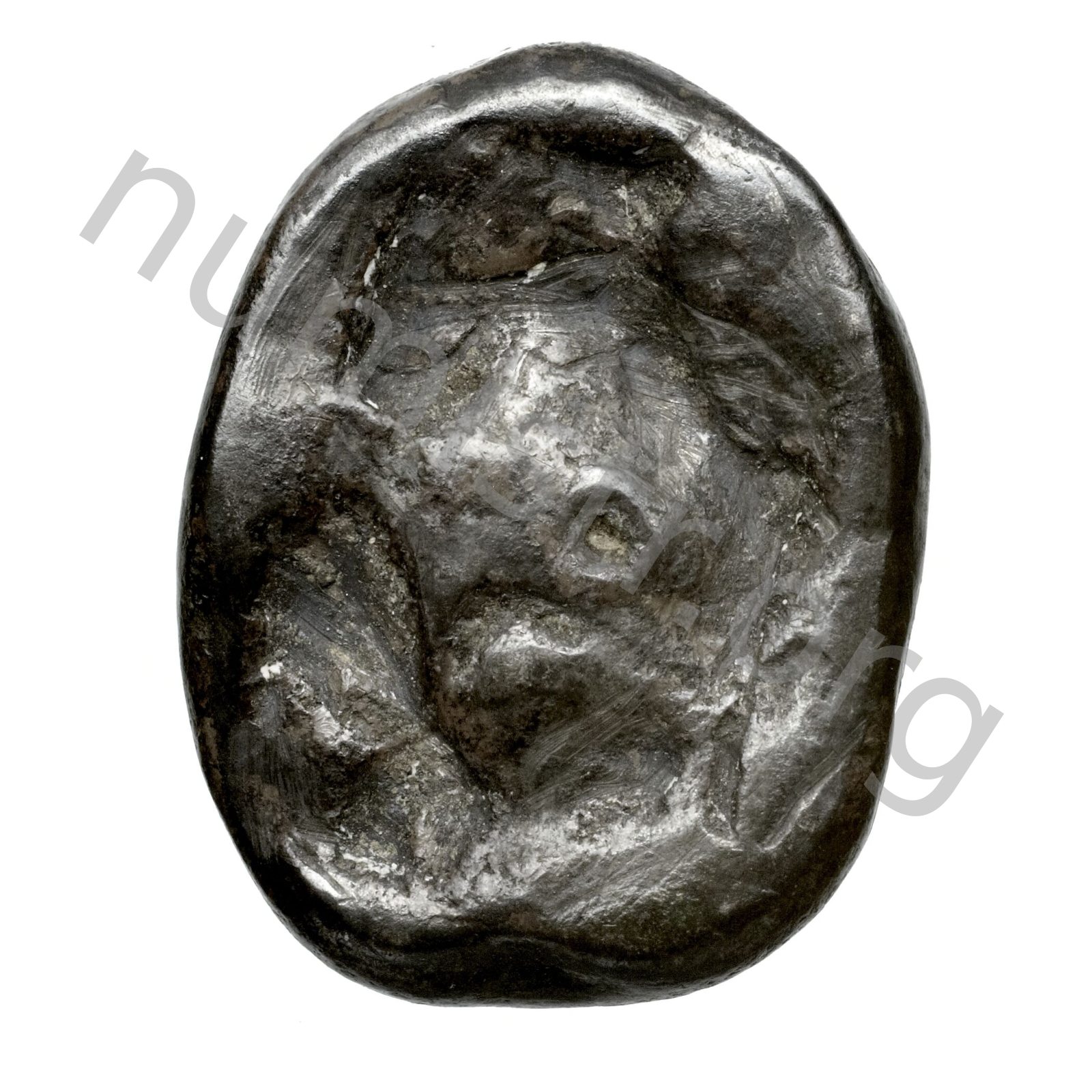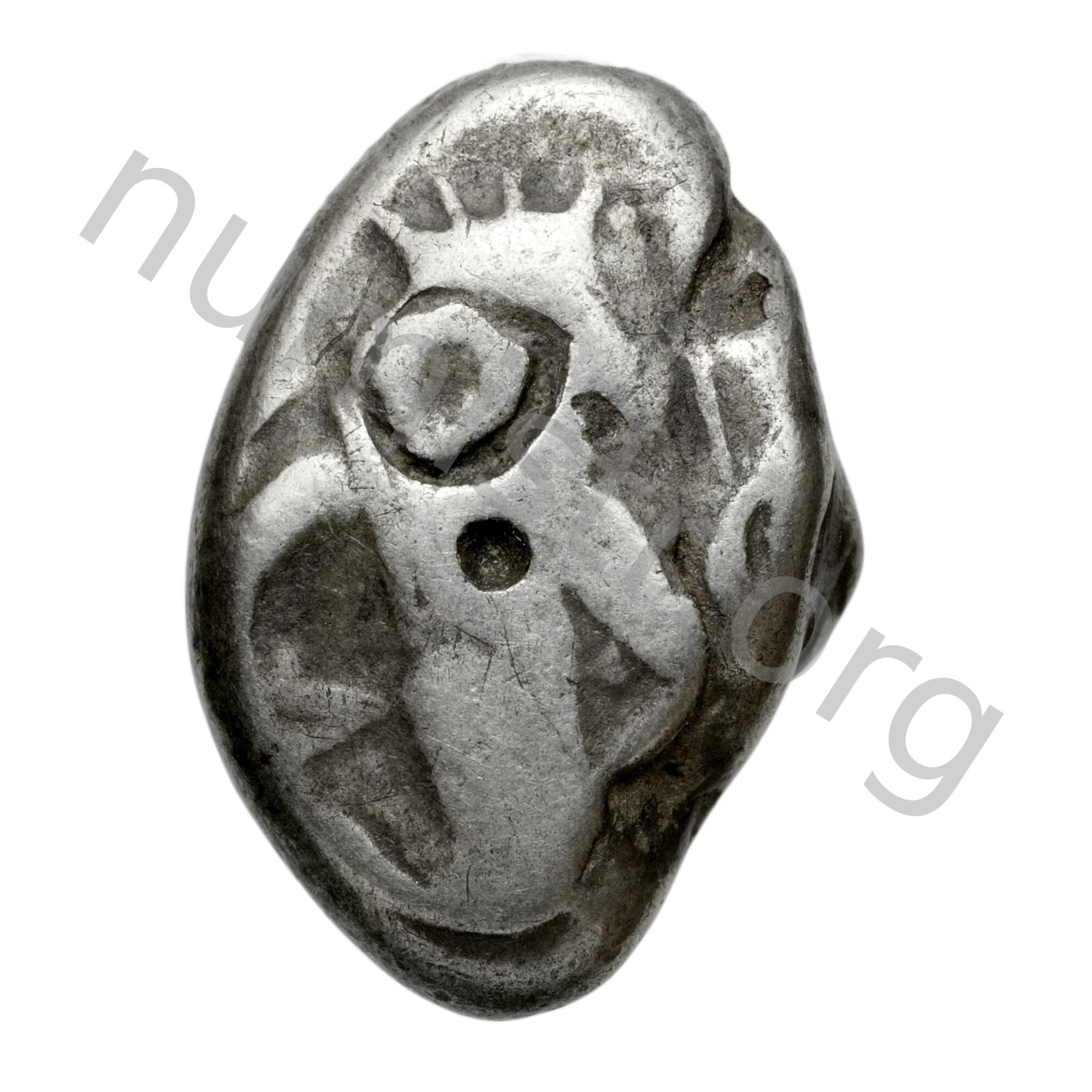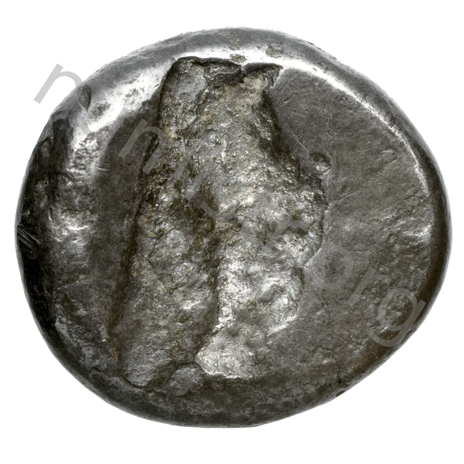Sakallı Pers Büyük Kralı tırtıklı bir çelenk ve kandys (Pers tuniği) takmış diz çökmüş arkasında bir hançer ve önünde bir yay tutuyor; sırtında bir sadak
