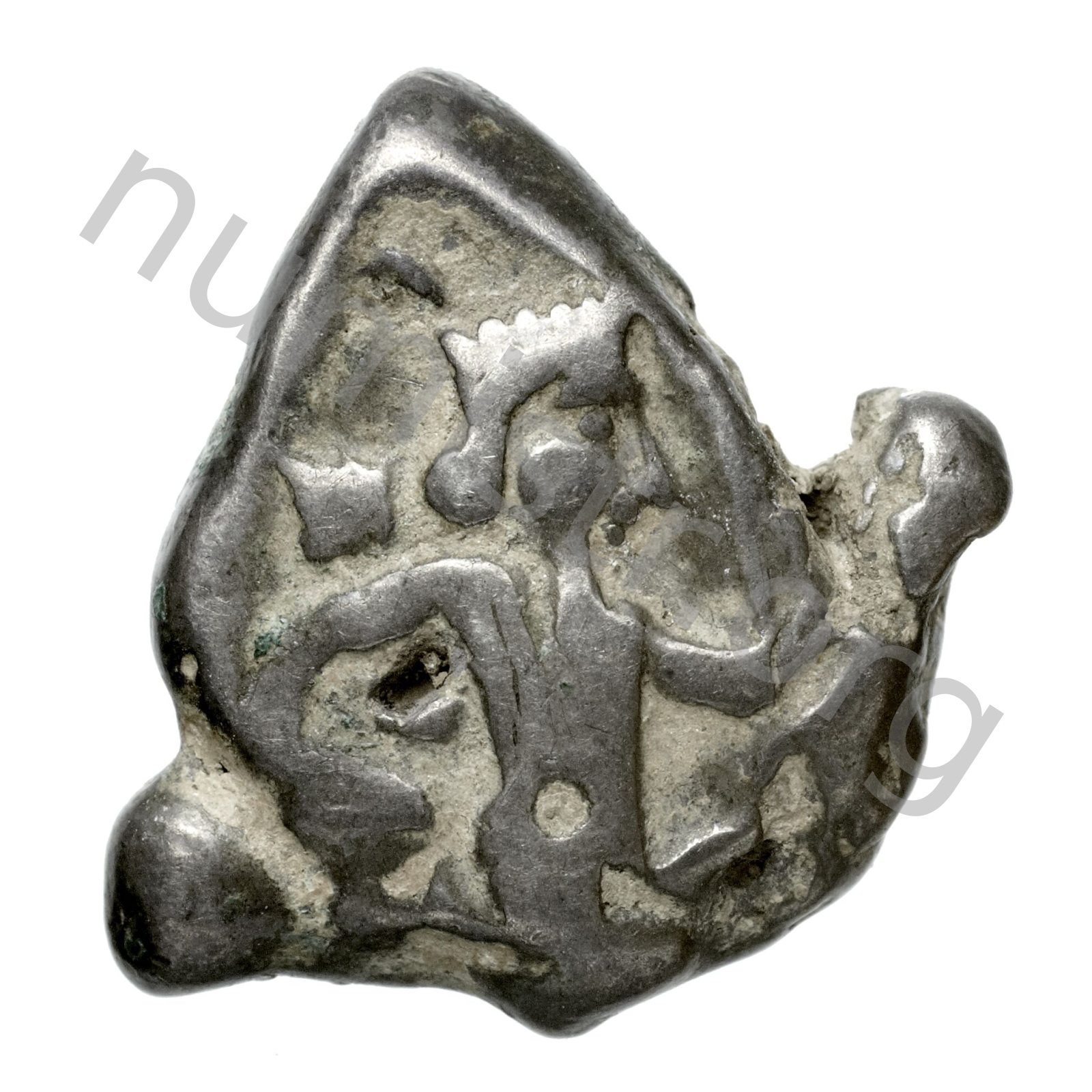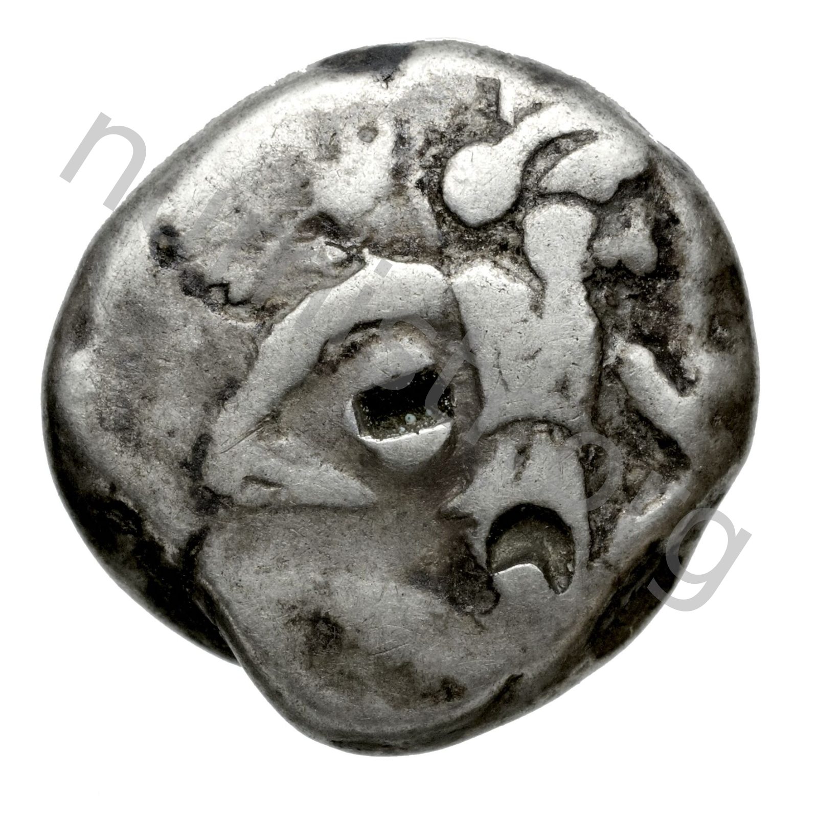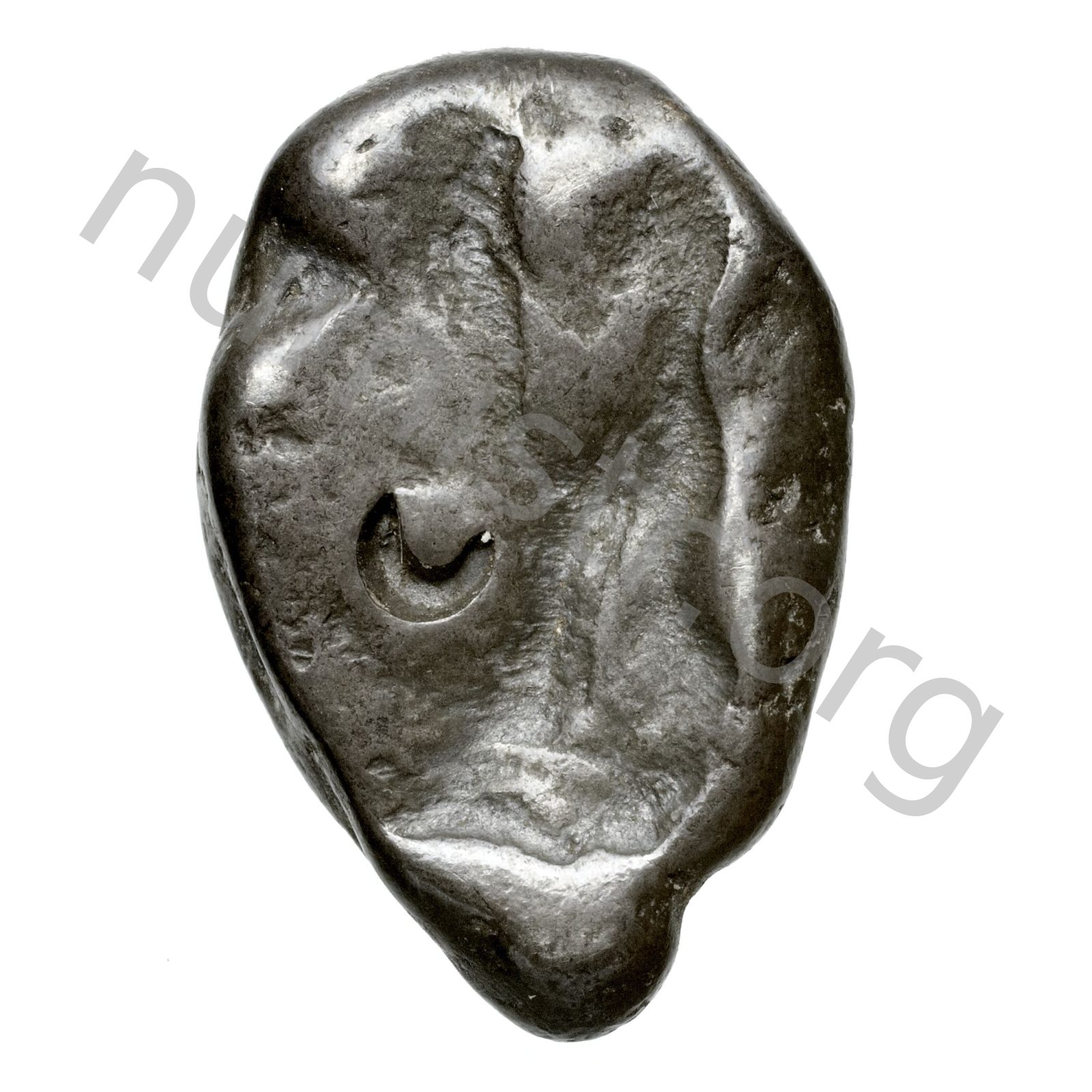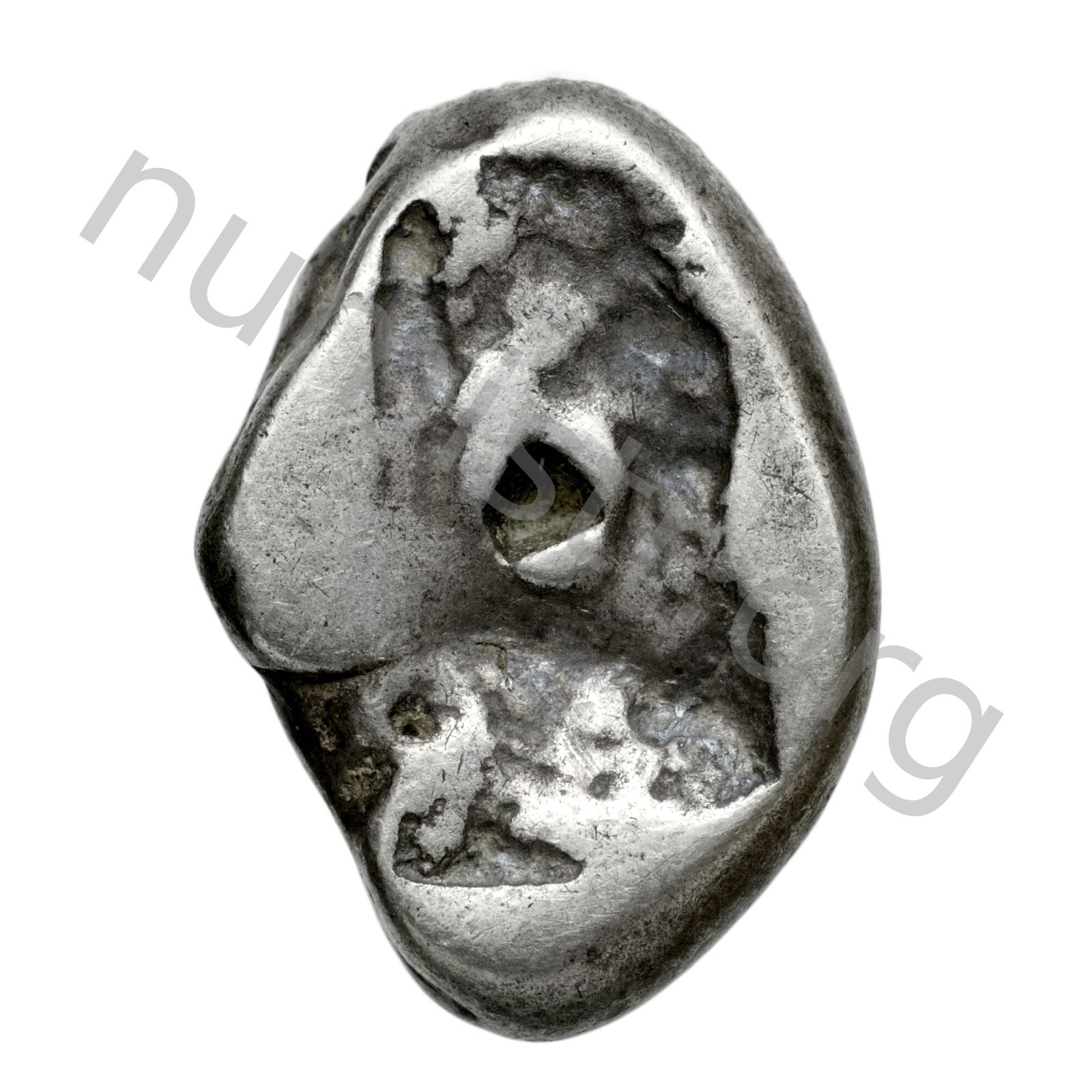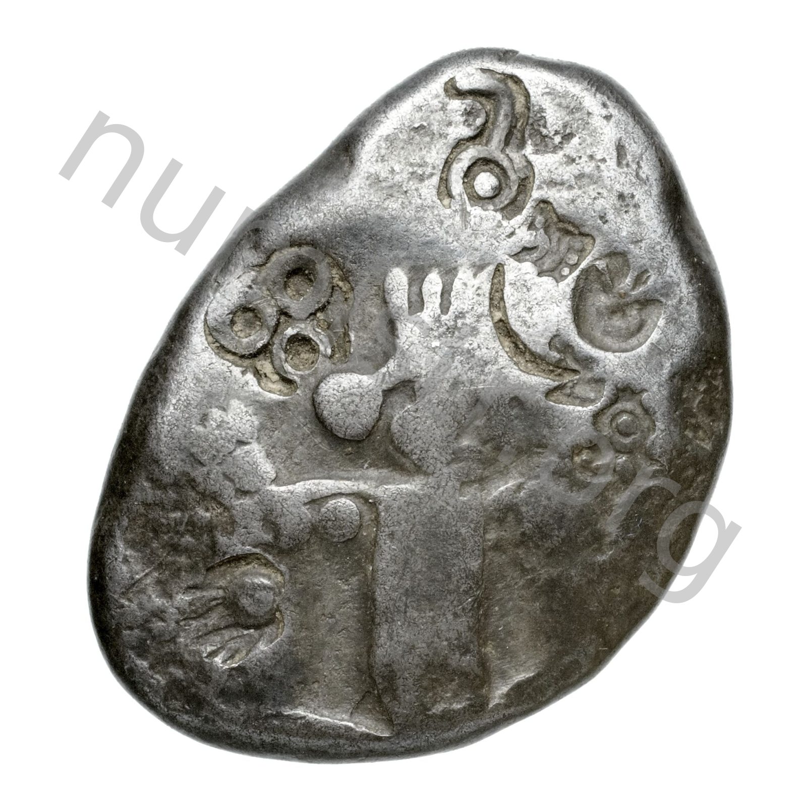 Sakallı Pers Büyük Kralı tırtıklı bir çelenk ve kandys (Pers tuniği) takmış diz çökmüş arkasında bir hançer ve önünde bir yay tutuyor; sırtında bir sadak