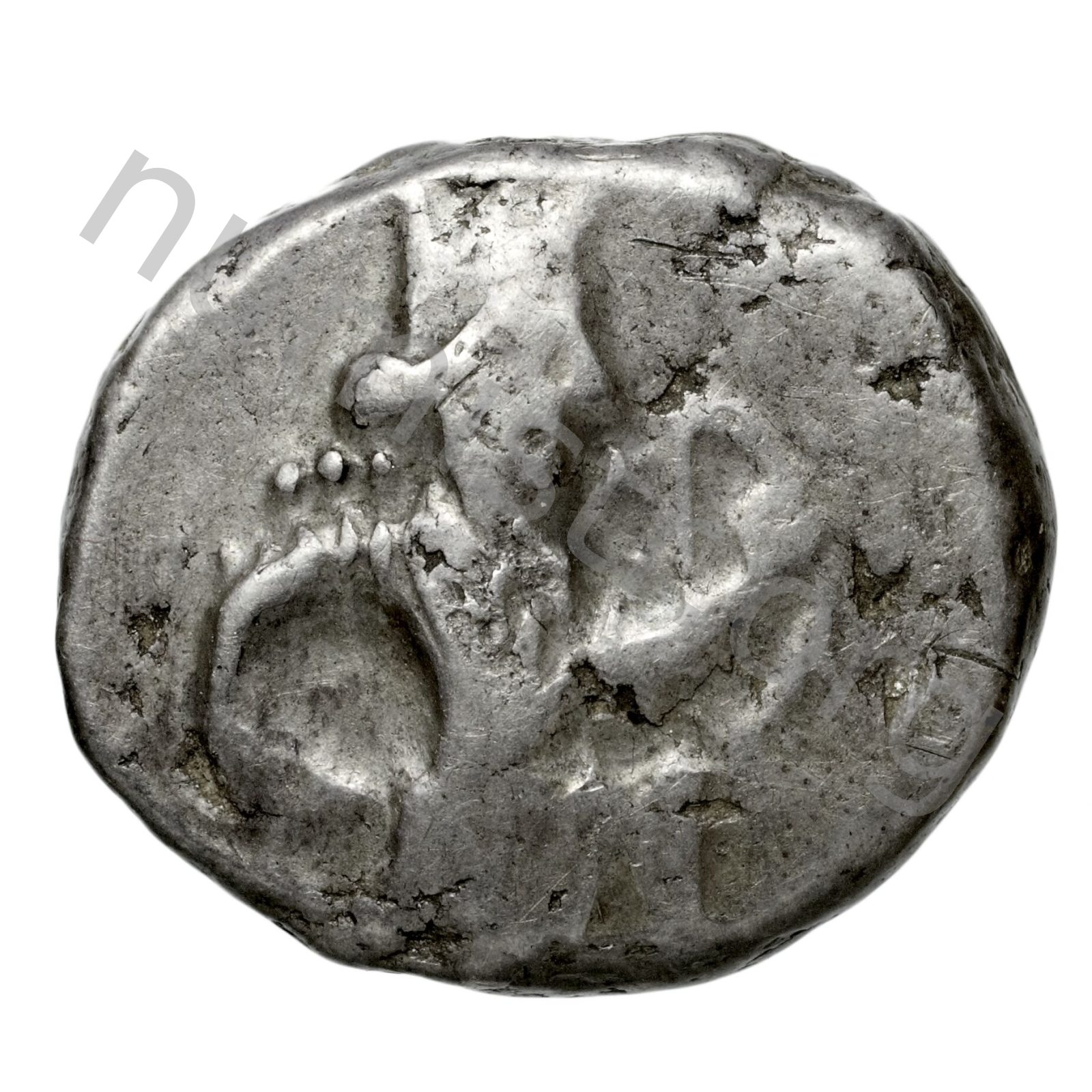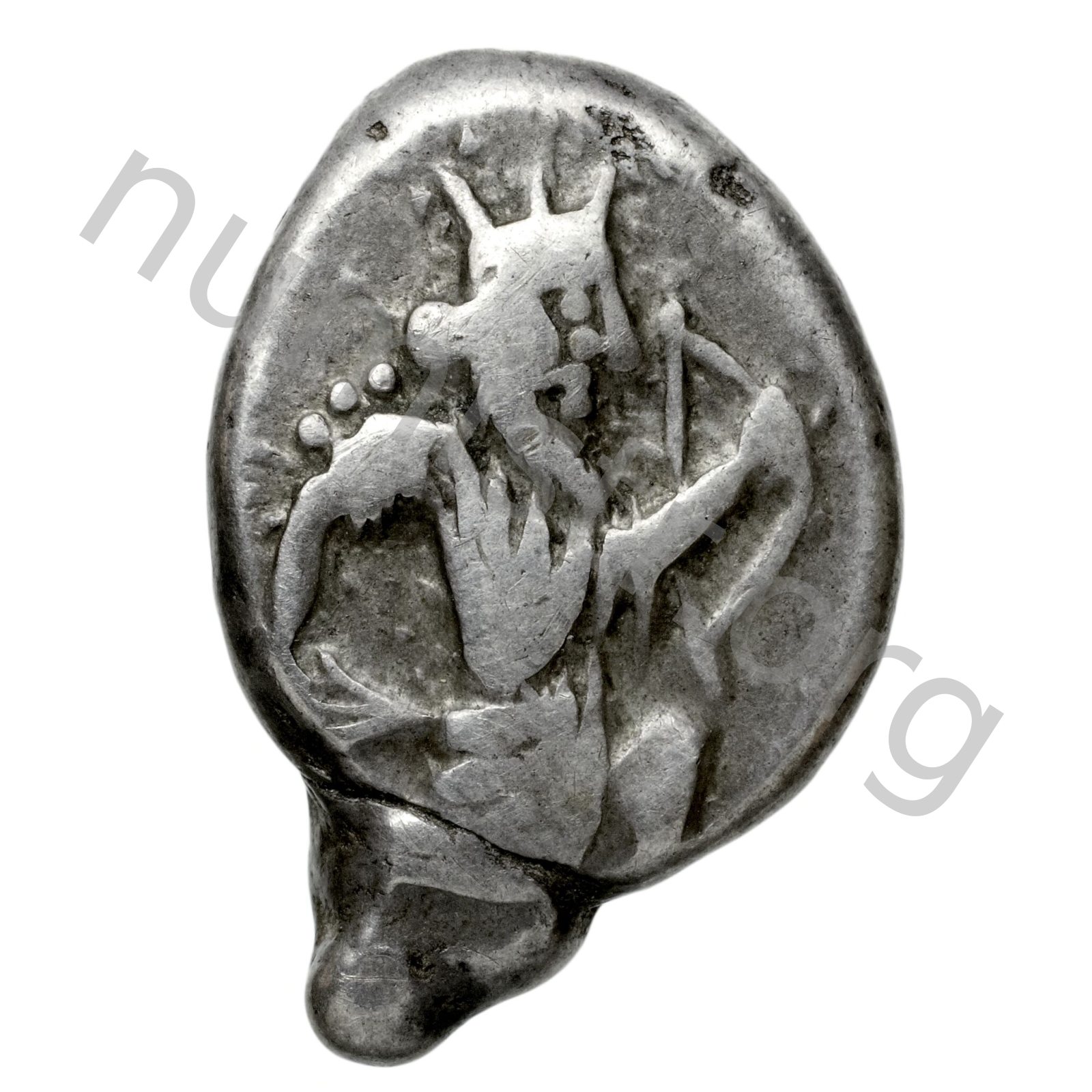 Sakallı Pers Büyük Kralı tırtıklı bir çelenk ve kandys (Pers tuniği) takmış diz çökmüş arkasında bir hançer ve önünde bir yay tutuyor; sırtında bir sadak