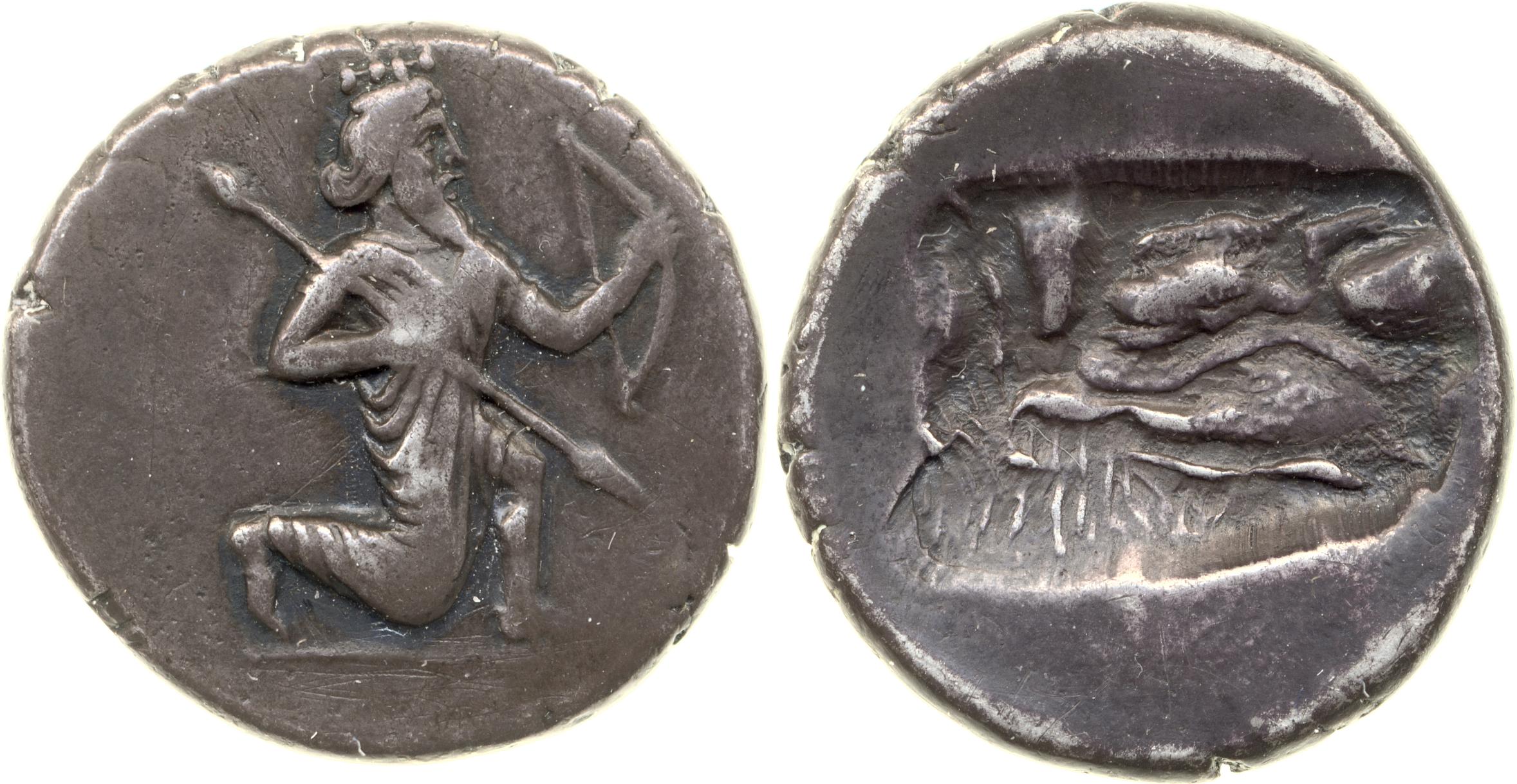Pers Kralı Pers kydaris (tırtıklı taç) ve Pers kandys (Pers tuniği) giymiş elinde yay ve mızrak tutan diz çökmüş halde.