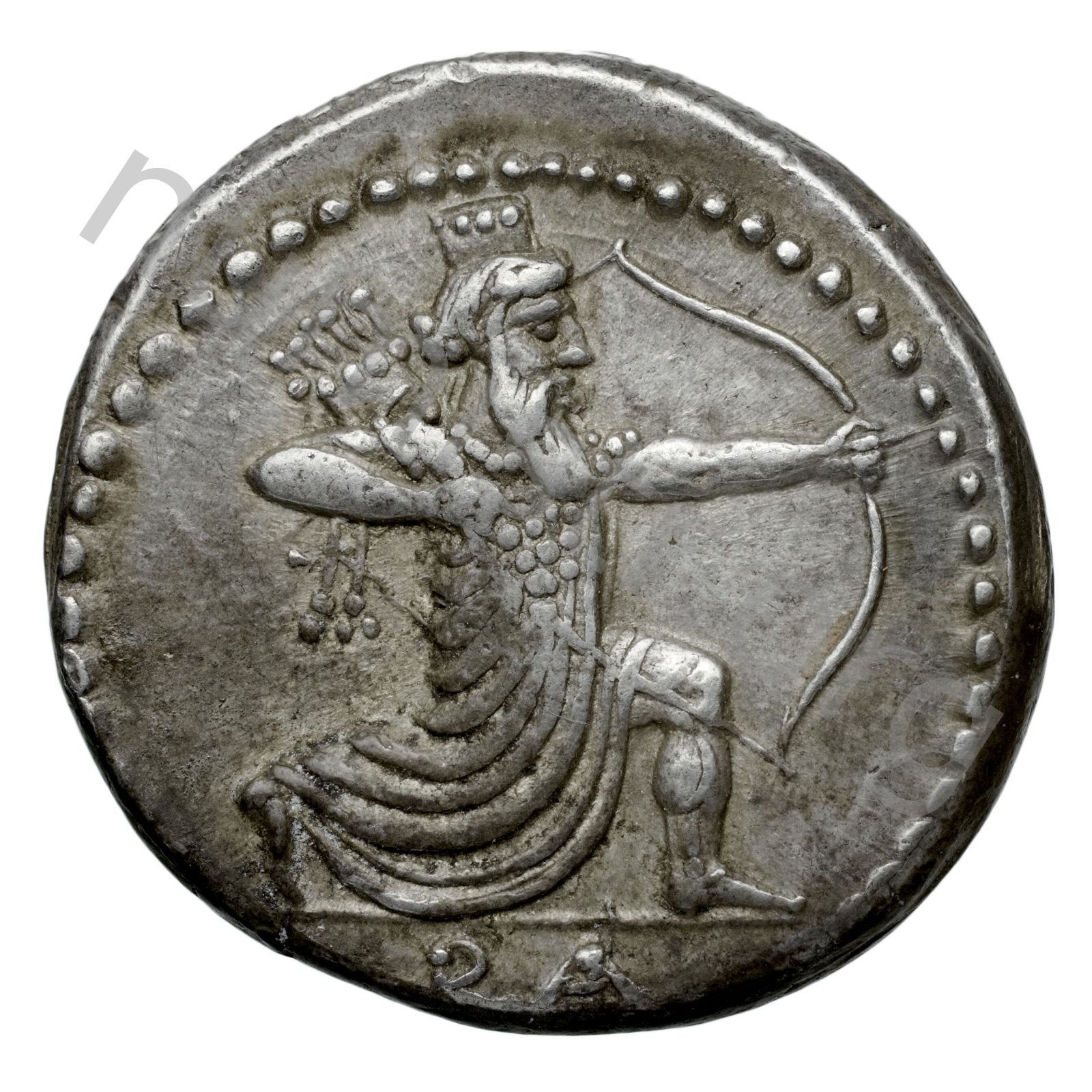 Pers Kralı Pers kydaris (tırtıklı taç) ve Pers kandys (Pers tuniği) giymiş diz çökmüş ve bir yay büküyor