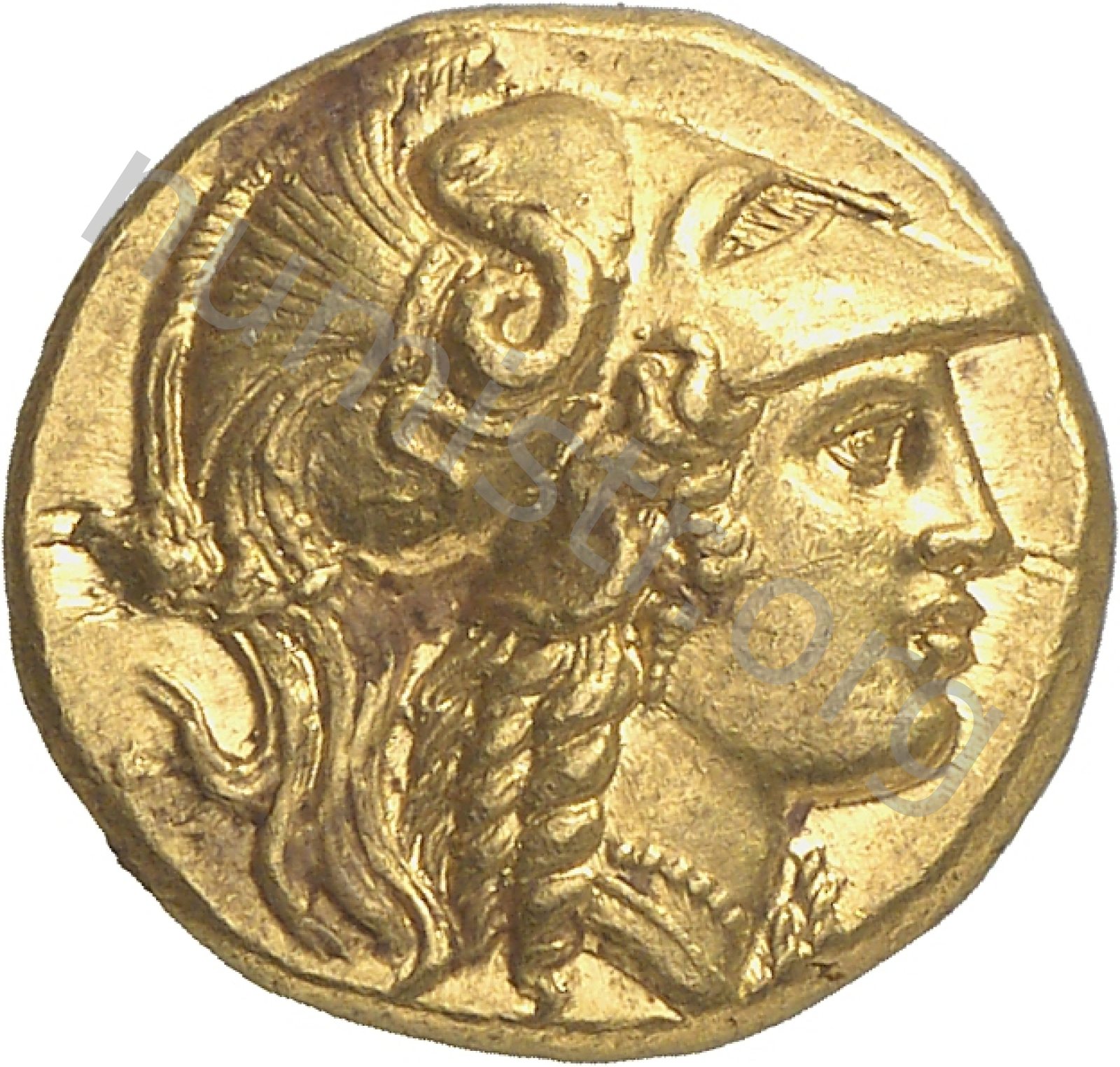 Head of Athena right wearing Corinthian helmet with crest -[en]