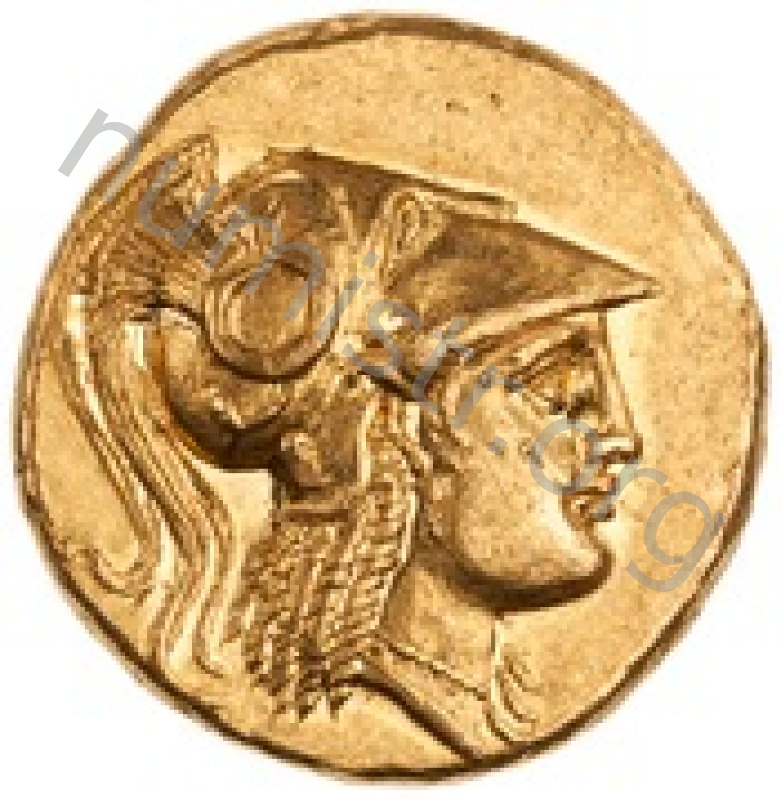 Head of Athena right wearing Corinthian helmet with crest -[en]