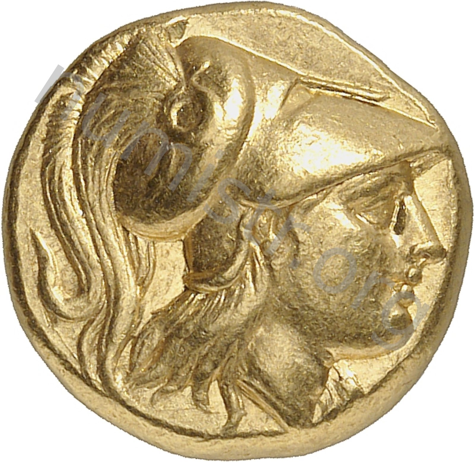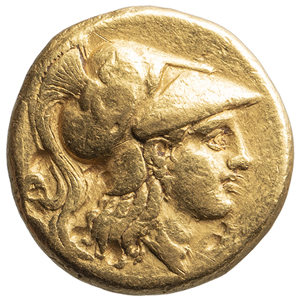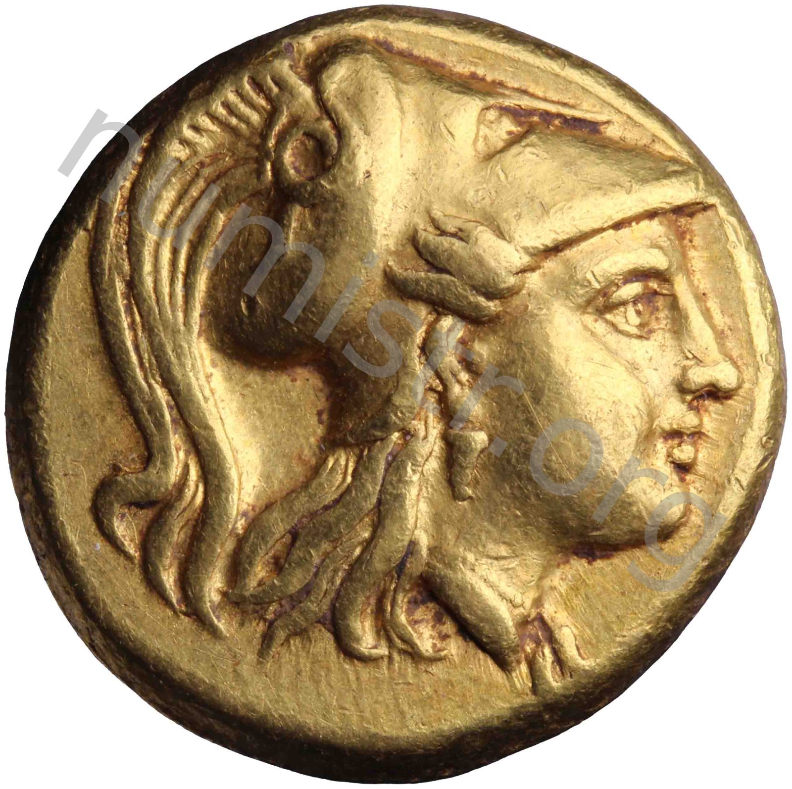 Head of Athena right wearing Corinthian helmet with crest -[en]