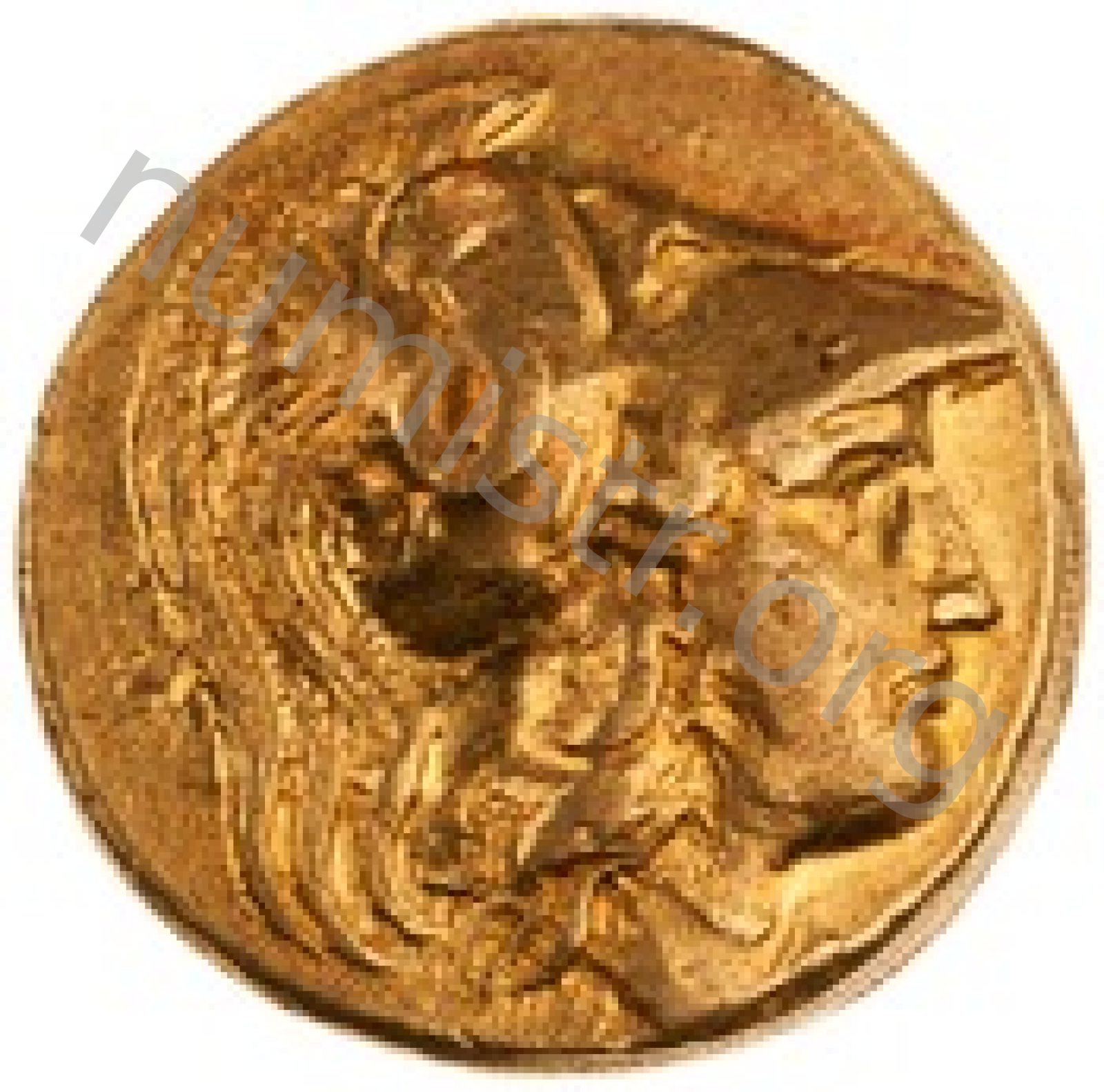 Head of Athena right wearing Corinthian helmet with crest -[en]